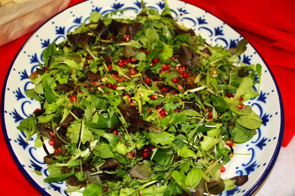 Misticanza , melograno, pinoli, uvetta. condita con una crema di balsamico olio, sale pepe