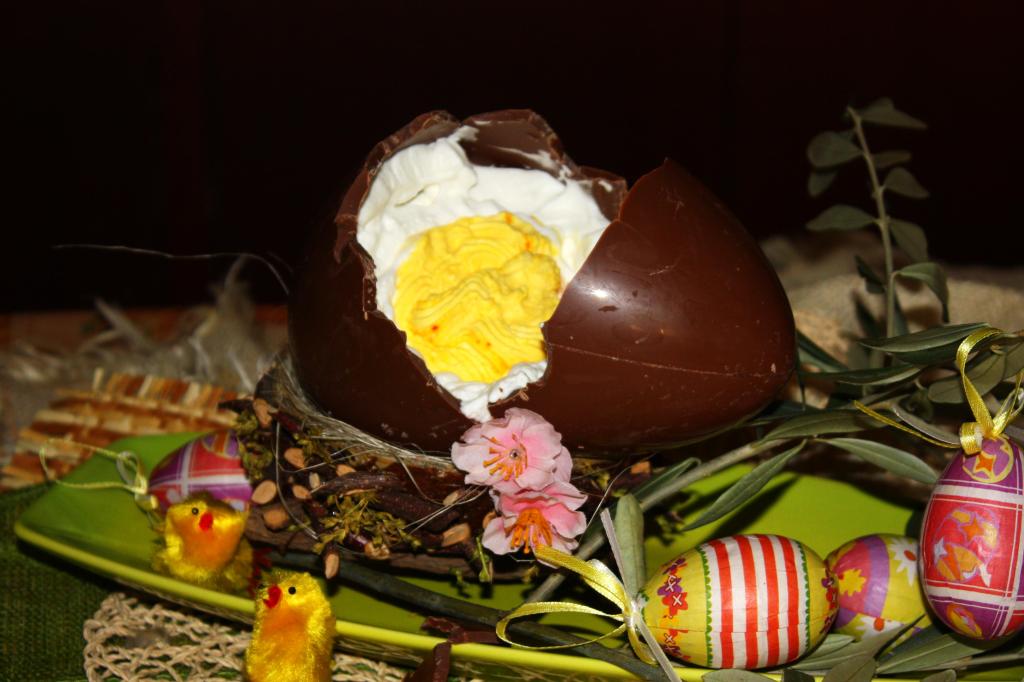 procedimento: montare la panna con metà dello zucchero a velo, montare il mascarpone con il rimanente e incorporare la panna nel mascarpone e riempire l’uovo che abbiamo aperto utilizzando in coltellino affilato.