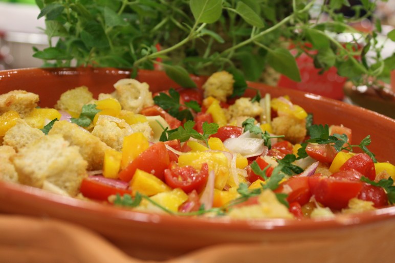 Preparazione: tagliare il pane a cubetti e metterlo in una ciotola. Pulire e tagliare le verdure : i pomodori a cubetti, i peperoni , cetrioli e per la cipolla, tagliarla a rondelle e per renderla più digeribile, una volta tagliata utilizzando un colino, metterla in acqua bollente e subito in acqua ghiacciata. Questo trucco me l’ha insegnato Paolo mio cognato, lui è un intenditore della buona cucina e frequenta cheff molto bravi così l’ho provata e in effetti la cipolla rimane croccante ma perde l’acidità risultando meno impegnativa per la digestione. Unire tutto al pane, aggiungere qualche foglia di basilico e condire con sale olio e aceto mescolando bene. Lasciare riposare per un paio d’ore prima di servire.
