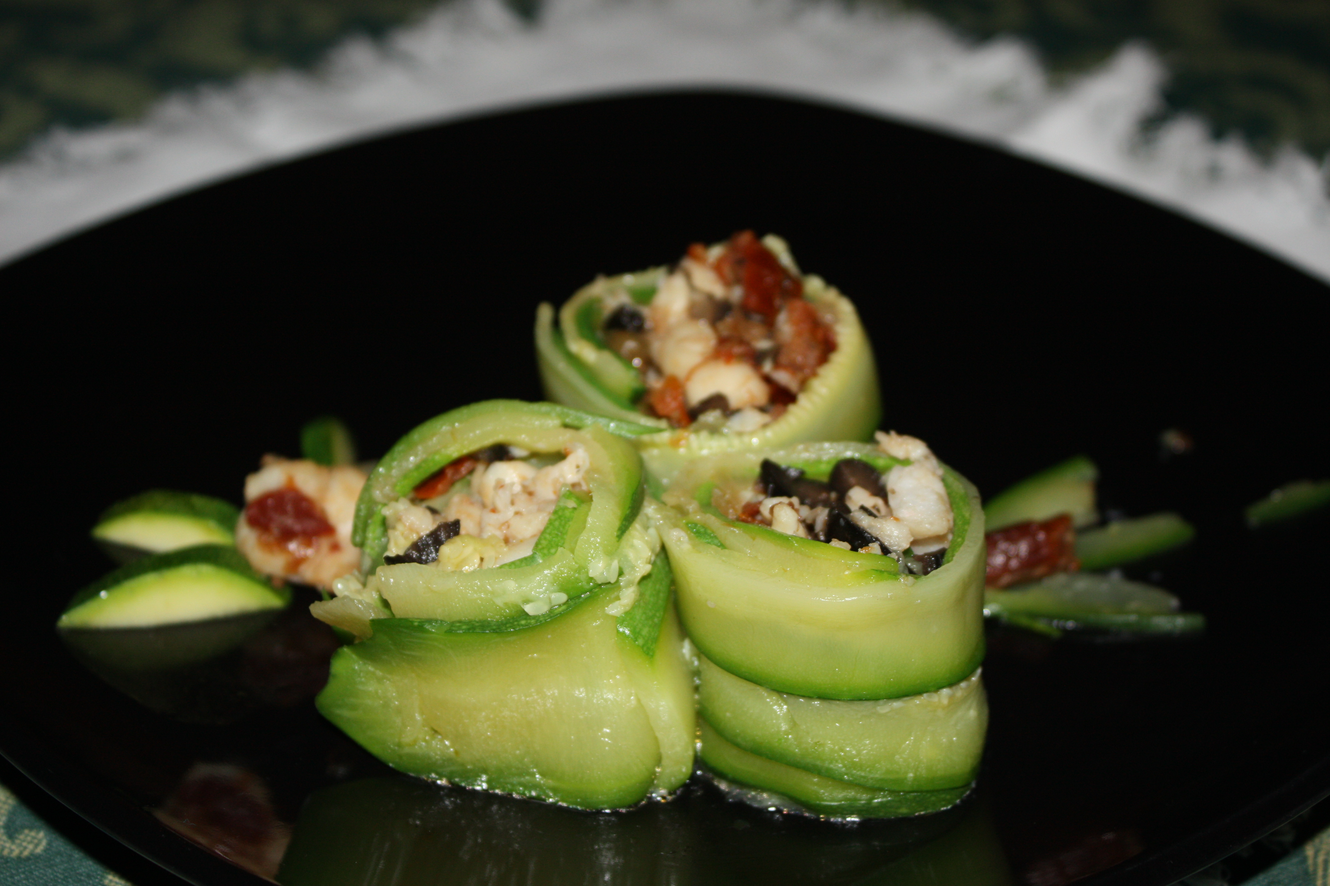 A parte in una padella, saltare con poco olio il pesce correttamente scongelato e asciugato, con i pomodorini (io ho usato anche quelli secchi), olive tritate e capperi. Per i bambini vi consiglio di sbriciolarlo un po’, salare, aromatizzare con l’origano o il timo, a cottura ultimata, distribuire il pesce sulle zucchine da una parte però perchè lo dobbiamo arrotolare su se stesso in modo da avvolgerlo bene.