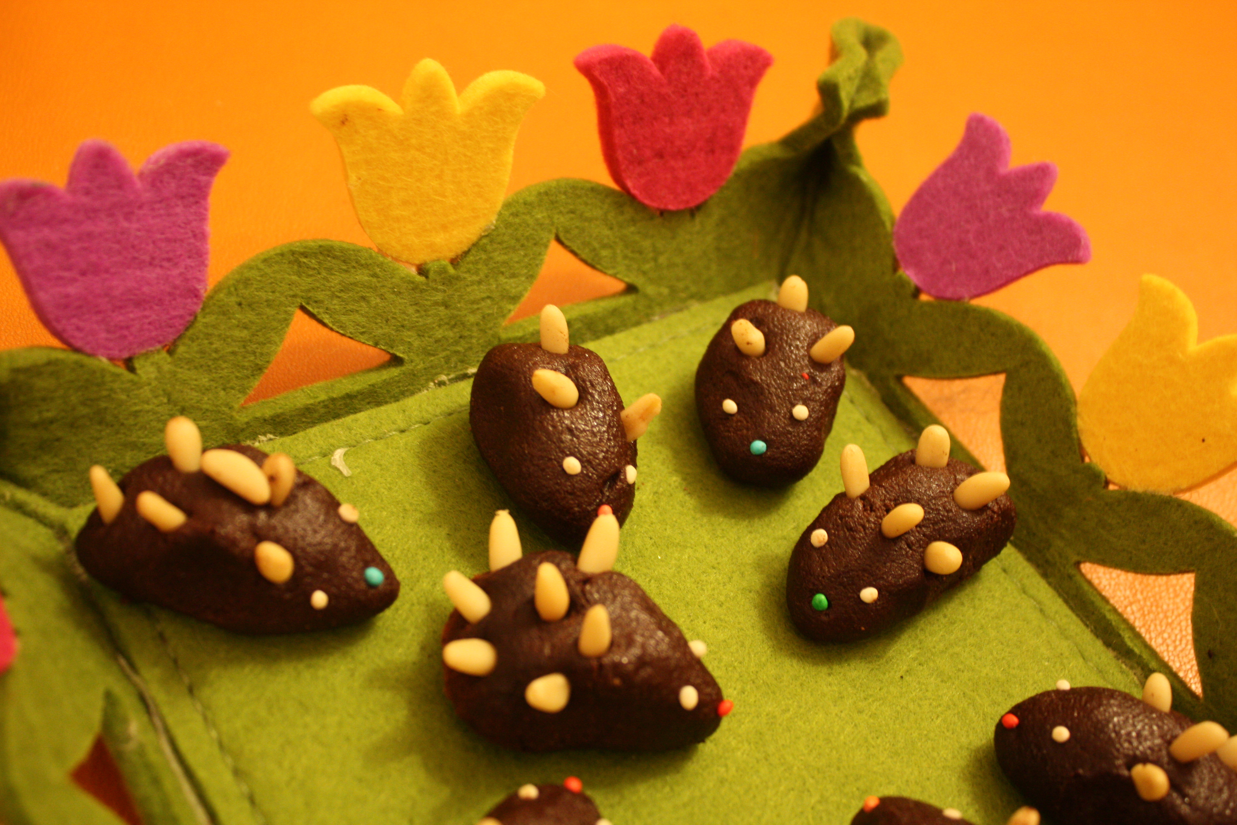 procedimento: amalgamare al burro i tuorli con lo zucchero e il cacao, aggiungere gradatamente i biscotti poi con le mani dare la forma del riccetto e con i pinoli e i confettini fare gli occhi e gli aculei.