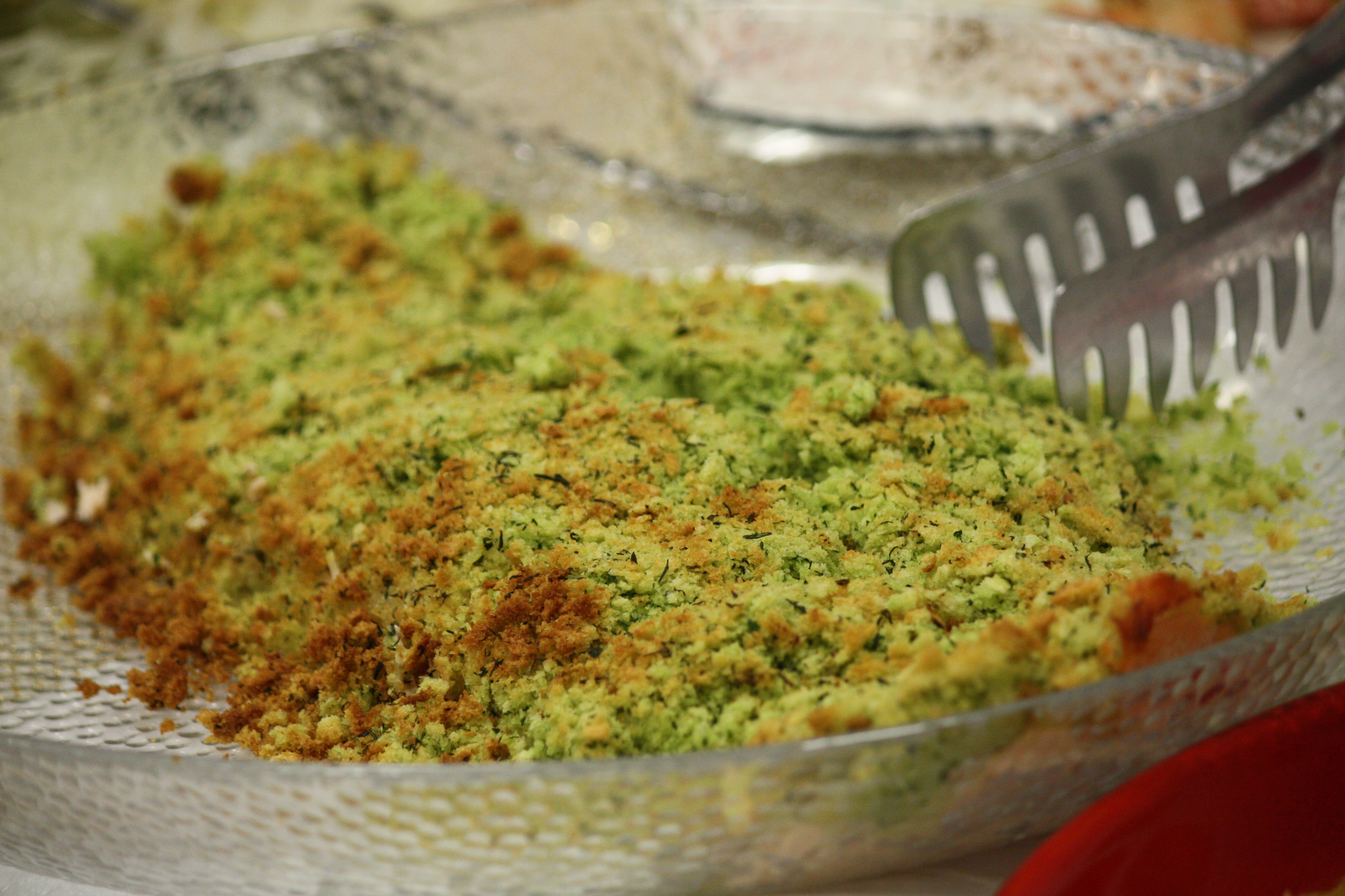 Preparazione preparare il pane: togliere la crosta, farlo a pezzettini con il coltello, metterlo nel cuttero frullatore con le erbe aromatiche cheavrete precedentemente pulitofrullate tutto insieme (ma non troppo)e infine condire con olio e sale. A piacere ci sta bene anche la buccia di un limone grattugiato.