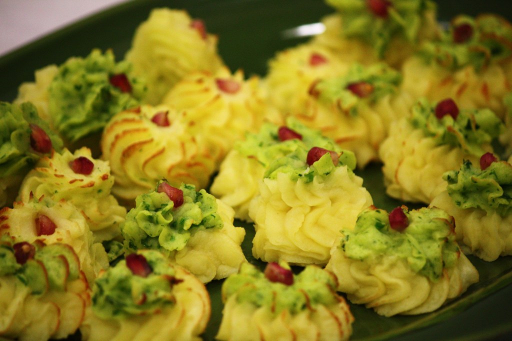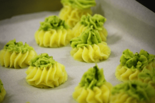 Mettere i 2 composti in 2 sacche a poche con bocchetta stellata e  fare dei ciuffi sovrapponendo i colori decorandoli in fine con un chicco di melograno. Cuocere in forno a 180° per 15 minuti.
