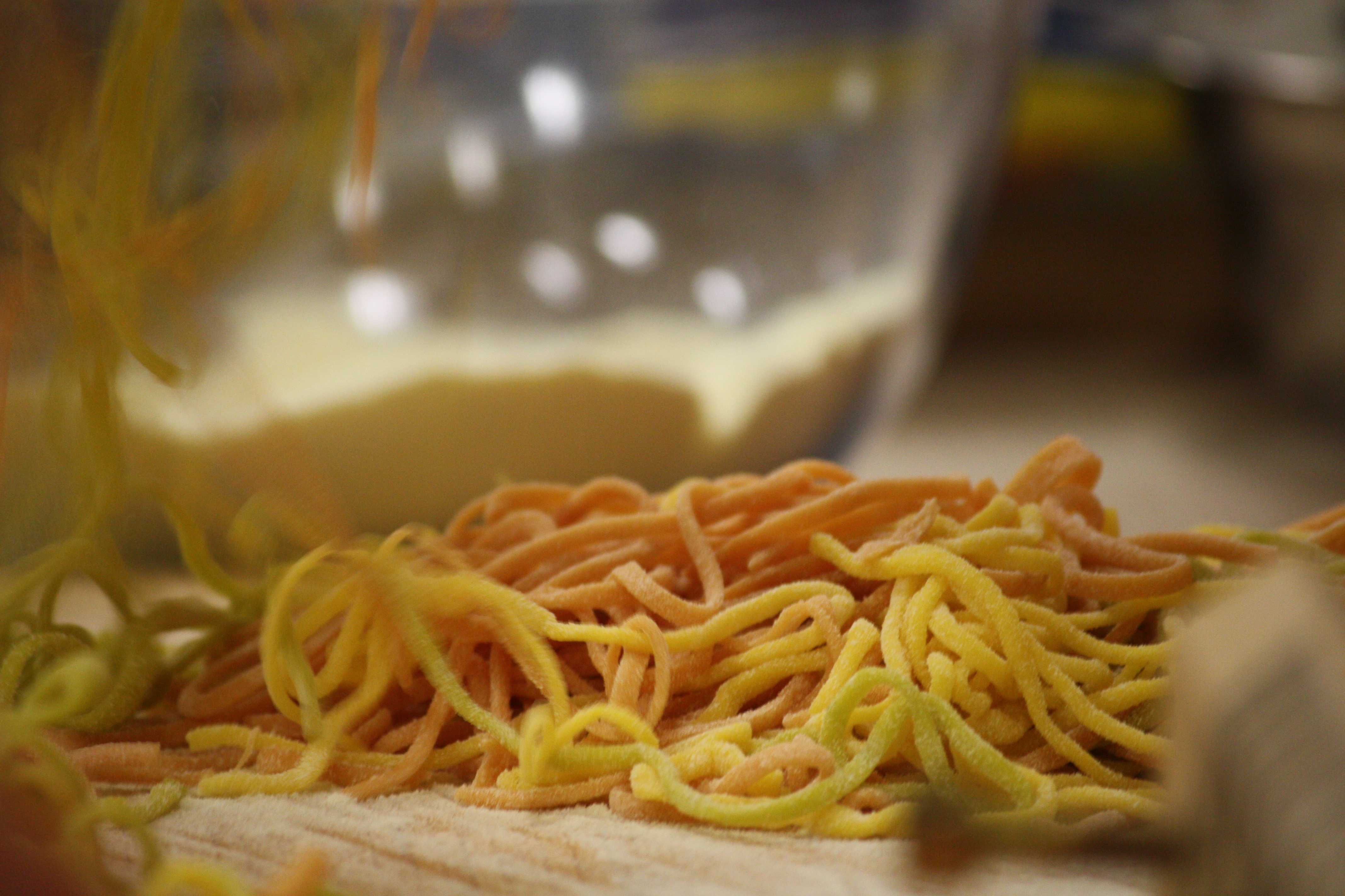 Procedimento: impastare separatamente a lungo la farina con le uova, un pizzico di sale l’olio e, se serve, un goccio d’acqua , fino ad ottenere una pasta omogenea ed elastica, che lascerete riposare per 30 minuti in frigo avvolta in un foglio di pellicola trasparente. Per la pasta verde, frullare con il minipimer l’uovo con gli spinaci CRUDI e puliti.