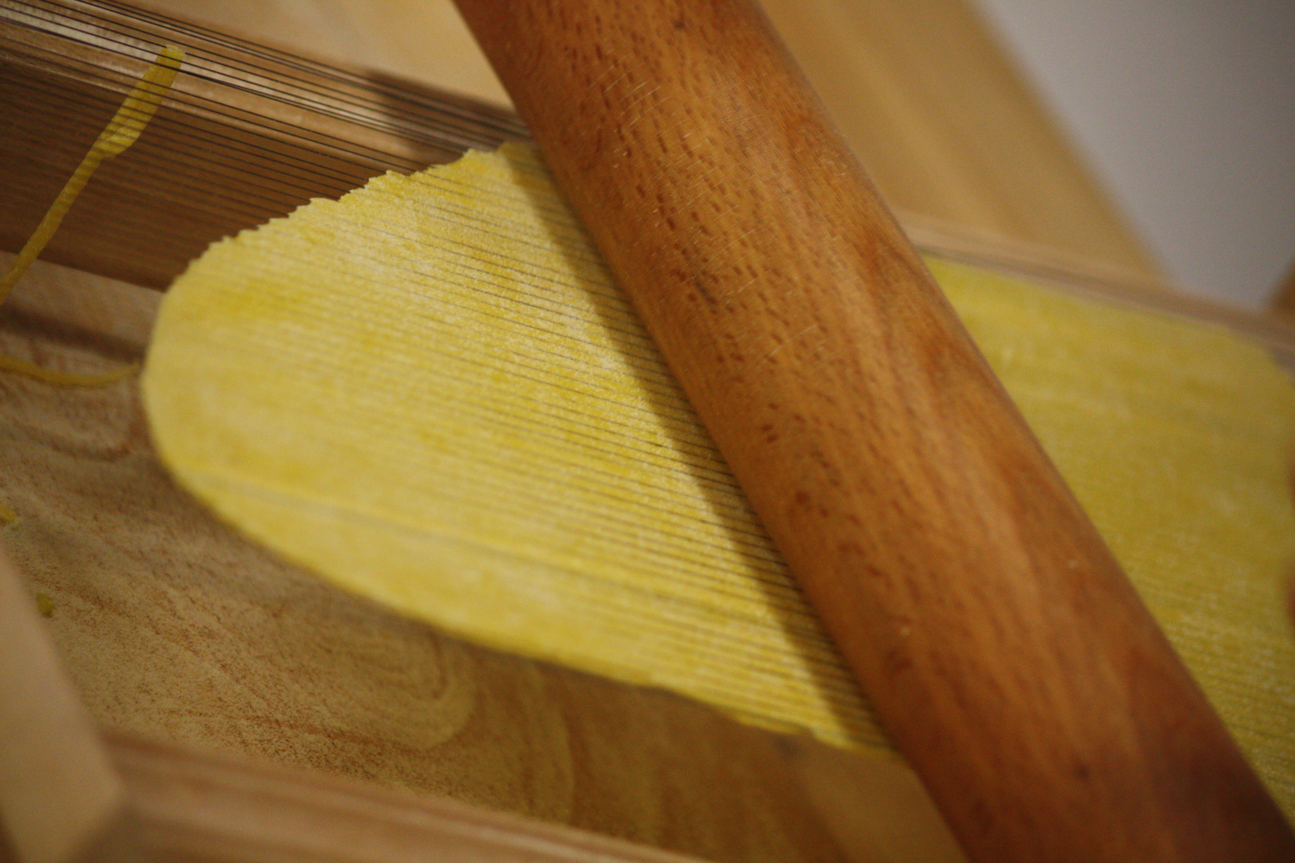 Tirare la pasta sottile, con l’apposita macchina o con il mattarello, poi tagliarla o con l’apposito attrezzo o con il coltello in sottili tagliolini.