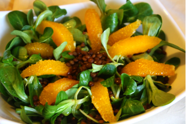 INGREDIENTI: valeriana 200 gr, lenticchie 100 gr, un arancio tagliato a vivo…condita con un po’ di olio e sale.