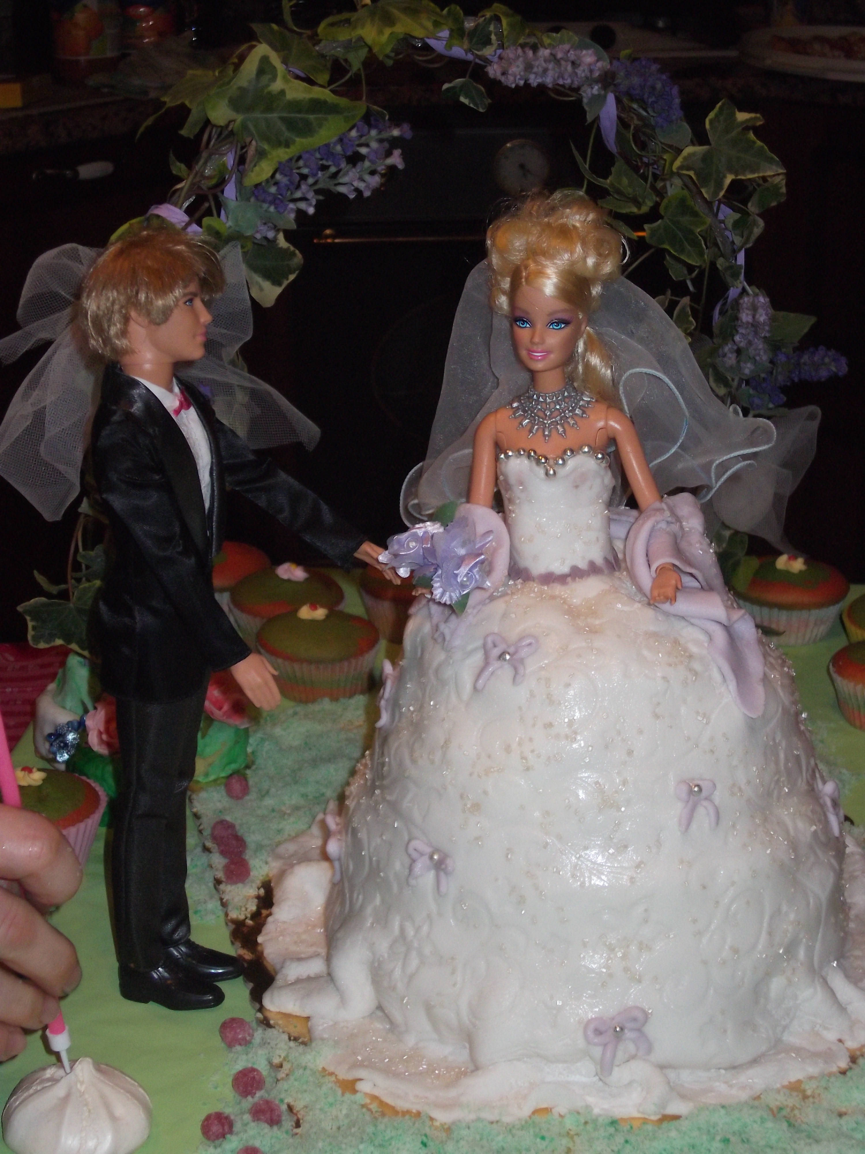 ASSEMBLAGGIO VESTITO: ricavare dalla torta 2 dischi del diametro 20 e 18 cm e ritagliare degli strati sottili 5 mm circa. prendere un vassoio senza bordi ed incominciare a sovrapporre gli strati umidificandoli con la bagna e farcendoli con la mouss di ricotta naturalmente si parte con i dischi più grandi e si procede con quelli più piccoli. Quando si arriva all’altezza di 15 cm si prende la Barbi , avvolta stretta nella pellicola per alimenti, e si infila al centro della torta, poi si procede con spicchi di torta e farcia fino ad arrivare alla vita ( seguendo il corpo e non più con i cerchi in modo da dare un appoggio al fondente). Mettere in frigo la torta per far in modo di compattarla almeno mezz’ora.