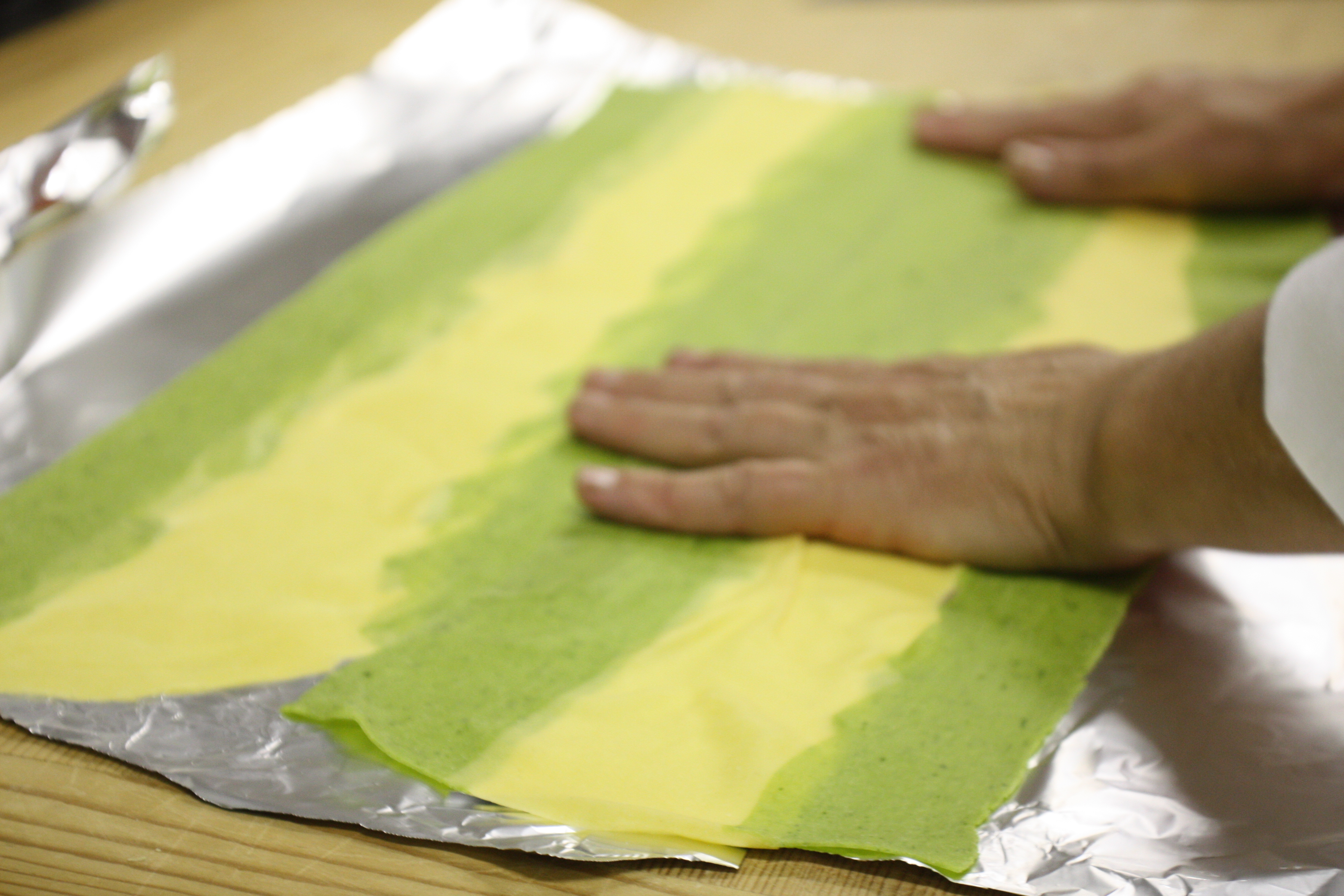 Per far la pasta: frullare con un minipimer un uovo con i 30 gr di spinacini ed impastare 100 gr di farina; con l’altro uovo impastare i rimanenti 100 gr di farina aggiungendo un pizzico di sale e un cucchiaino di olio e, se serve, un goccio d’acqua , fino ad ottenere due pastelle una verde e una gialla omogenee ed elastiche ,che lascerete riposare per 30 minuti in frigo avvolte in un foglio di pellicola trasparente.