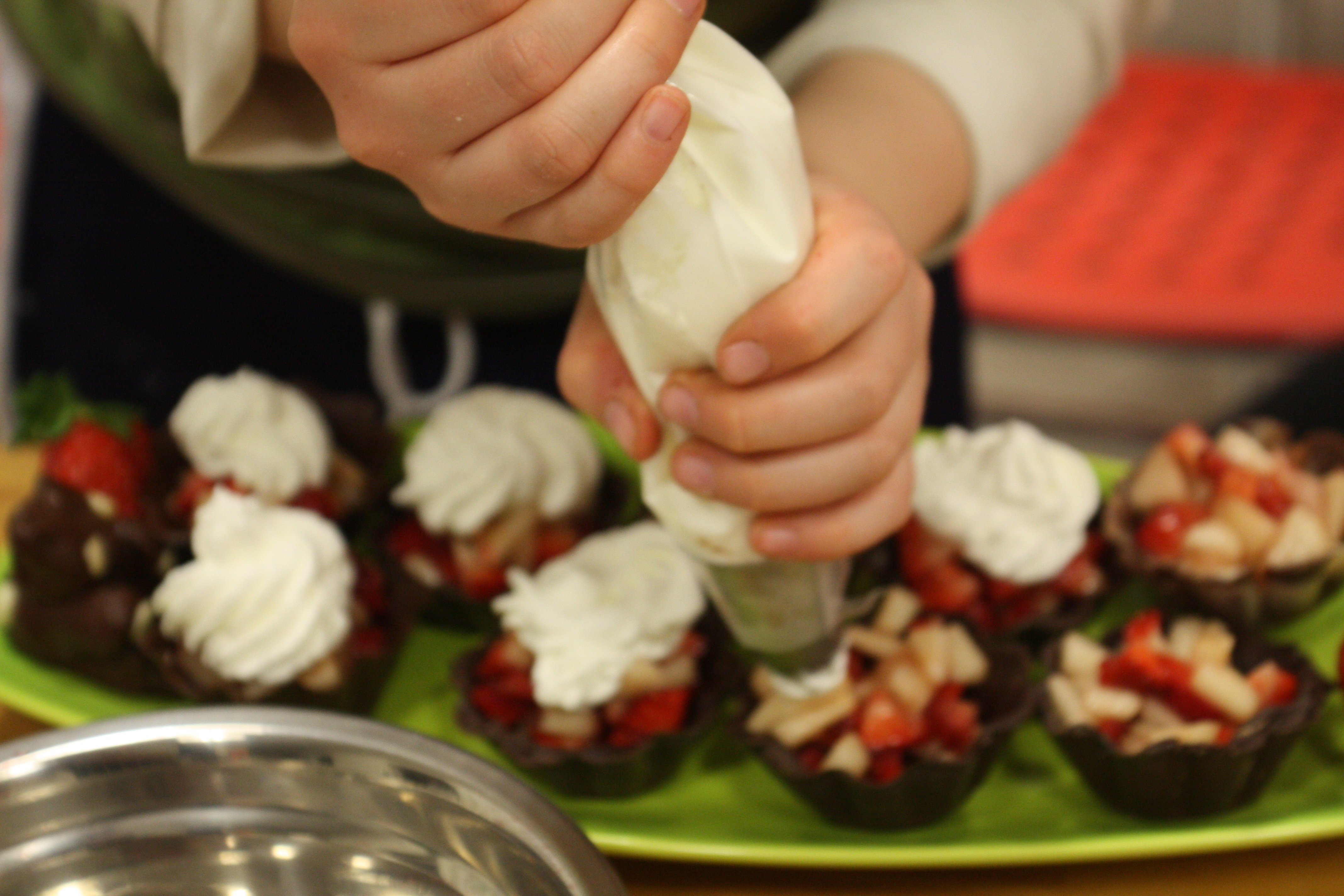 Riempire i cestini con la frutta e decorarli con panna montata.