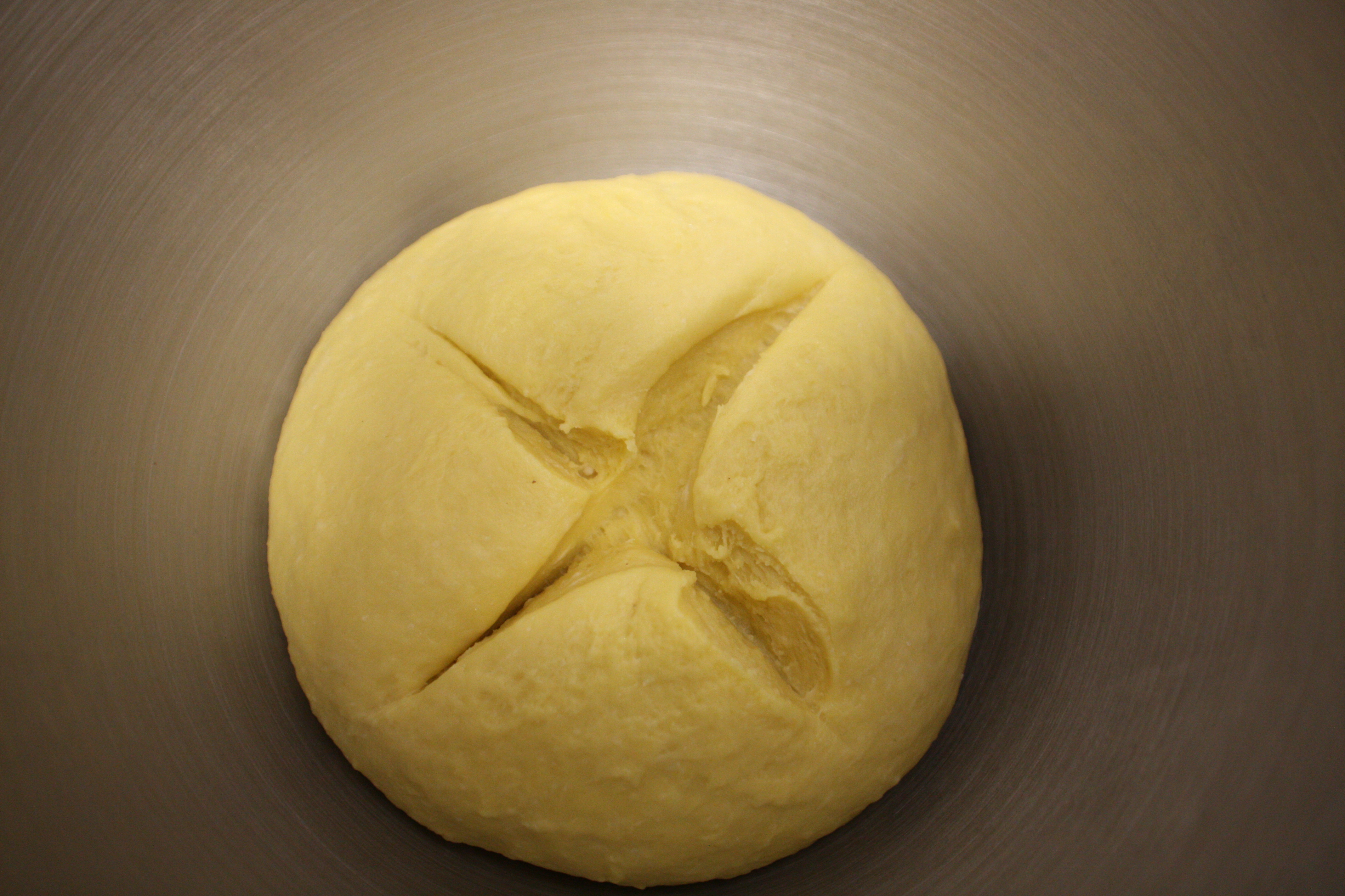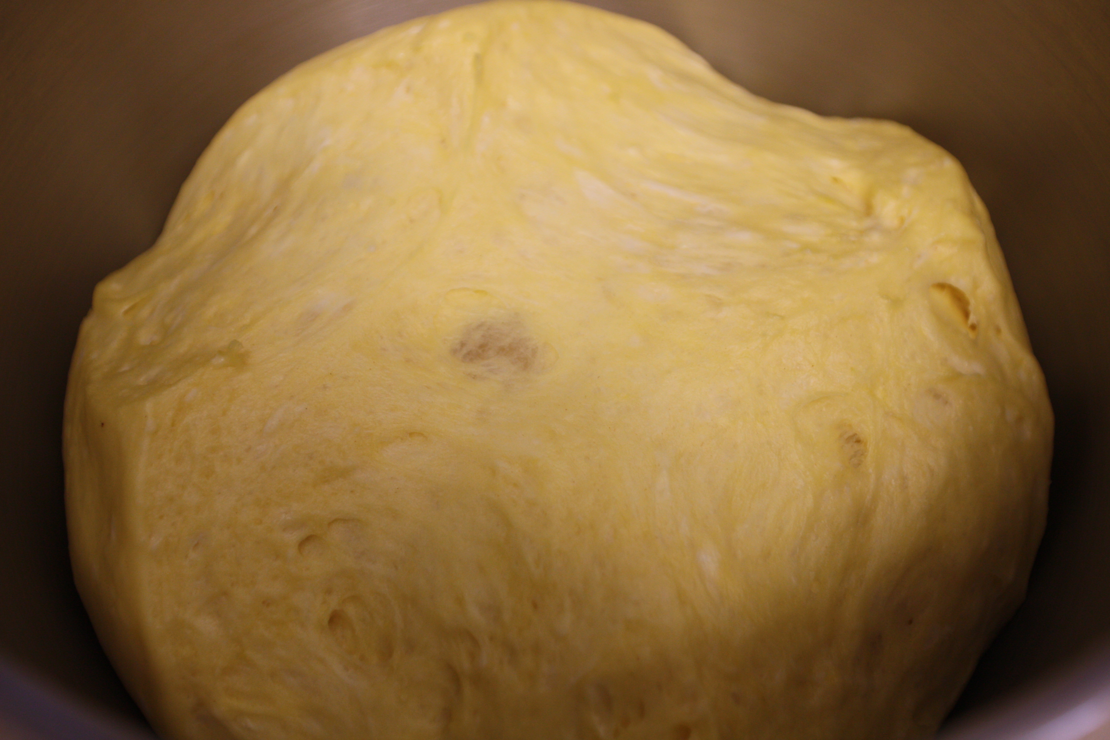 Versare la farina nella ciotola della planetaria. Sciogliere lo zucchero  e il lievito di birra  nel latte tiepido e aggiungere il tutto alla farina. Azionare la planetaria e quando il liquido è stato assorbito aggiungere le uova  il sale  e l’olio. Dopo una decina di minuti estrarre pasta dalla planetaria e lavorarla a mano per qualche minuto.