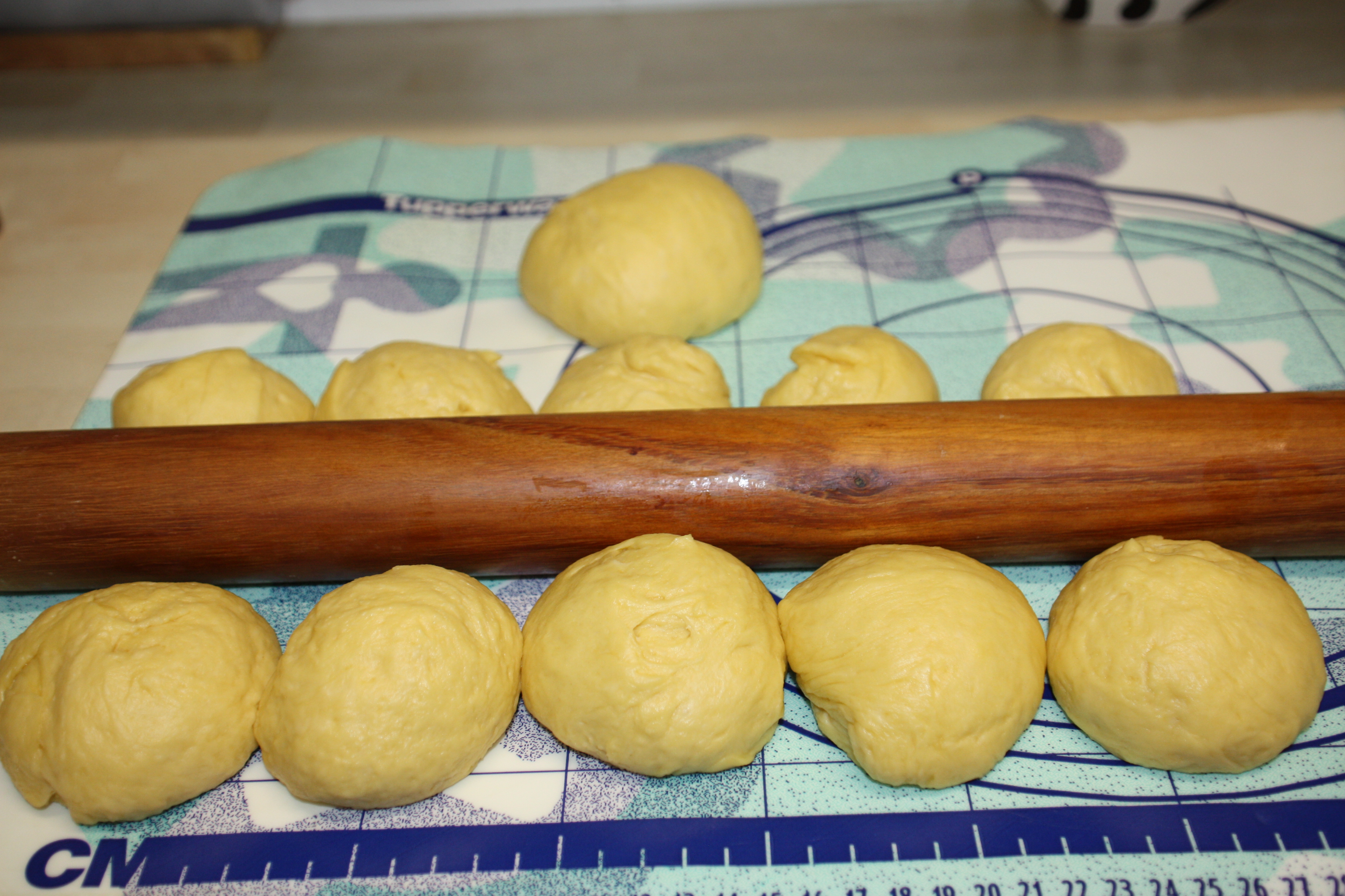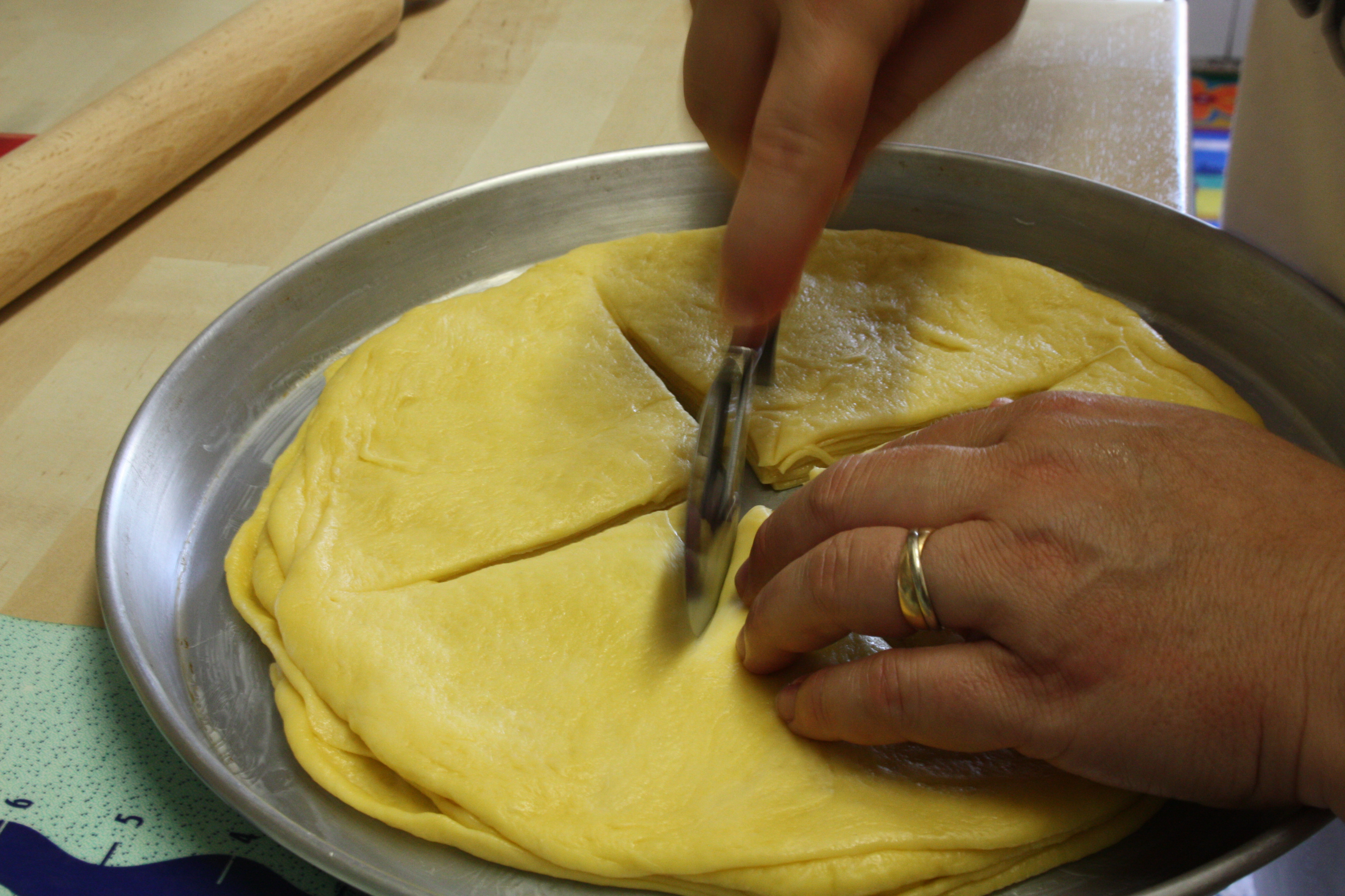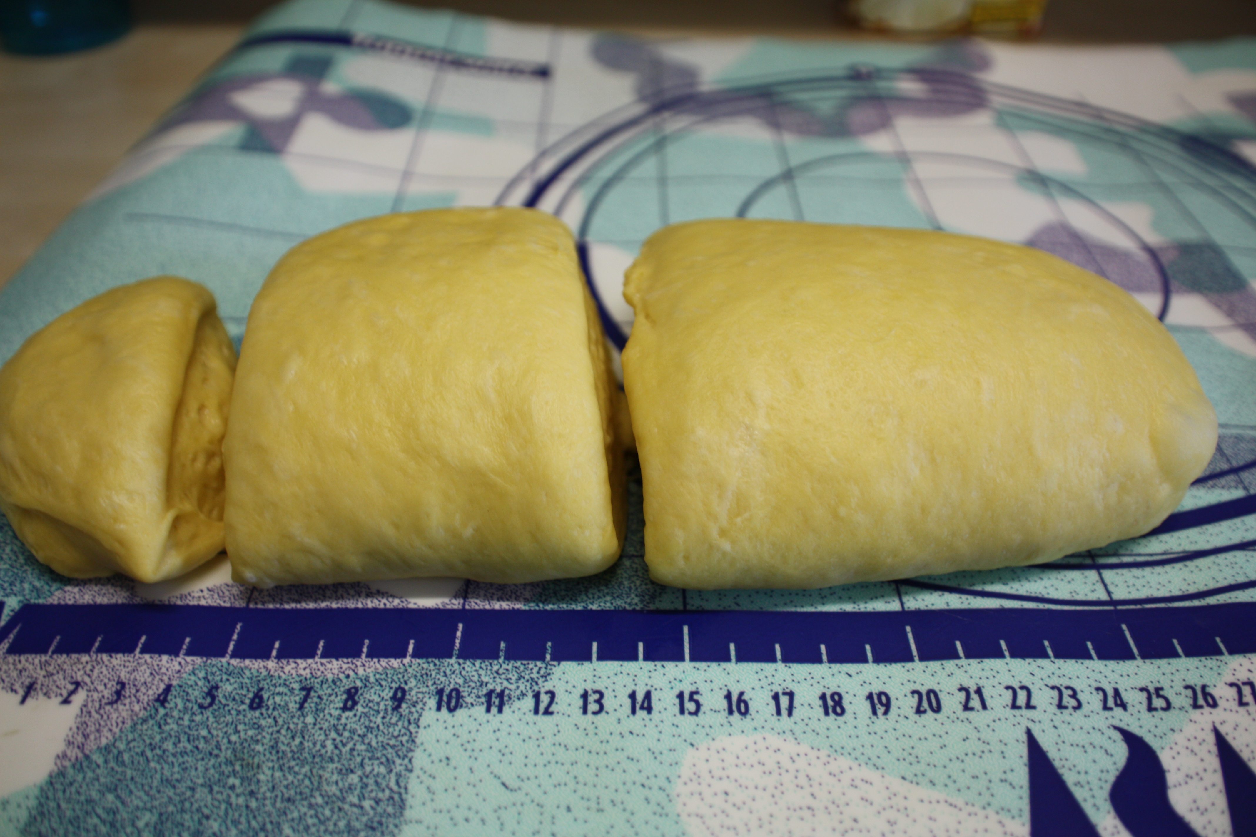 Sgonfiare la pasta e dargli la forma di una pagnotta.Tagliarla a metà e da una metà taglieremo l’estremità così ricavando così tre pezzi: grande, medio, piccolo.