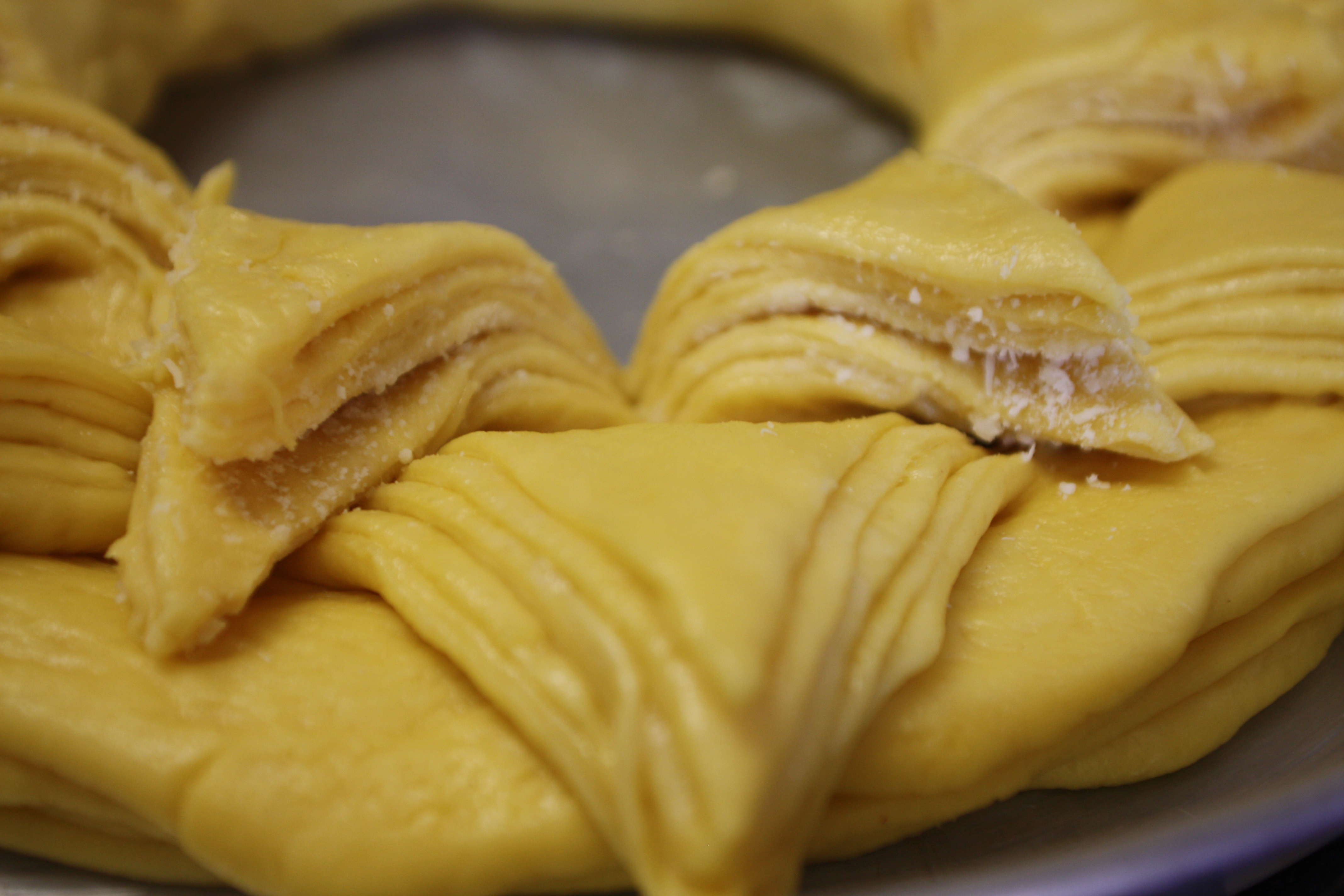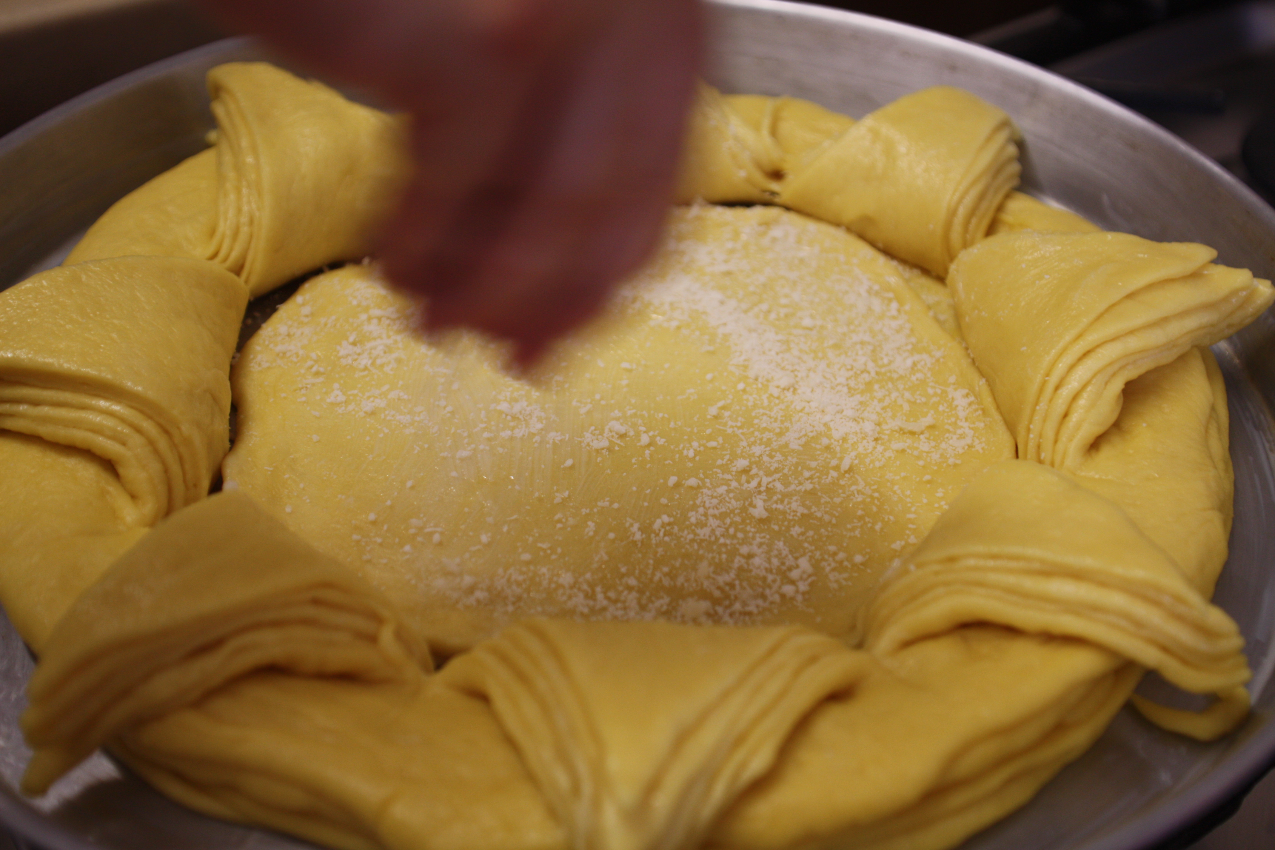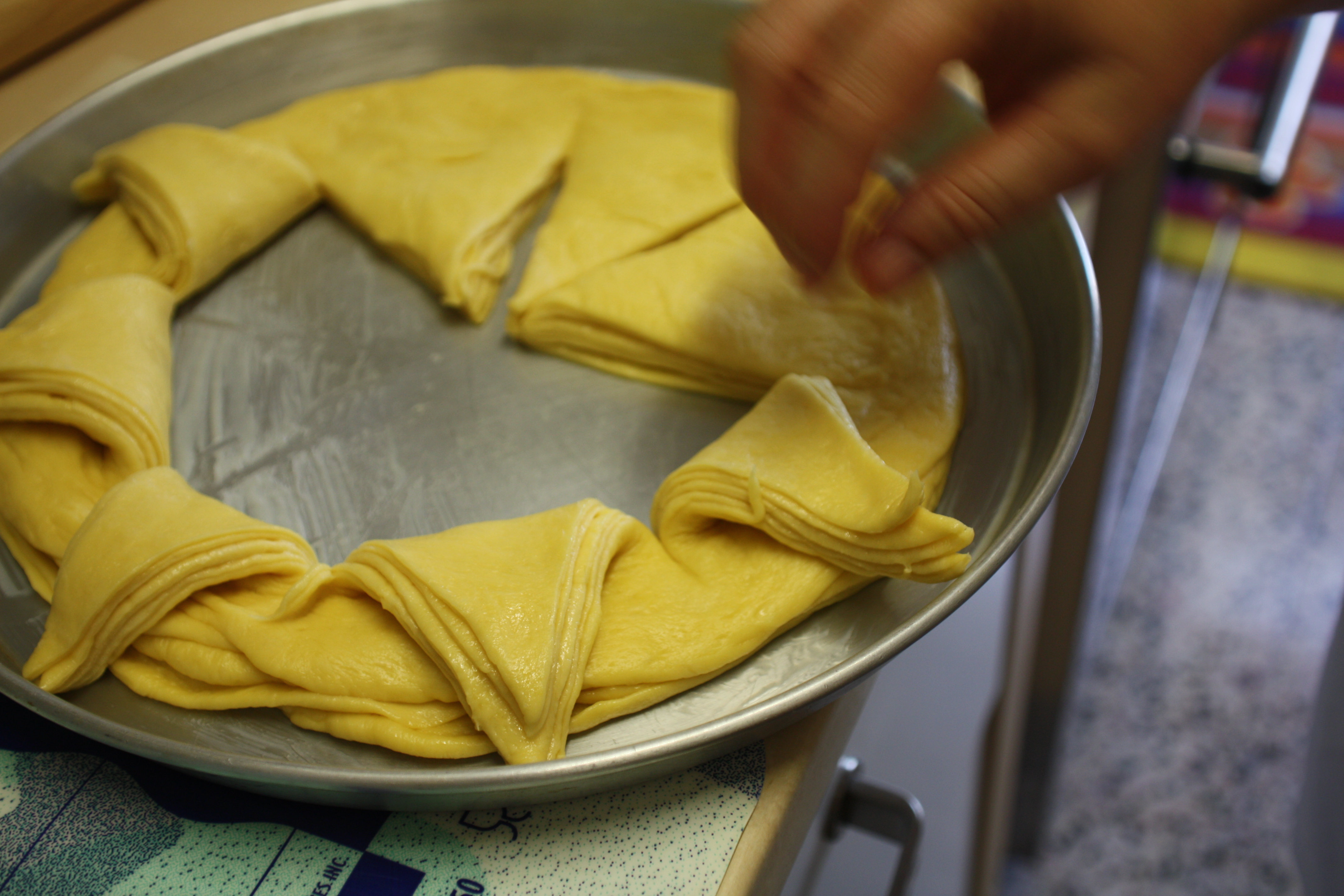 Sgonfiare la pasta e dargli la forma di una pagnotta.Tagliarla a metà e da una metà taglieremo l’estremità così ricavando così tre pezzi: grande, medio, piccolo.