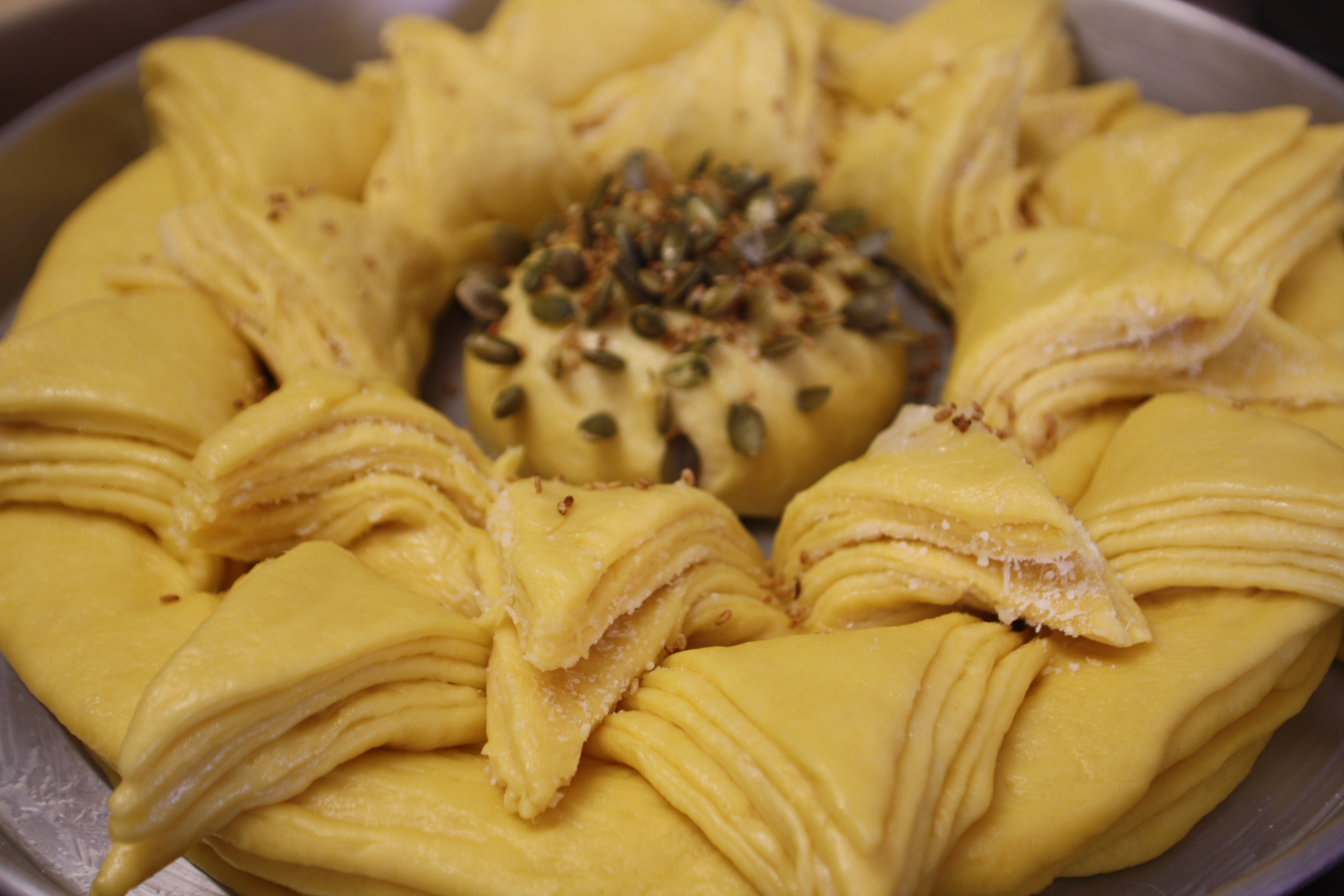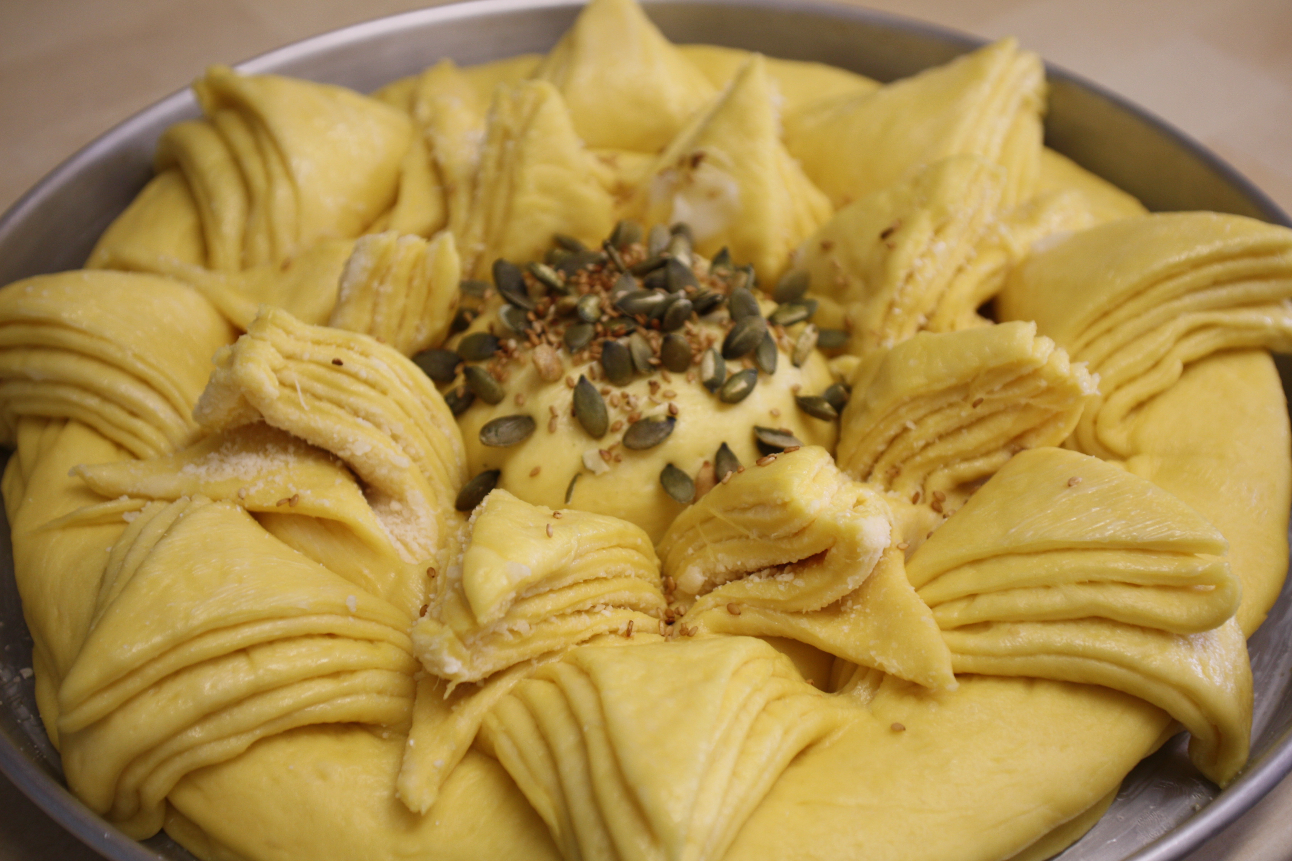 Con il pezzo piccolino formare una palla e sistemarla nel foro poi pennellare con lo strutto e cospargere i semi di sesamo e zucca come desiderate.