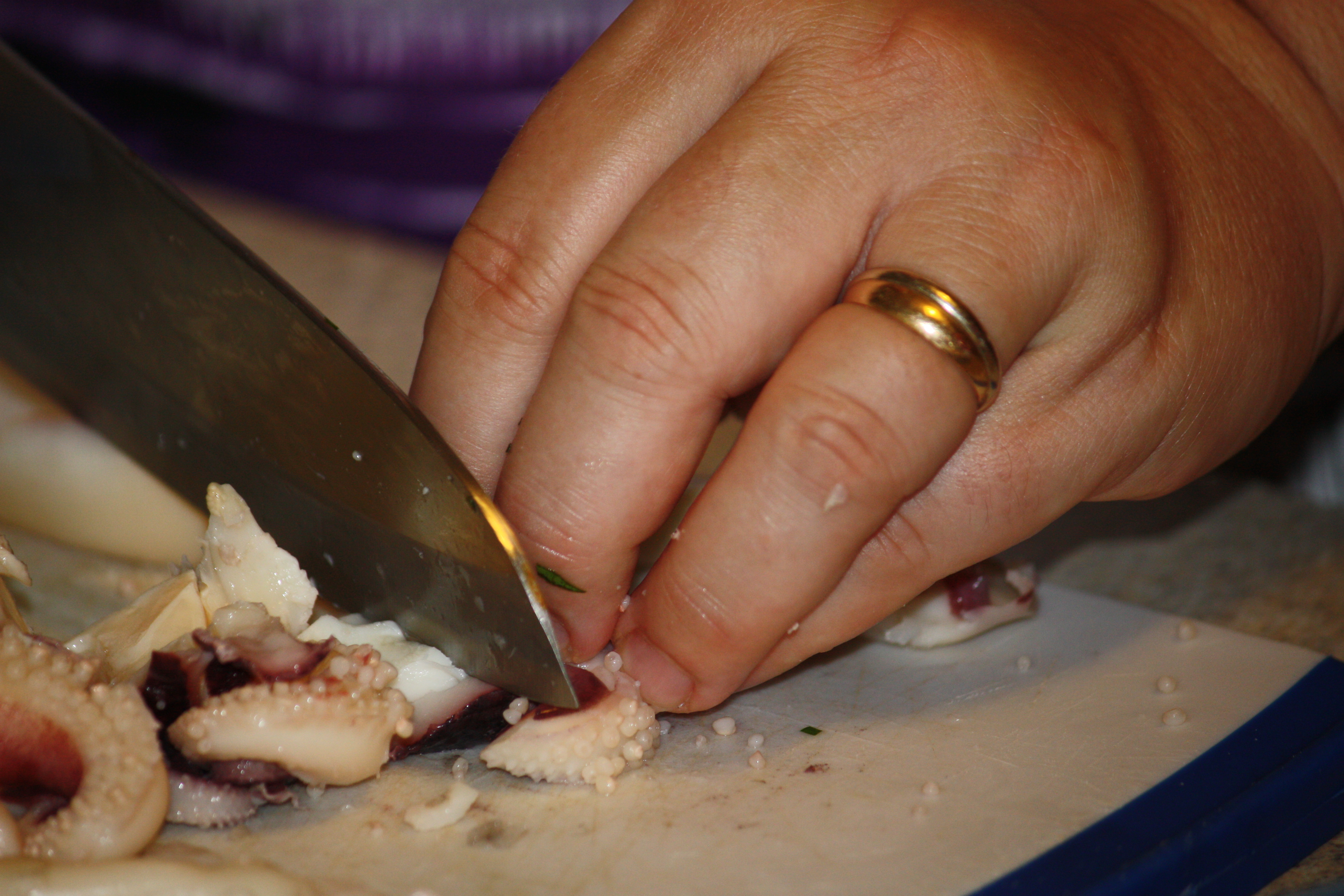 Per farla..Paolo ogni mercoledì al mattino presto va dal pescivendolo …che gli tiene già una bella seppiolona.. circa un chilo poi, in pausa pranzo pranzo, la mette in pentola a pressione con lo scalogno e i grani di pepe per 13 minuti… spegne e la lascia raffreddare nella sua acqua con la pentola chiusa.