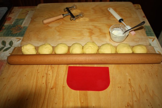 Stendere con un mattarello dandogli per quanto possibile una forma rettangolare. Lo spessore deve essere di 5 mm. circa e lasciarla riposare 5 minuti in modo che non faccia l’effetto “elastico”