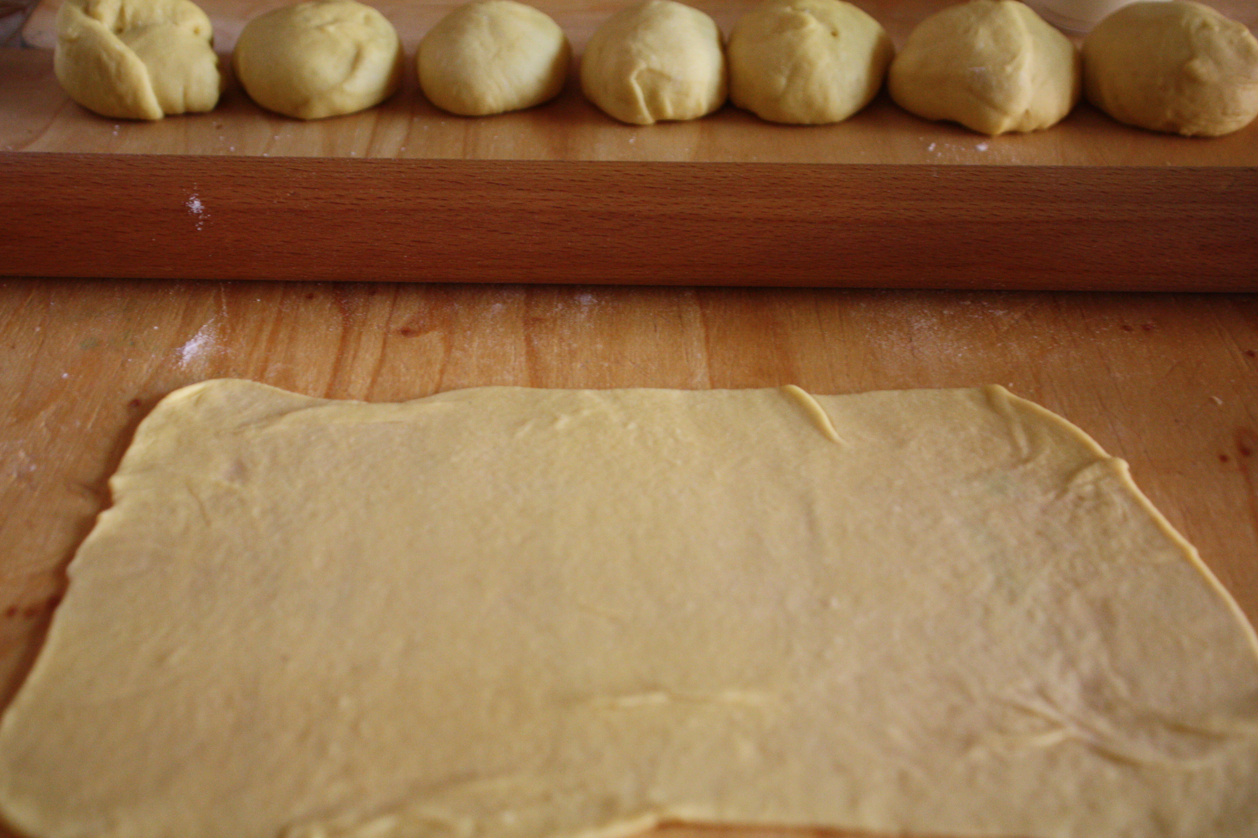 Sciogliere il lievito e un cucchiaino di zucchero nel latte tiepido. Aggiungere al resto degli ingredienti (tranne il sale che andrà aggiunto quando il latte sarà assorbito) e impastare.