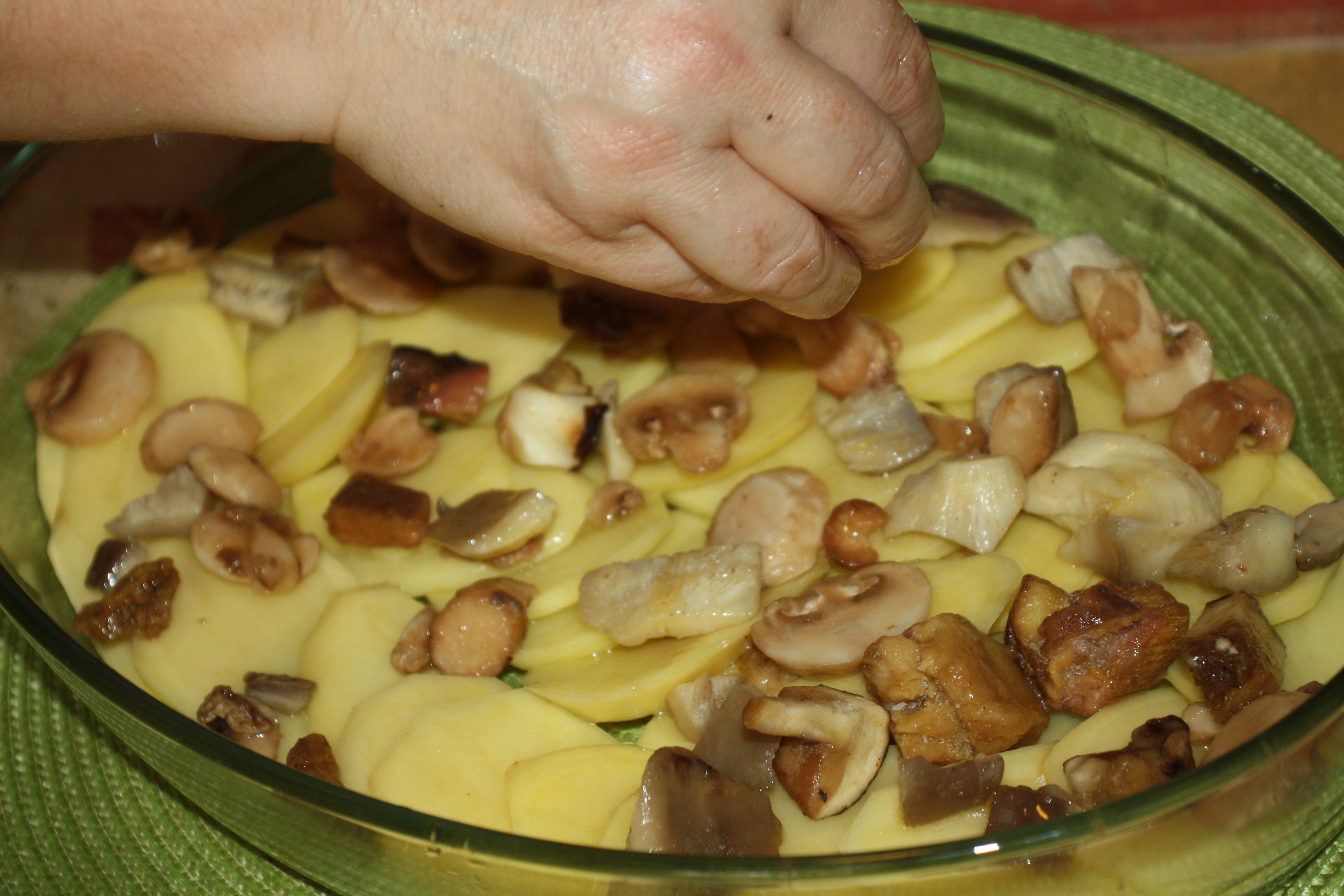 in una teglia unta con poco olio distribuire uno strato di patate condite con olio e sale