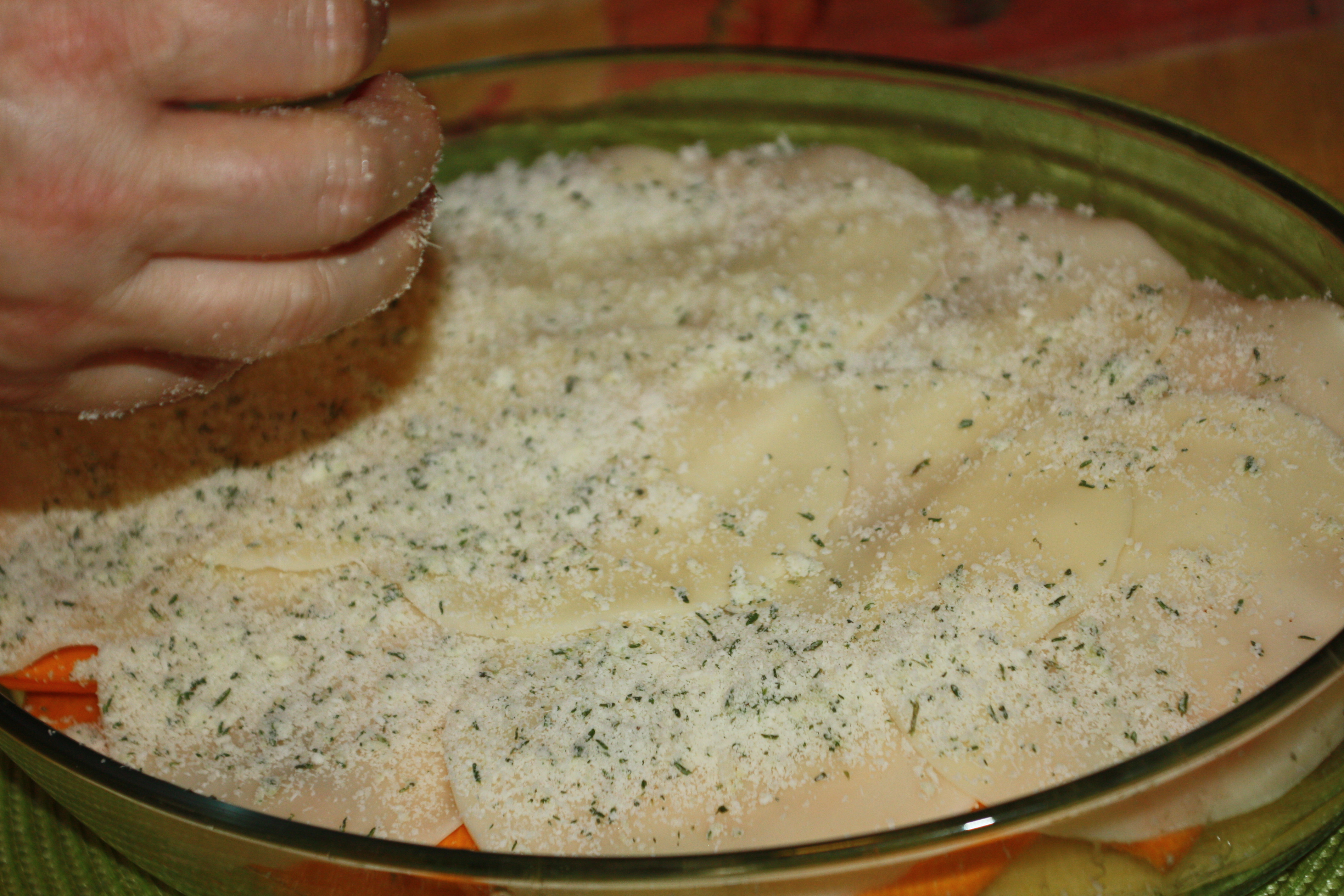 coprire con uno strato di zucca sempre condita con olio e sale e spolverizzare anche lei con il parmigiano aromatico.