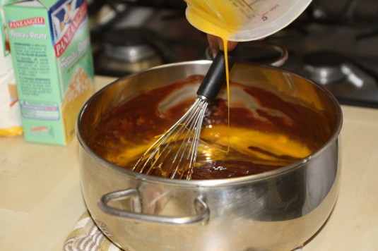Spegnere, lasciare raffreddare ed amalgamare nel pentolino  le 4 uova