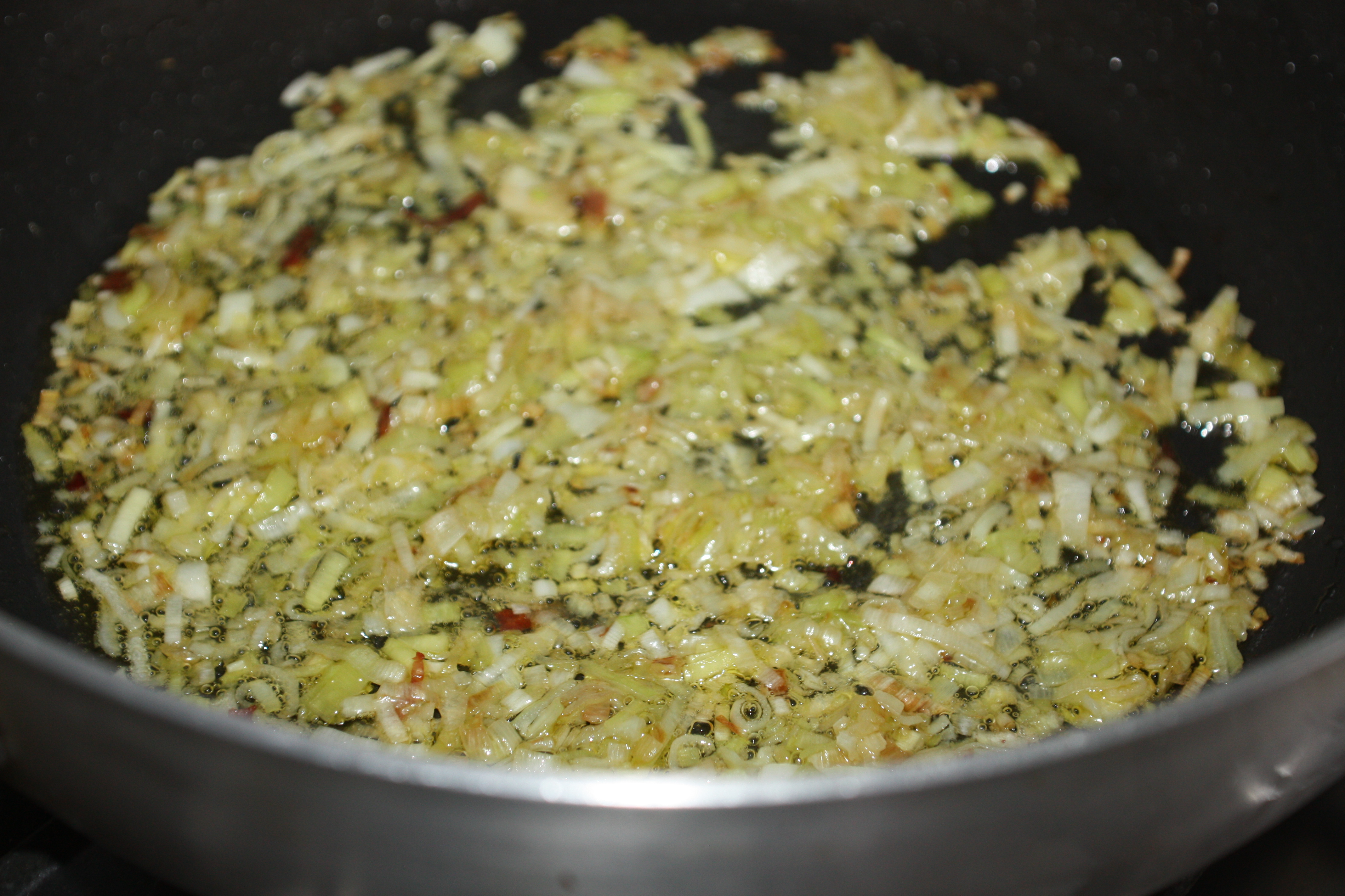 tagliare il porro a striscioline sottili e saltarlo nella stessa padella con olio  rimasto