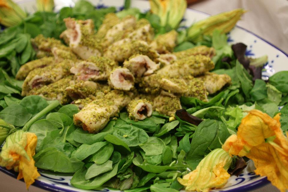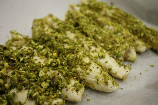 Toglierli dal fuoco, lasciarli intiepidire e arrotolarli nella granella di pistacchio.