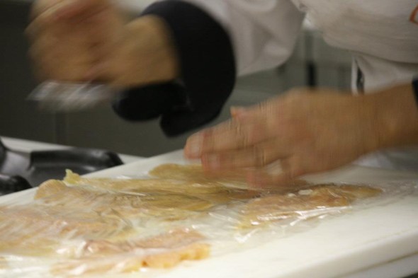 ….ricavare dal petto di pollo tante fettine sottili e  batterle con il batticarne ……