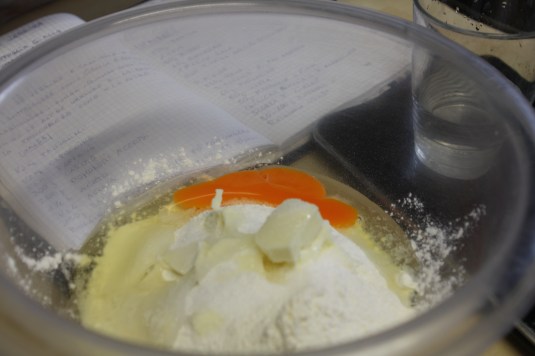 farina 250 gr, uovo n°1, burro 50 gr, zucchero 20 gr,  un pizzico di sale, acqua tiepida 1/2 bicchiere.