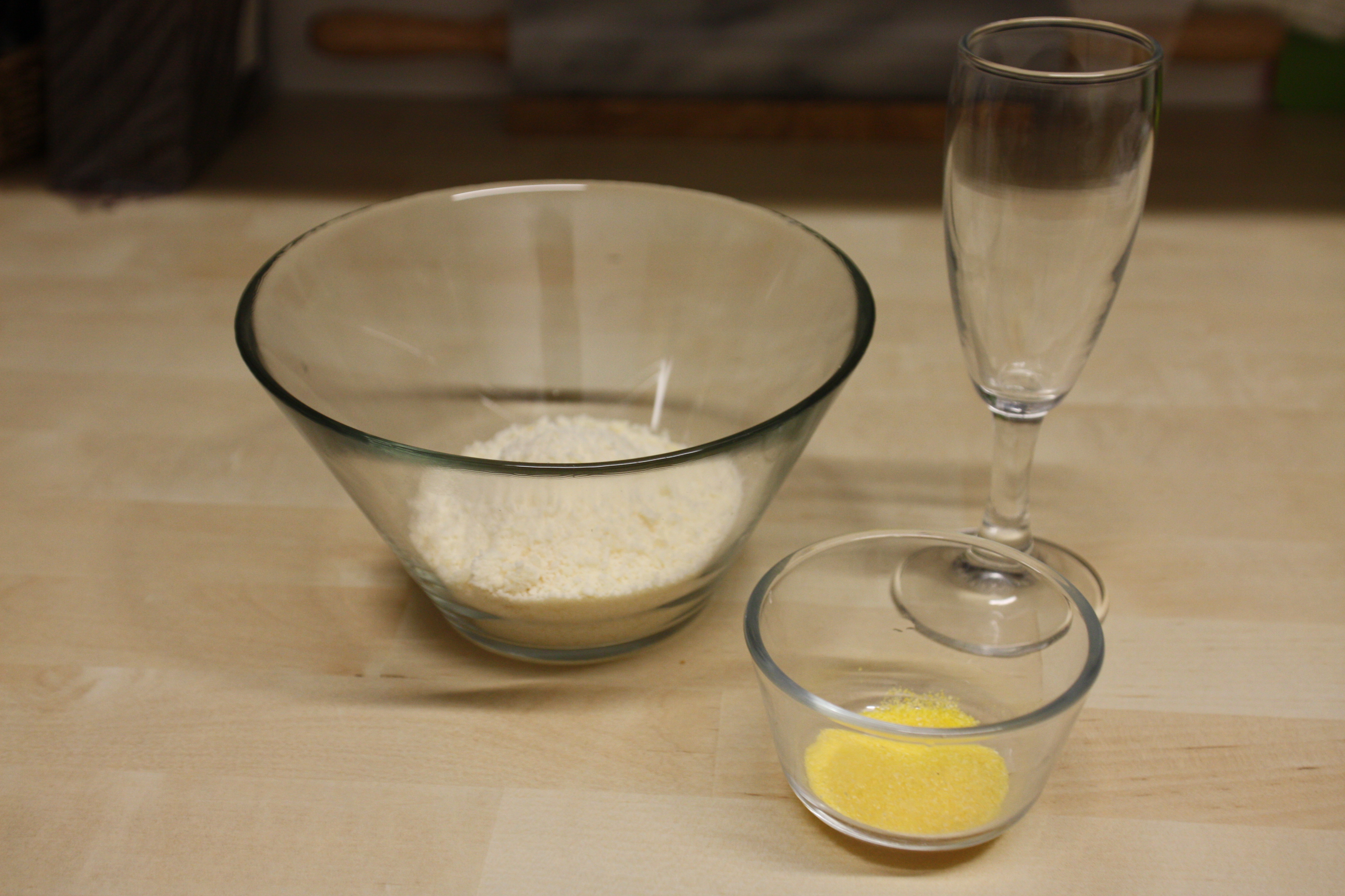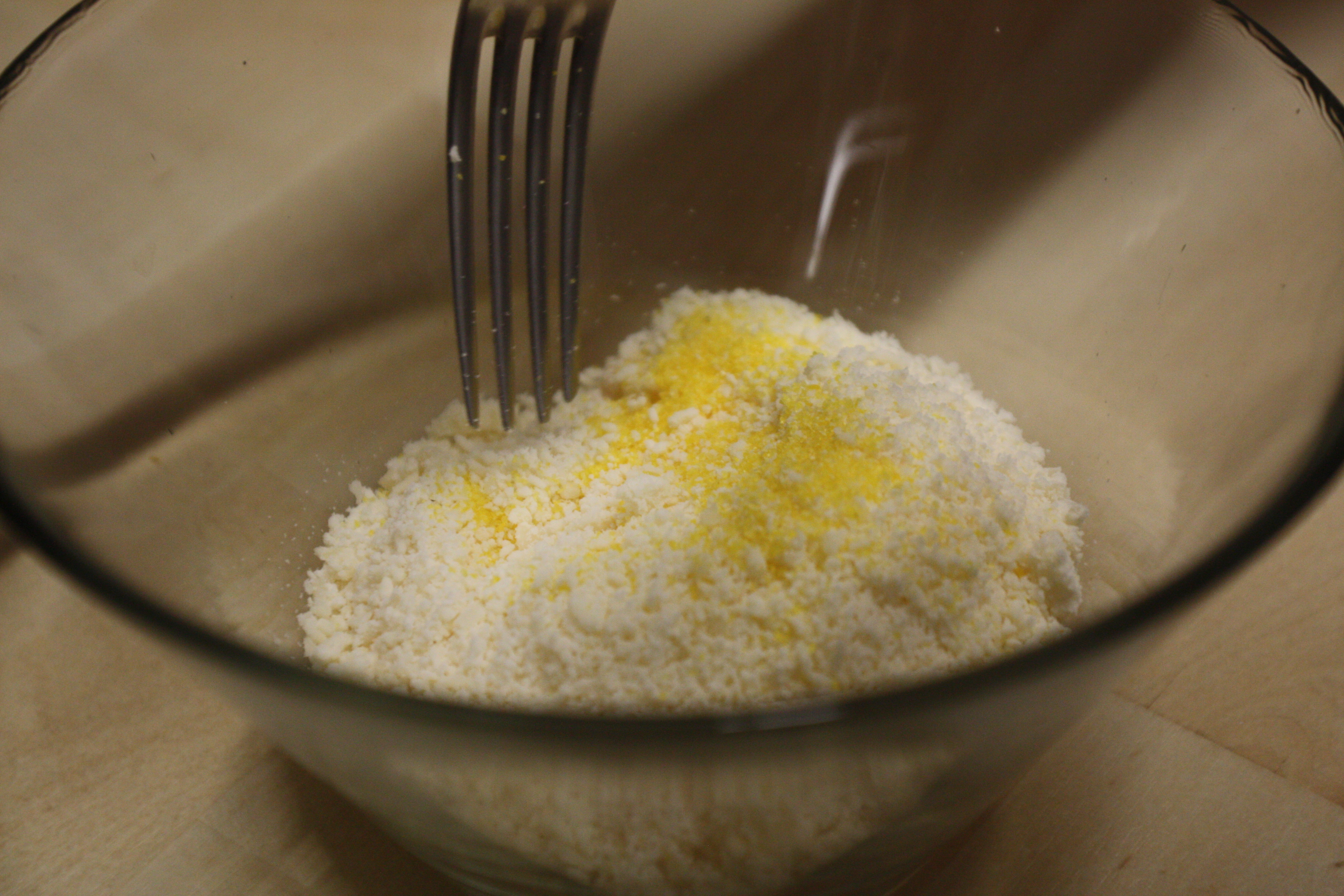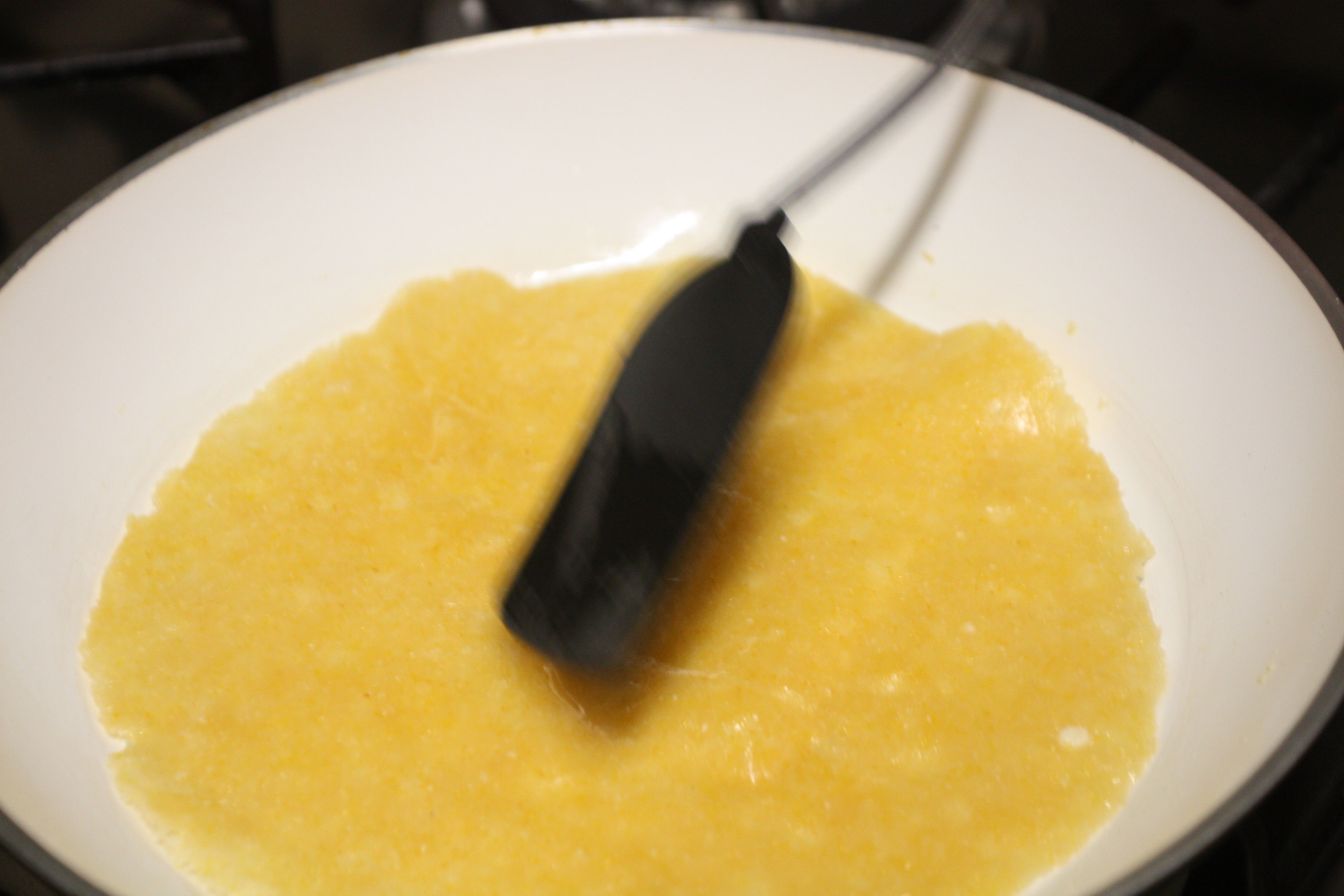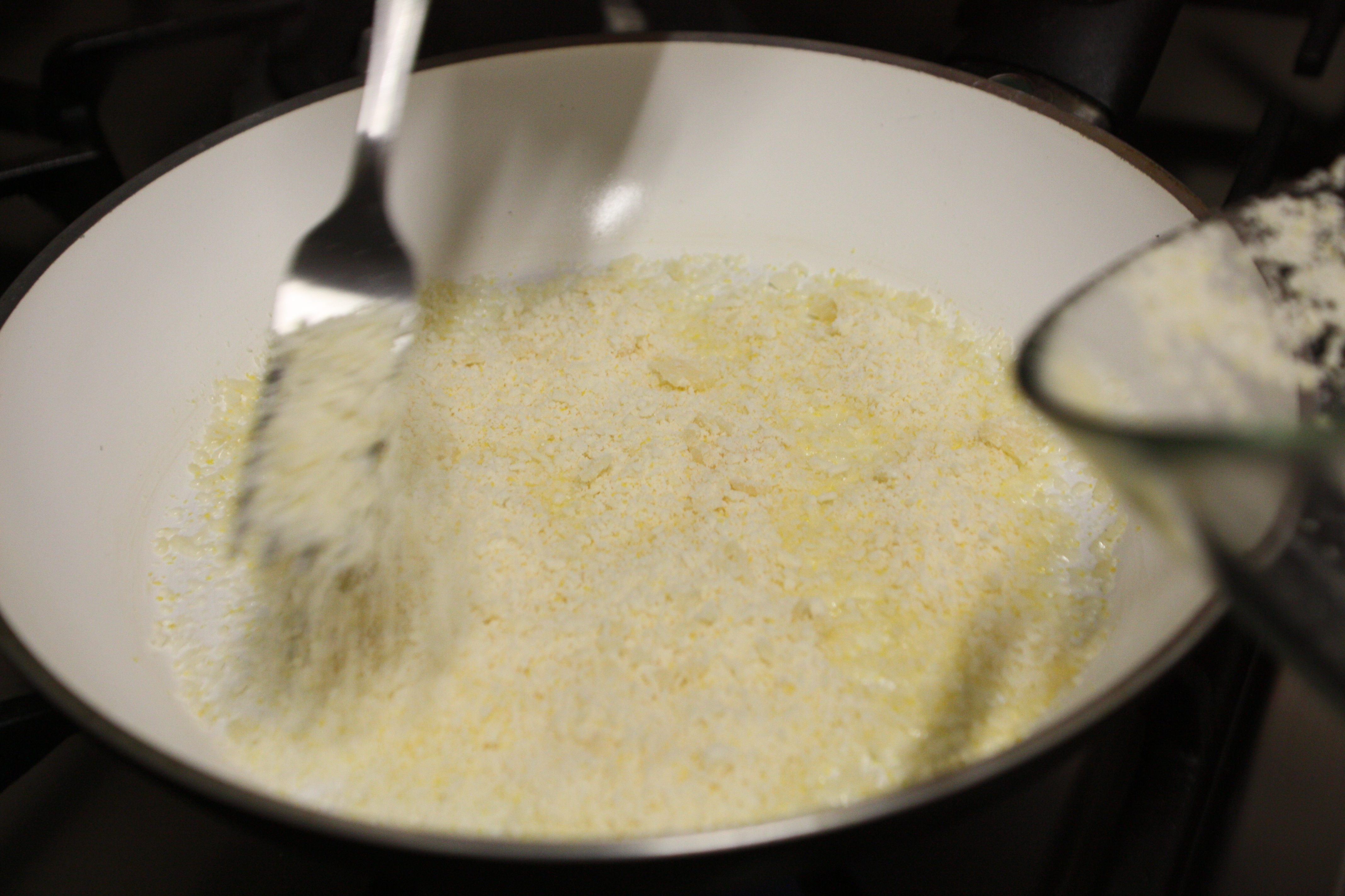 scaldare la padellina, allontanarla dal fuoco e spargere con una forchetta il composto di formaggio e farina di mais