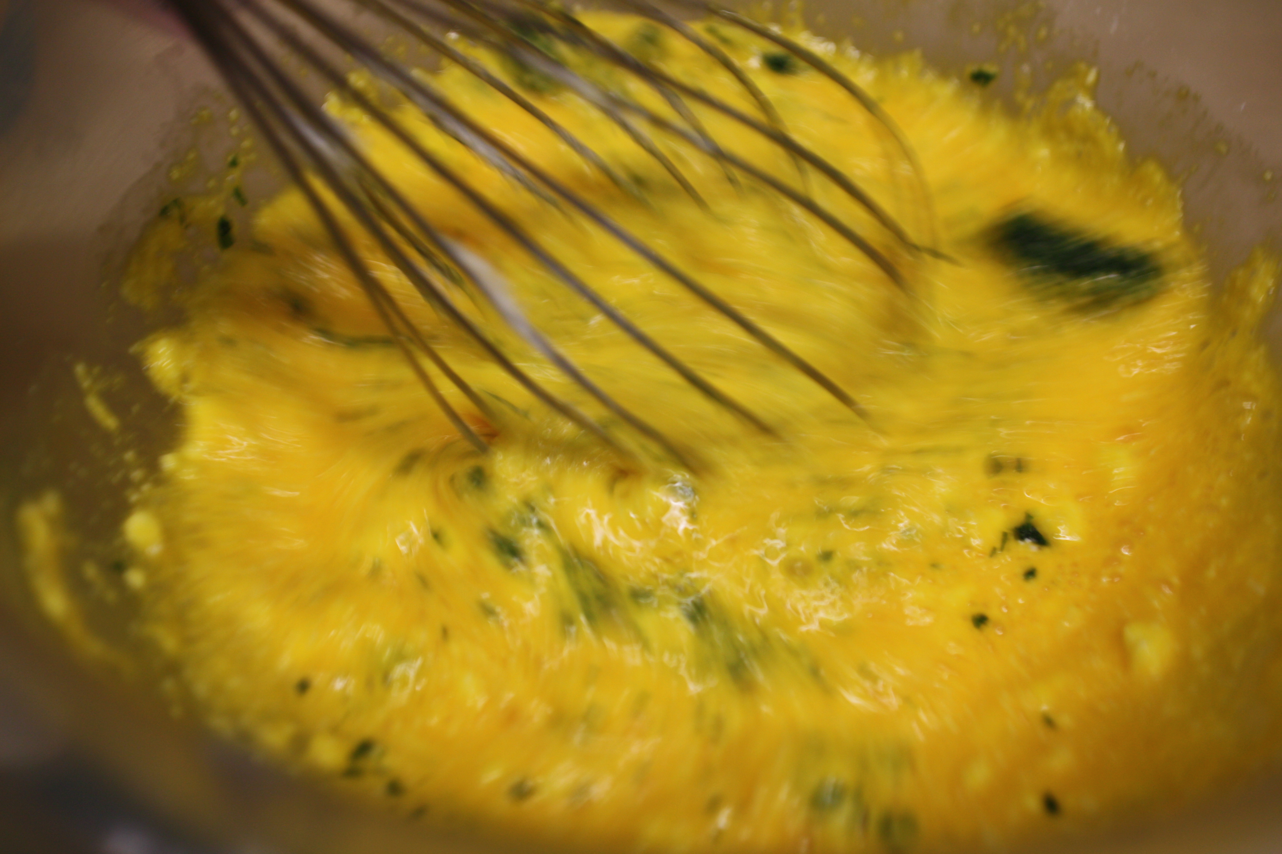 sbattere le uova con la ricotta, il parmigiano, il prezzemolo, la panna e il gorgonzola,