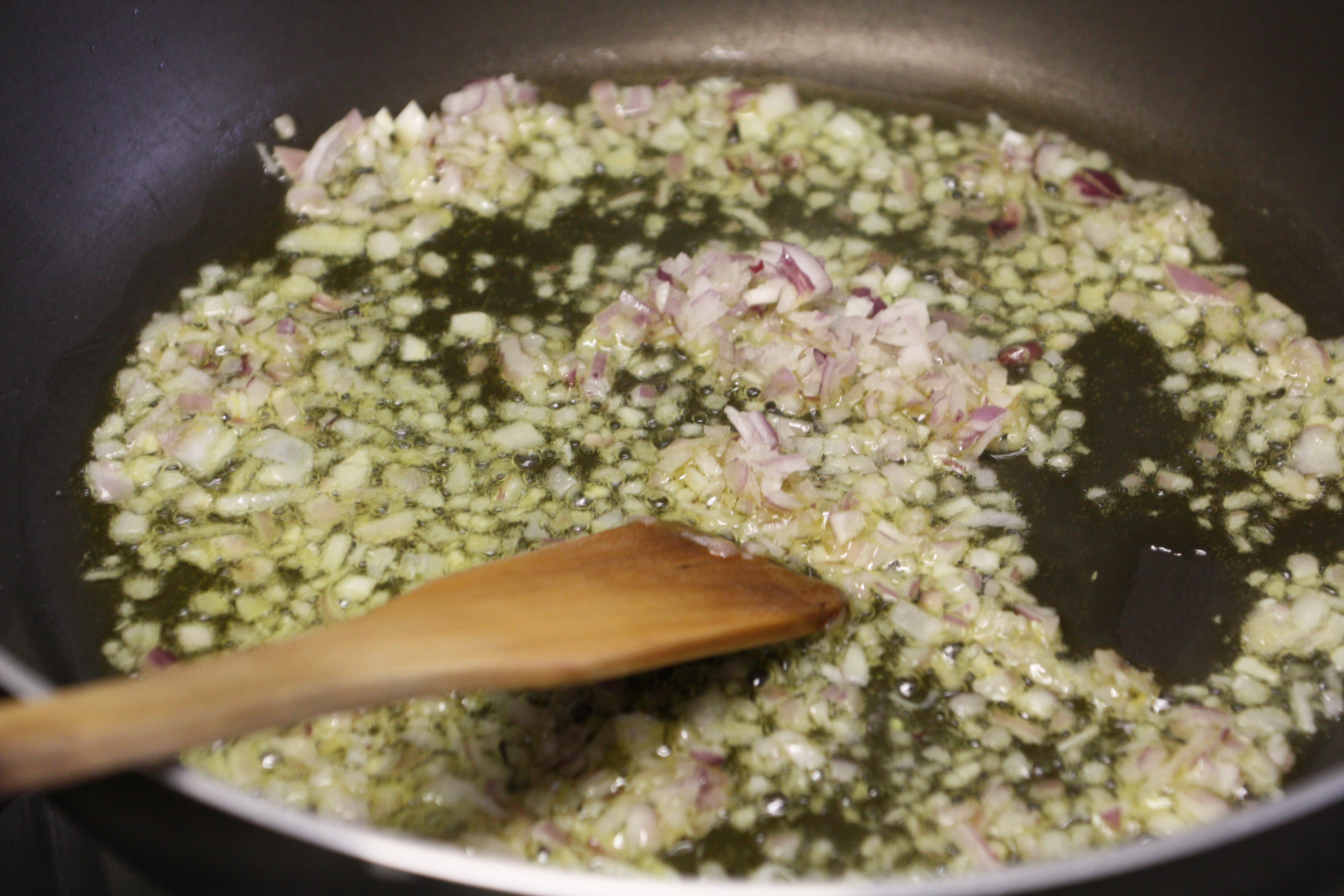 Tritare lo scalogno  e metterlo in una casseruola con i 2 cucchiai d’olio,