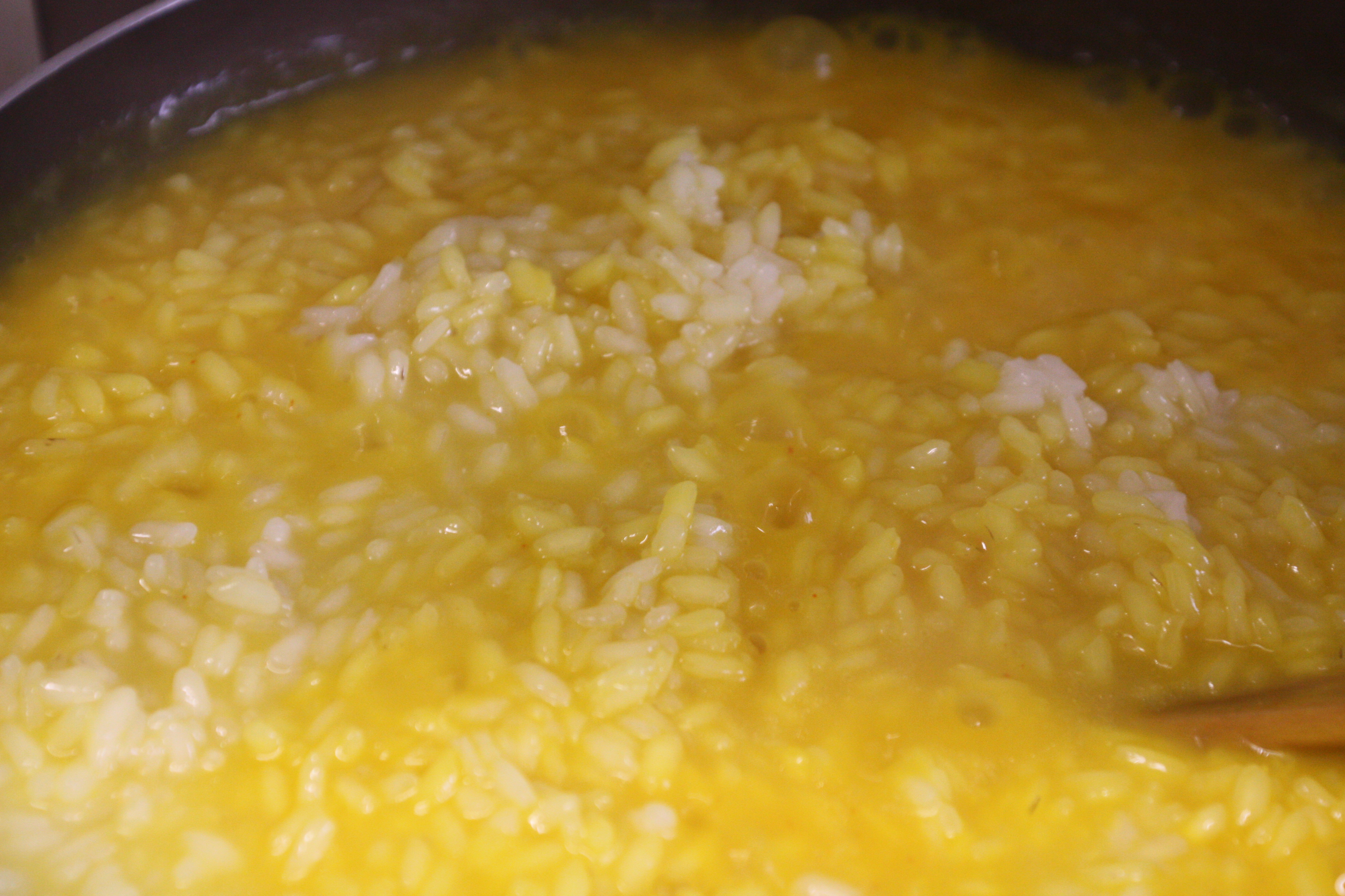 Trascorsi 10 minuti aggiungere lo zafferano sciolto in una ciotola con un mestolo di brodo,