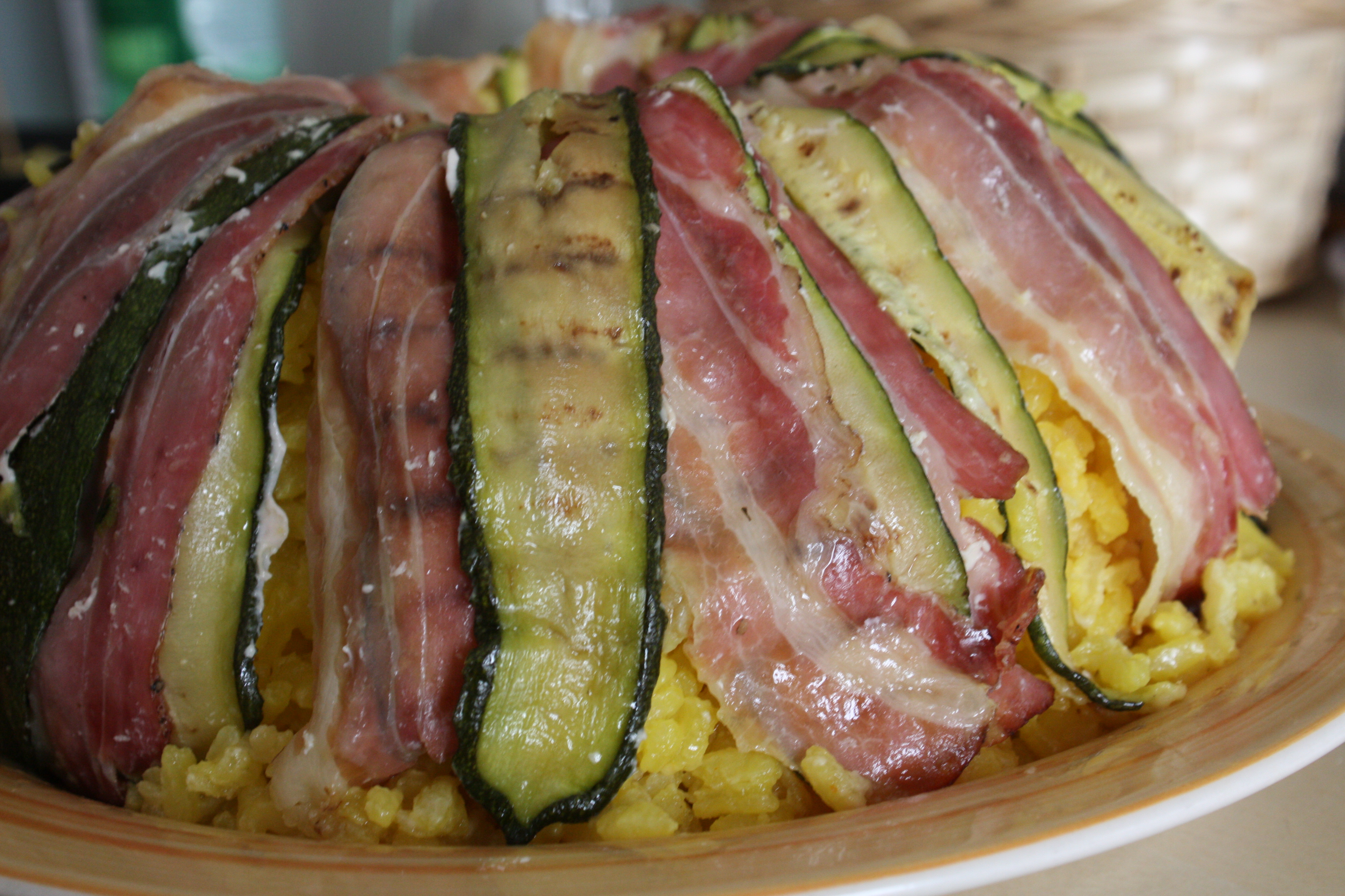 Imburrare uno stampo da budino, disporre intorno le fette di zucchine sovrapponendolo con la pancetta o speck lasciando la parte rossa verso l’esterno.