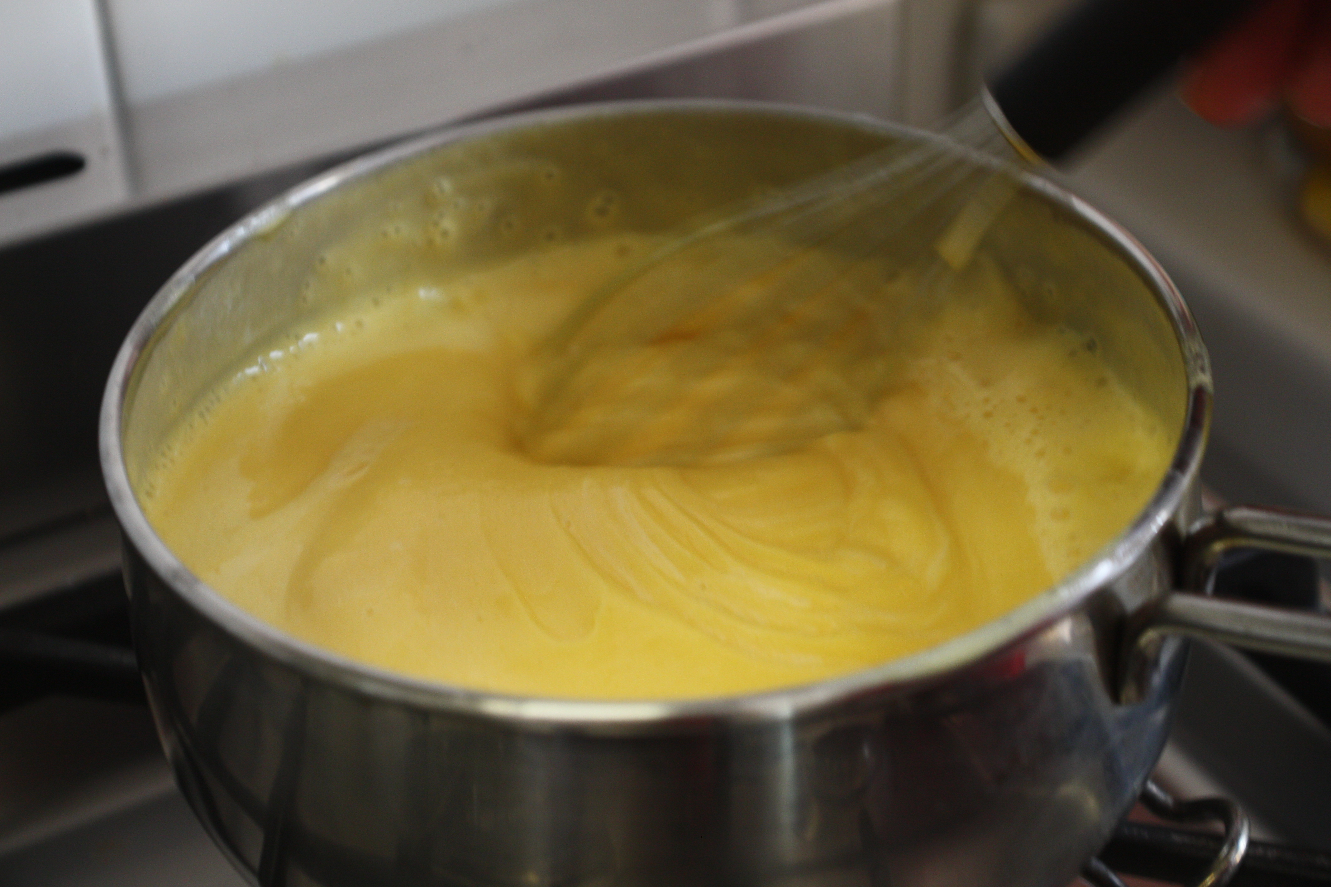 mettere a bollire il latte con le scorze d’arancia e 70 gr di zucchero
