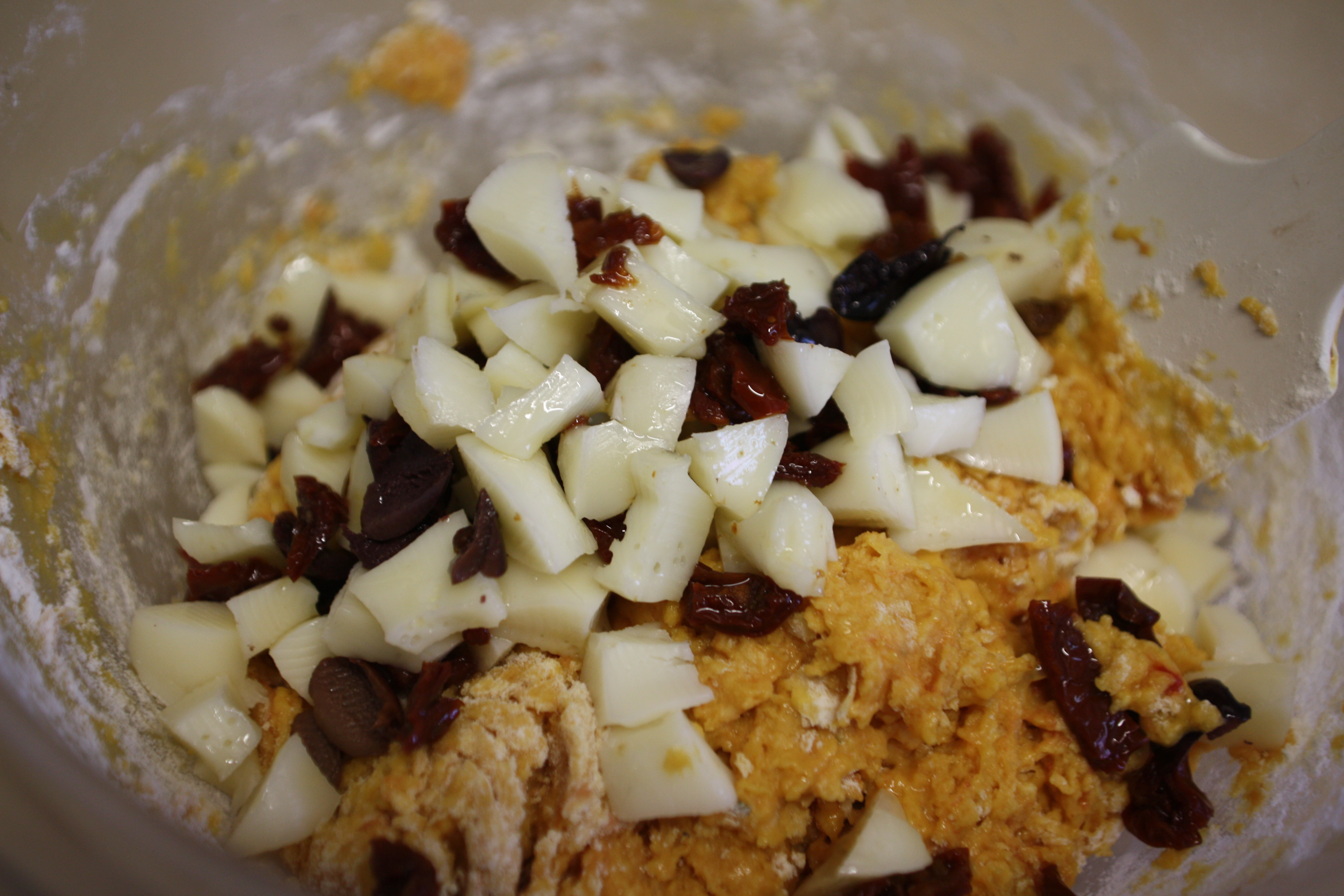 aggiungere il formaggio, le olive e i pomodori tagliati a pezzettini