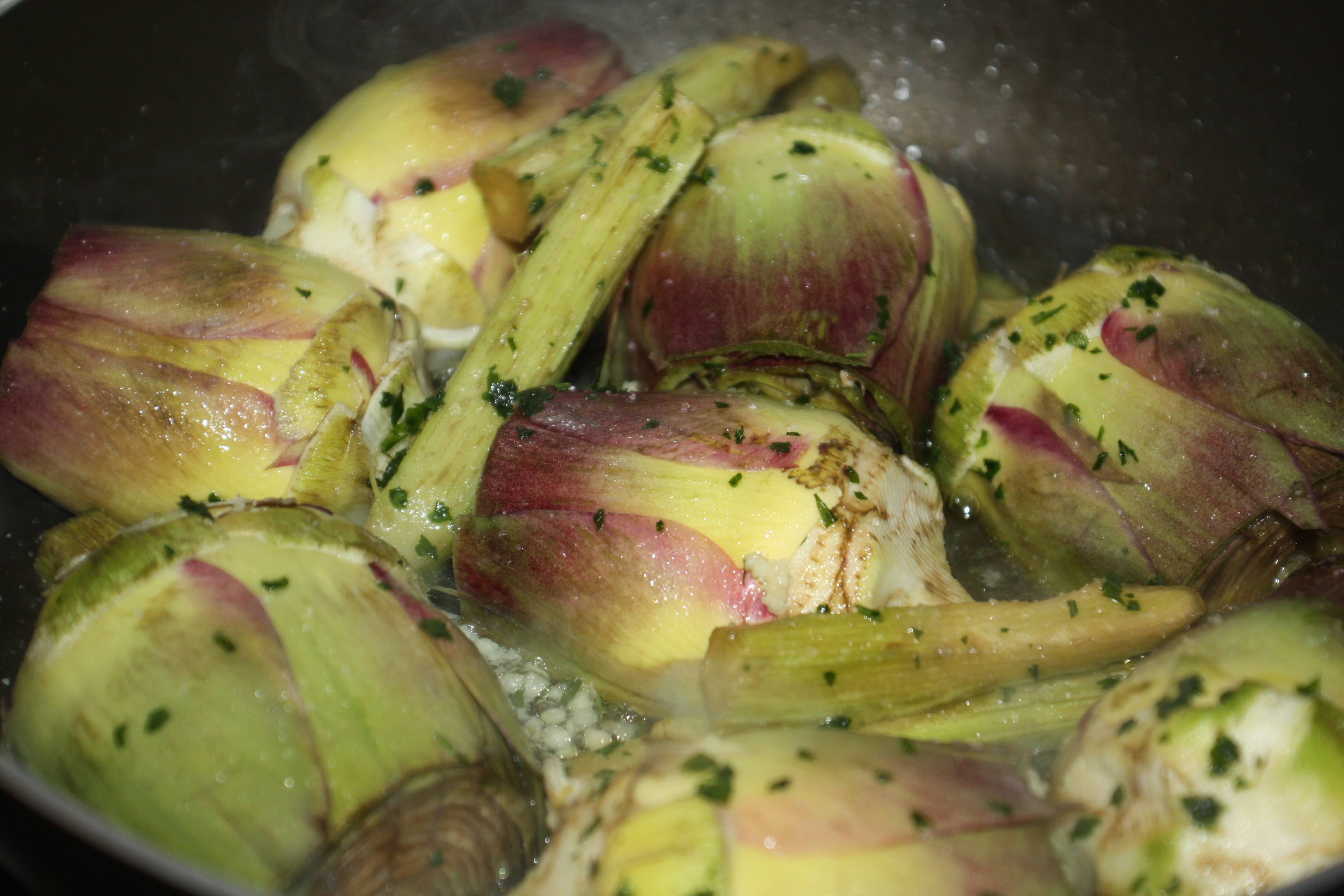 Lavare ed asciugare il prezzemolo e  tritarlo assieme  all’aglio spellato. Mettere il cucchiaio di olio in una padella di misura (in cui possono stare tutti i carciofi in un  unico strato) con l’olio e disporre i carciofi ed i gambi Cospargere i carciofi con una manciata di trito, un pizzico di sale e mettere la padella su fiamma vivace.