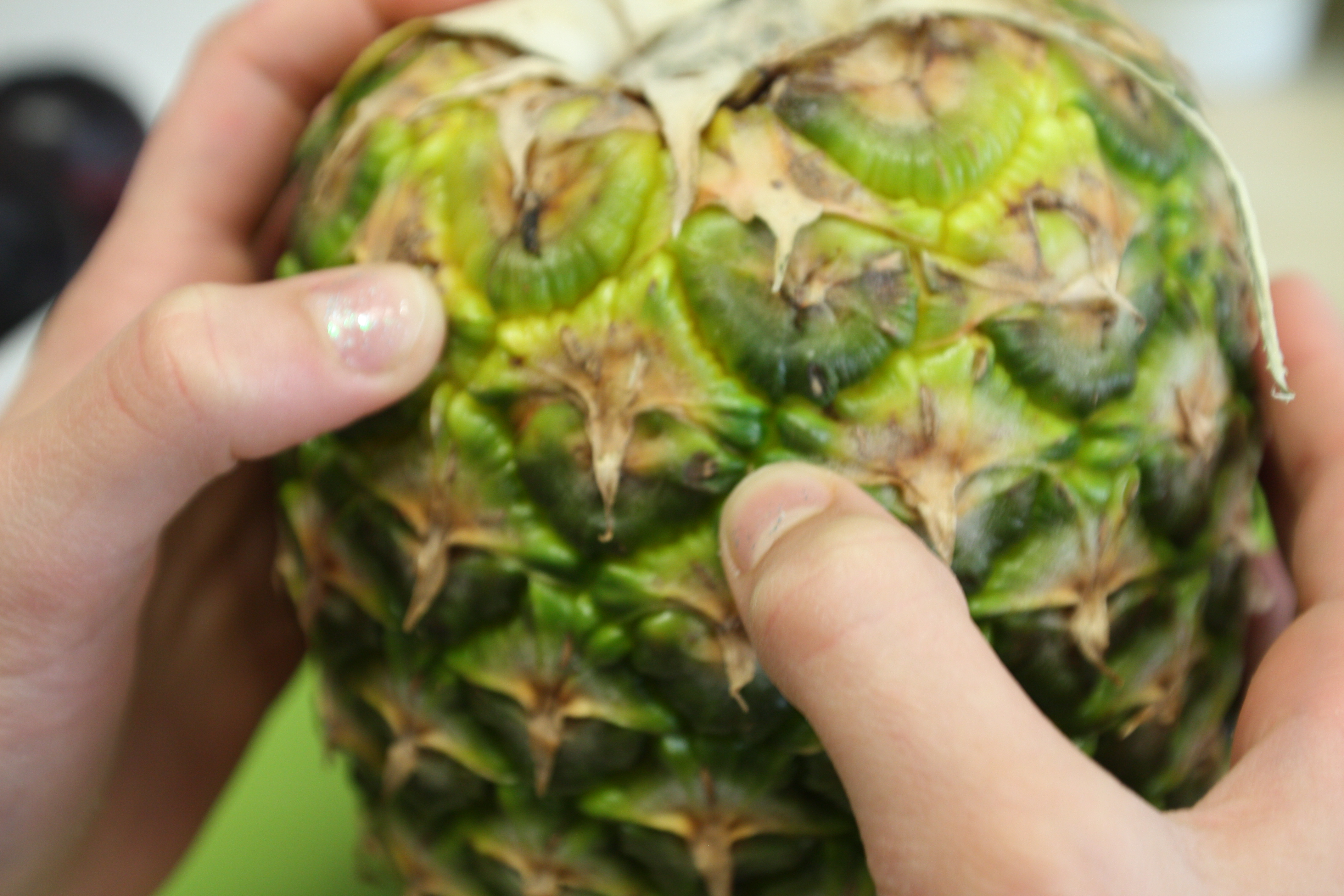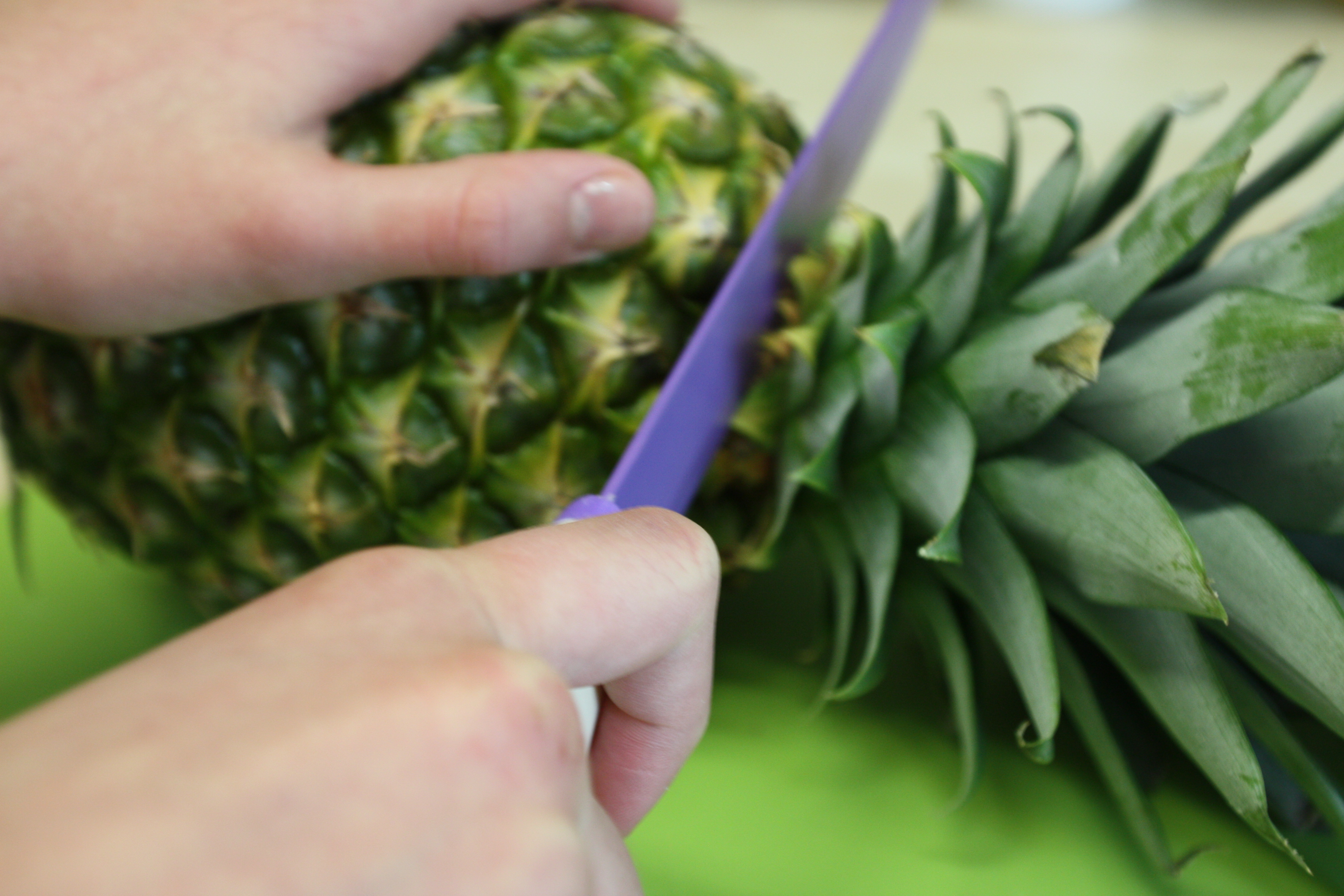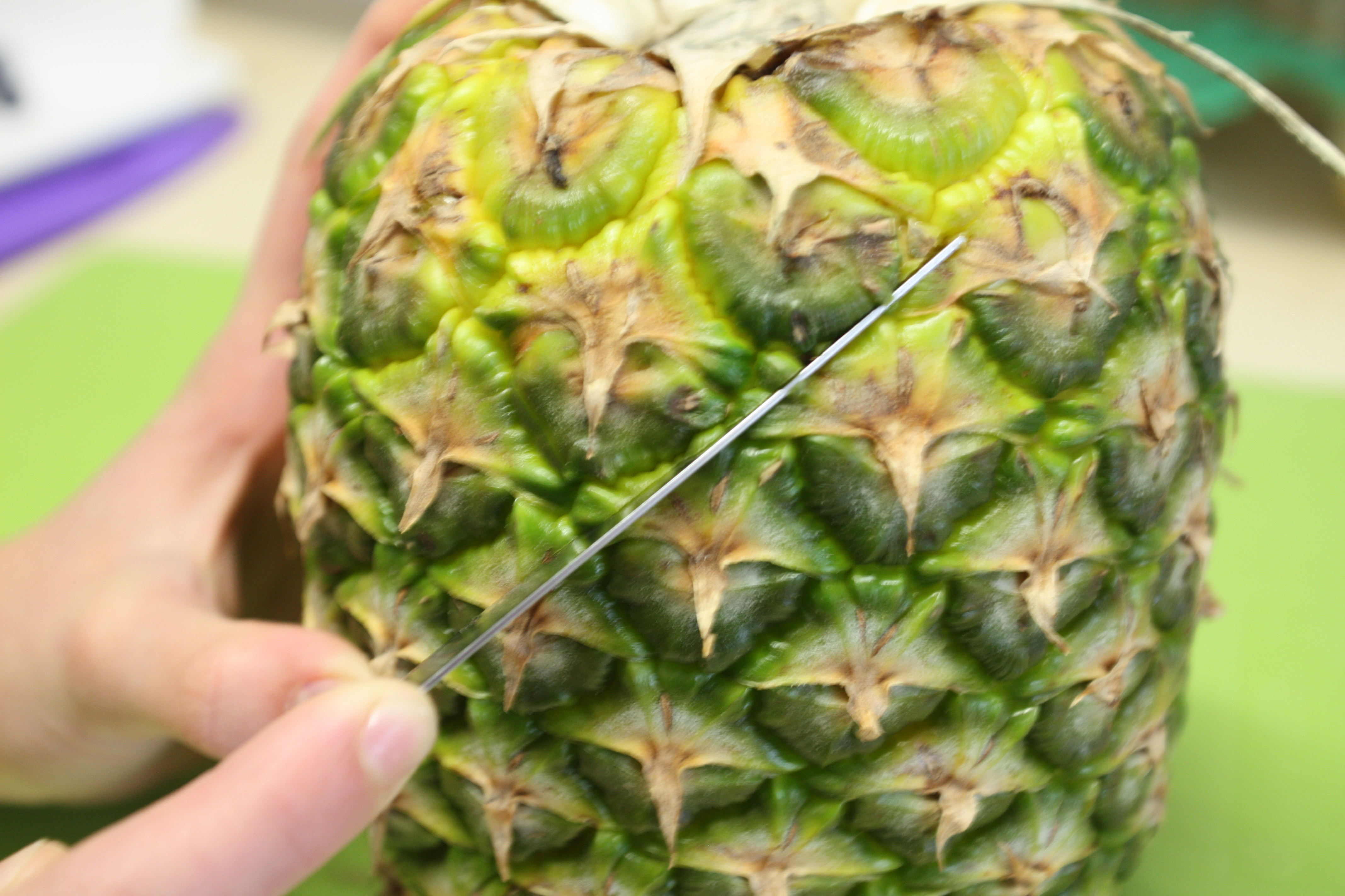 APPOGGIARE L’ANANAS SULLA PARTE TAGLIATA E CERCARE  IL LATO MIGLIORE DOVE RICAVARE GL’OCCHI