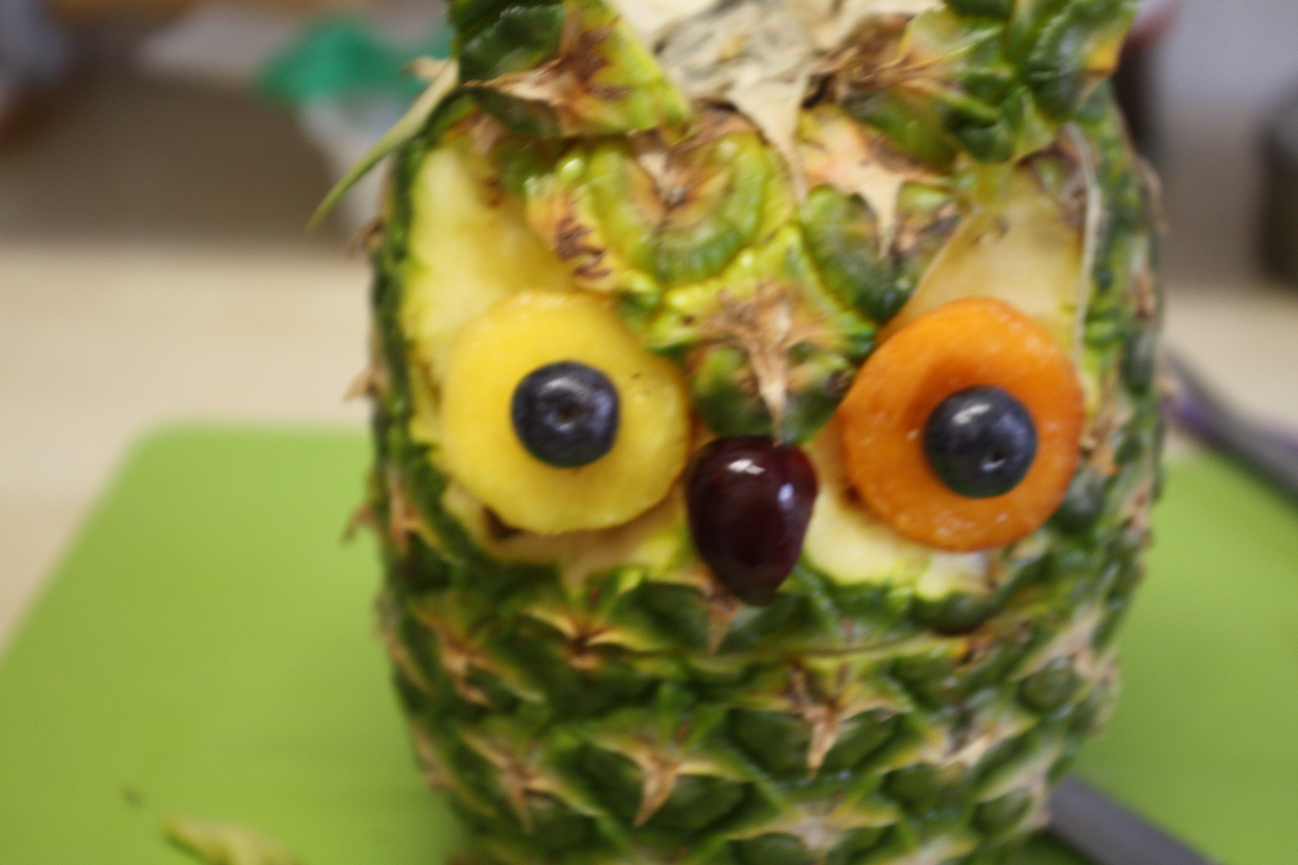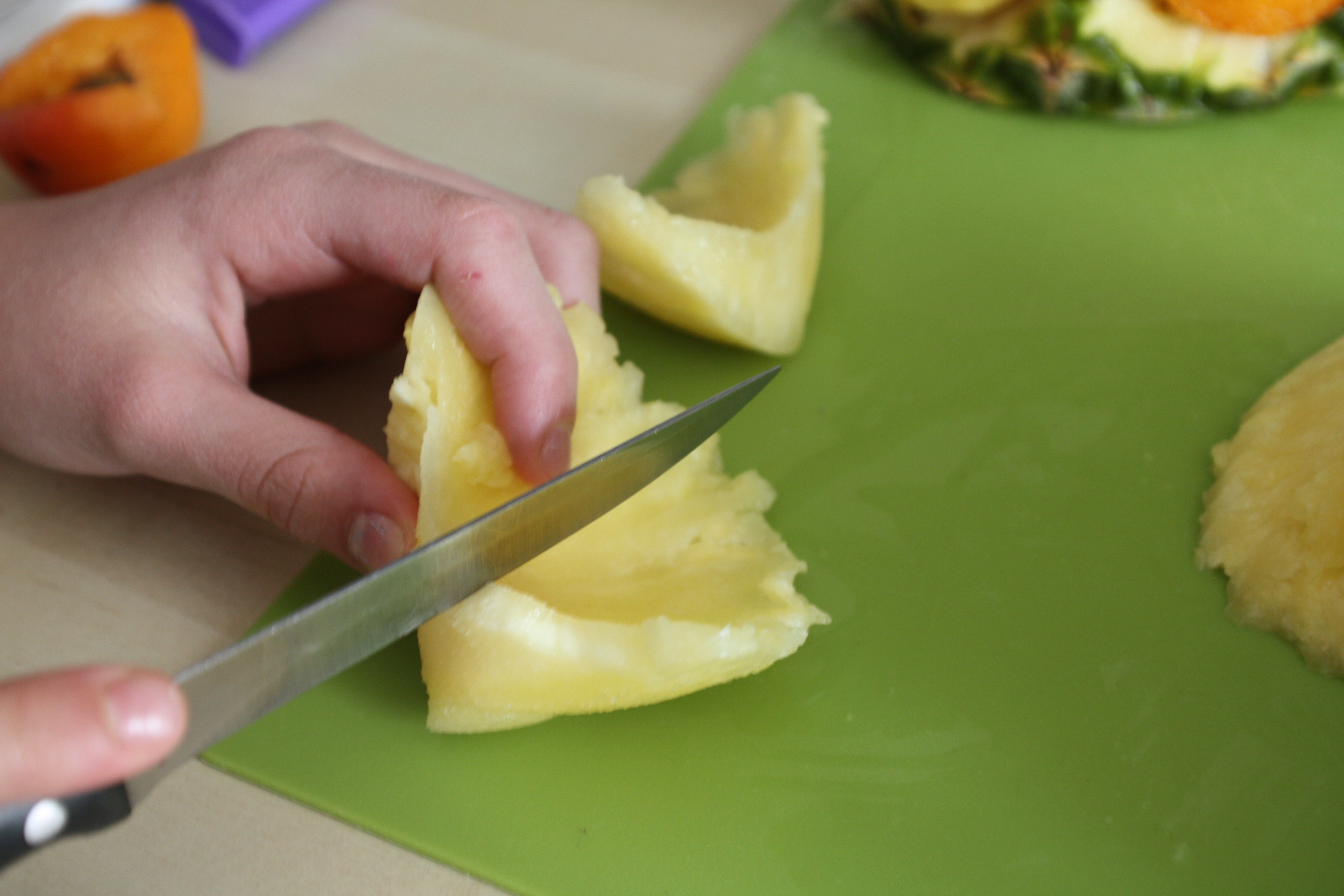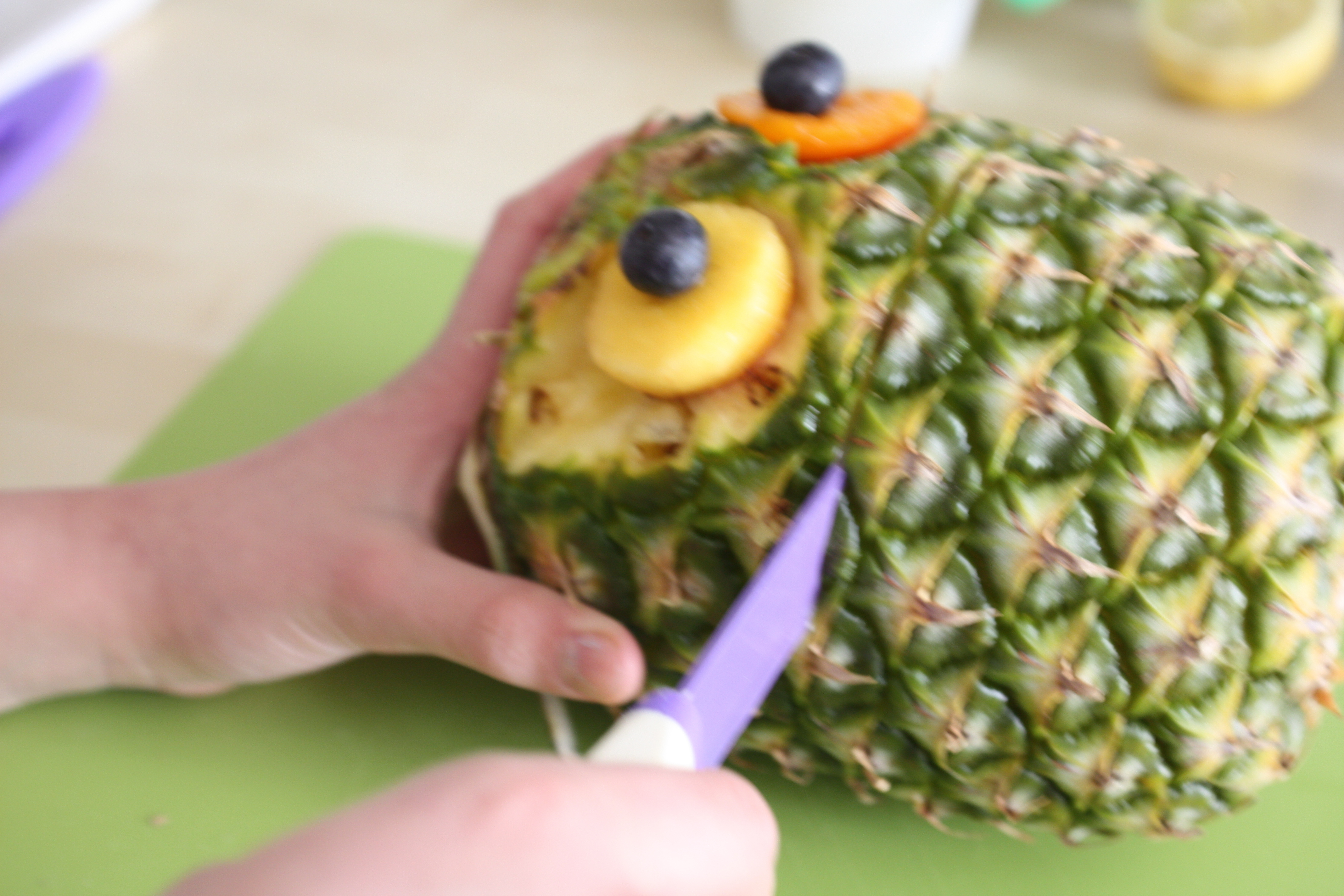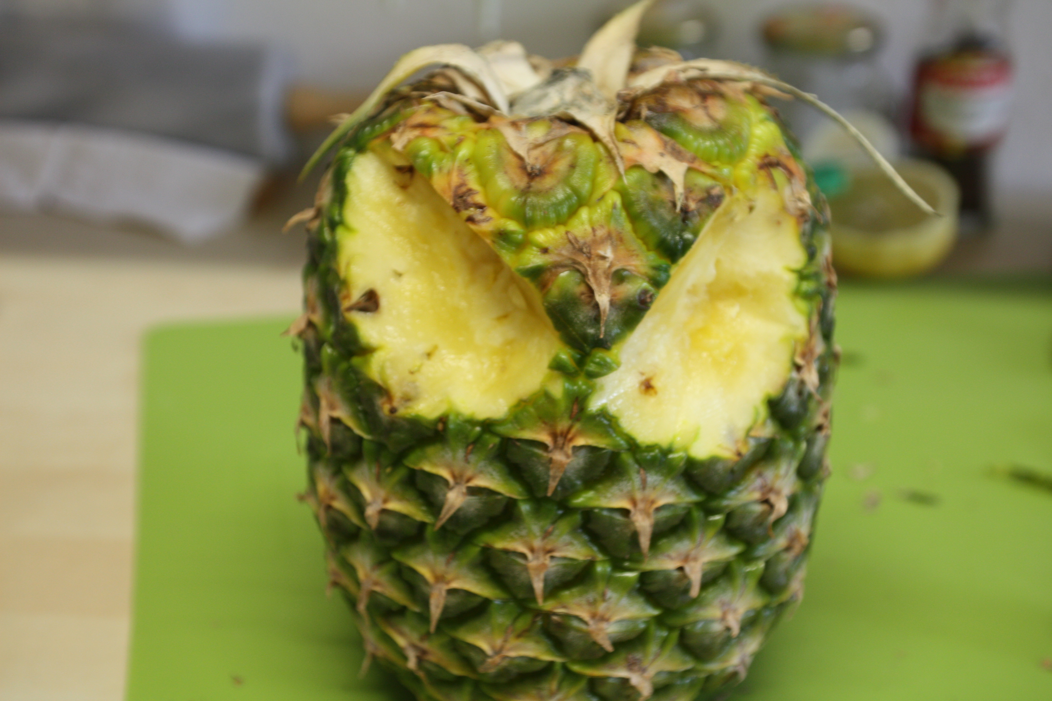 APPOGGIARE L’ANANAS SULLA PARTE TAGLIATA E CERCARE  IL LATO MIGLIORE DOVE RICAVARE GL’OCCHI