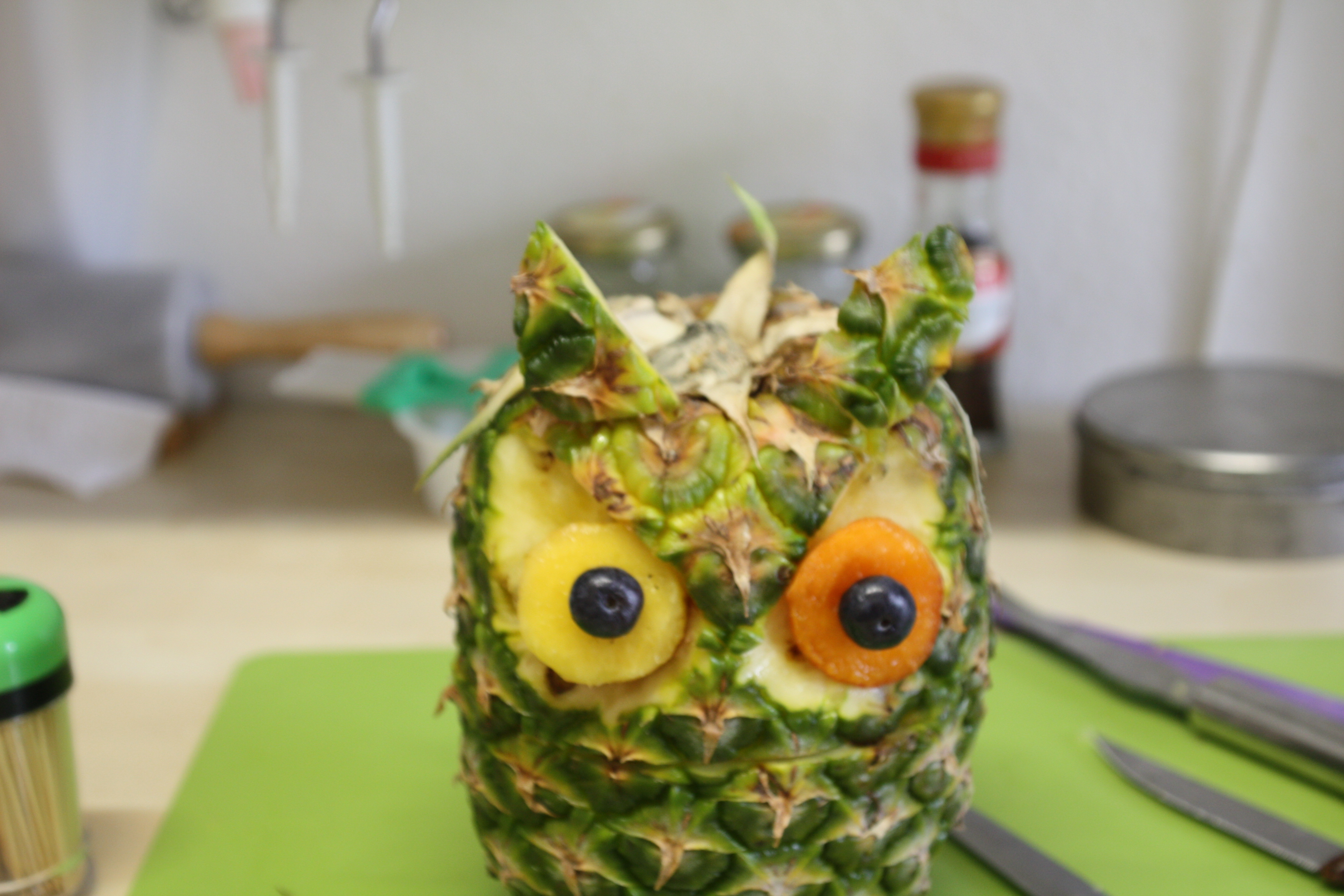 CON LA PARTE DELLA BUCCIA TOLTA PER FARE GLI OCCHI CREARE LE ORECCHIE CHE SI FISSANO CON UNO STUZZICADENTE