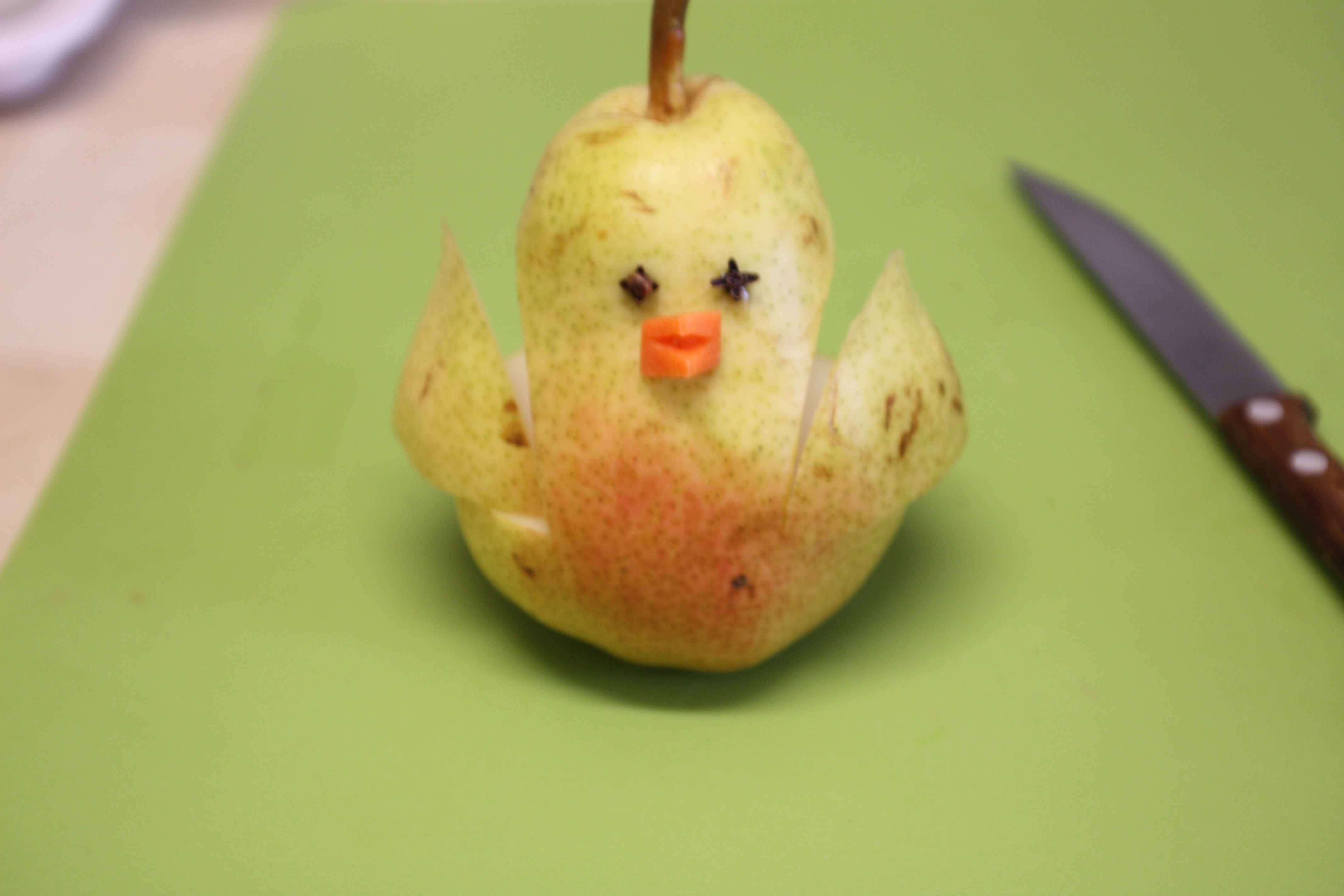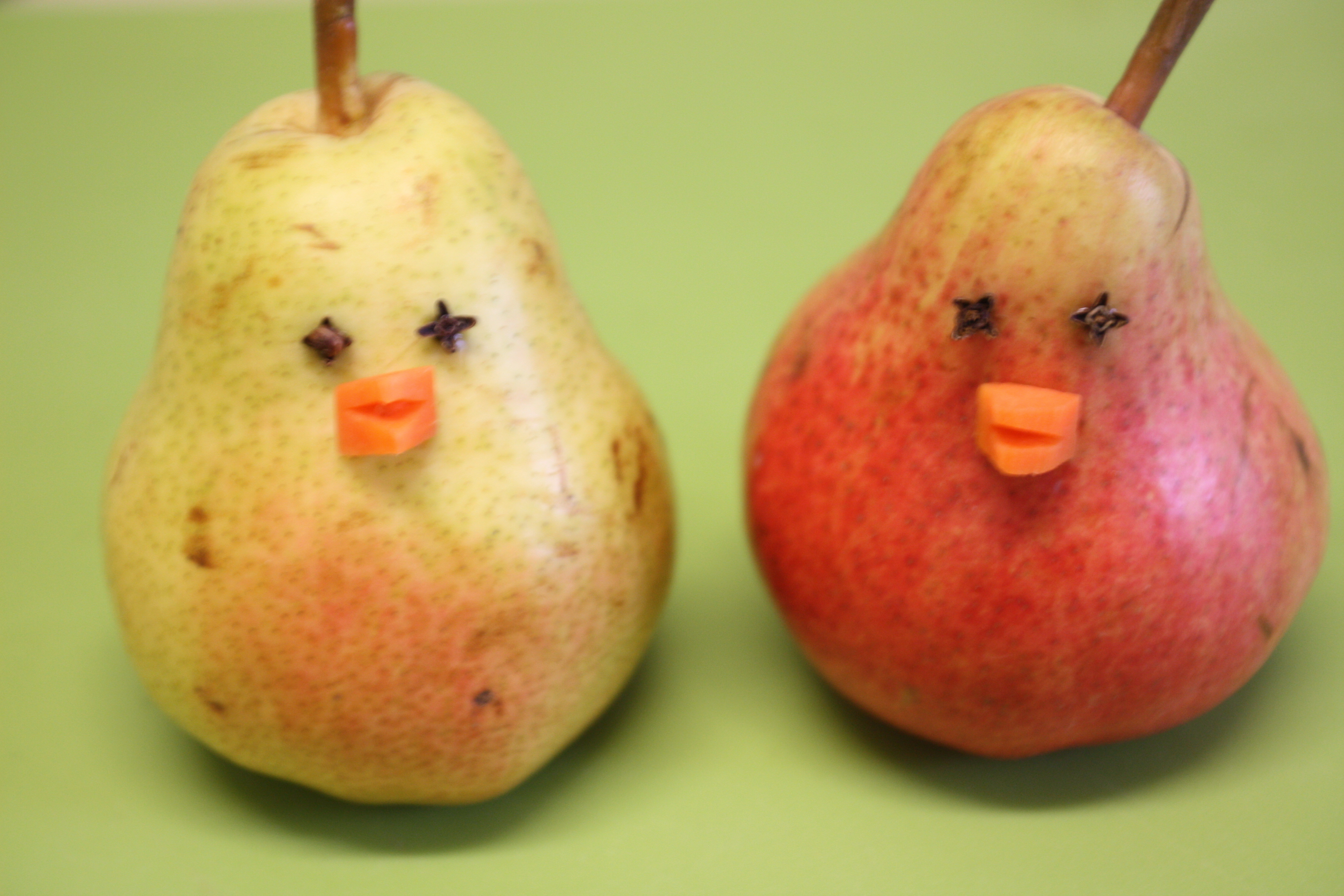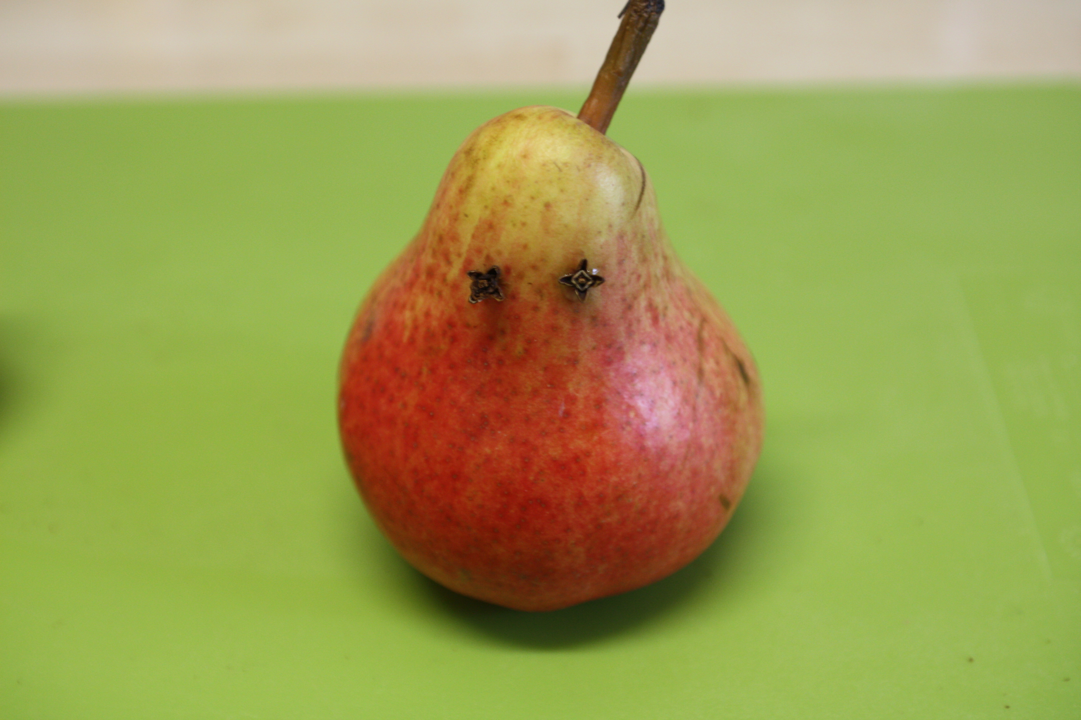 prendiamo due pere william e troviamo la posizione giusta per inserirci due chiodi di garofano per rendere l’effetto occhi