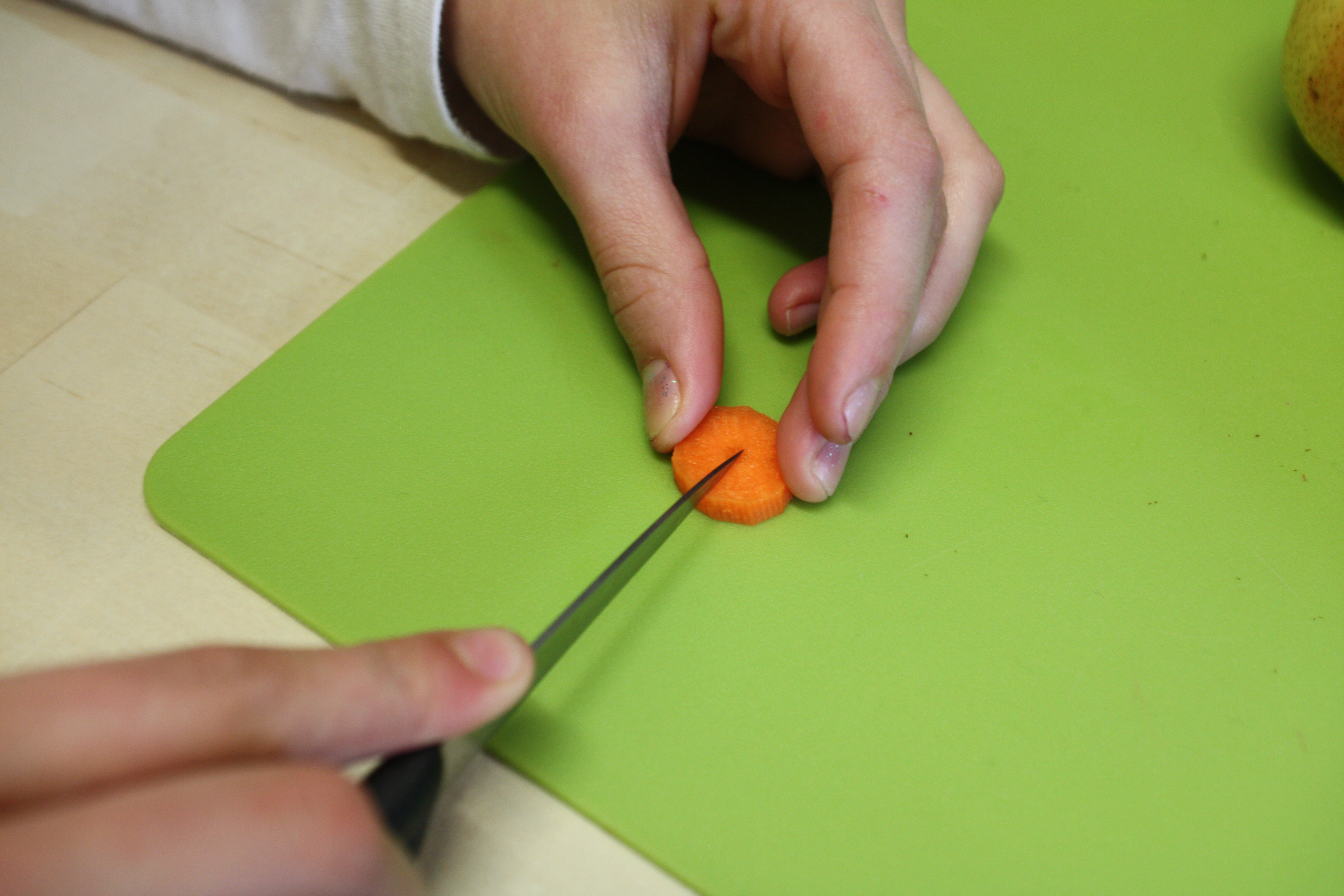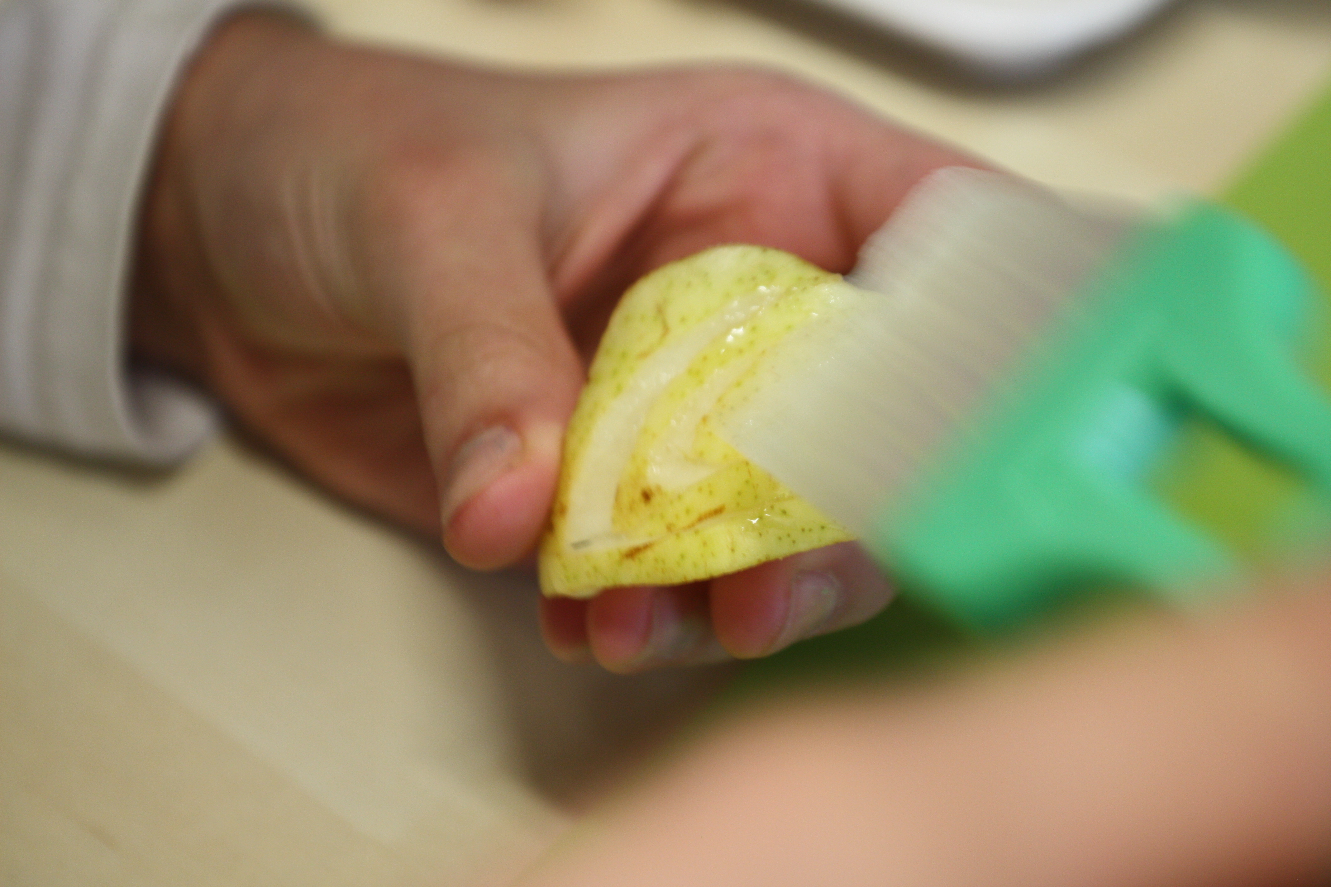 con pazienza ritagliare altri spicchi senza incirere fino in fondo in modo da ricavare degli spicchi sottili di pera