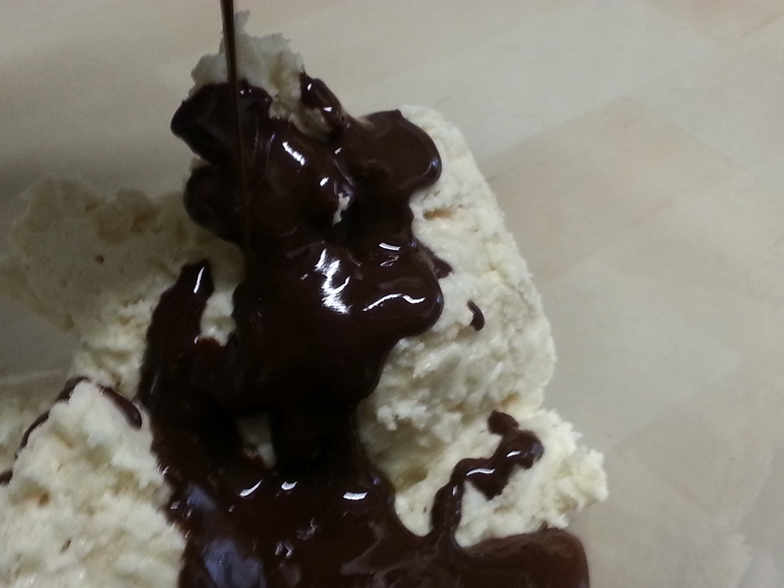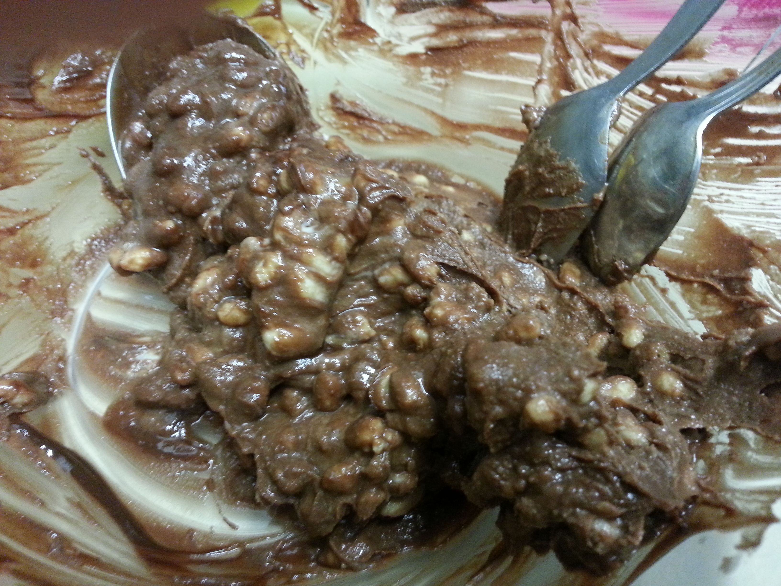 A bagno-maria o al microonde sciogliere il cioccolato fondente. Unirlo al riso impermeabilizzato