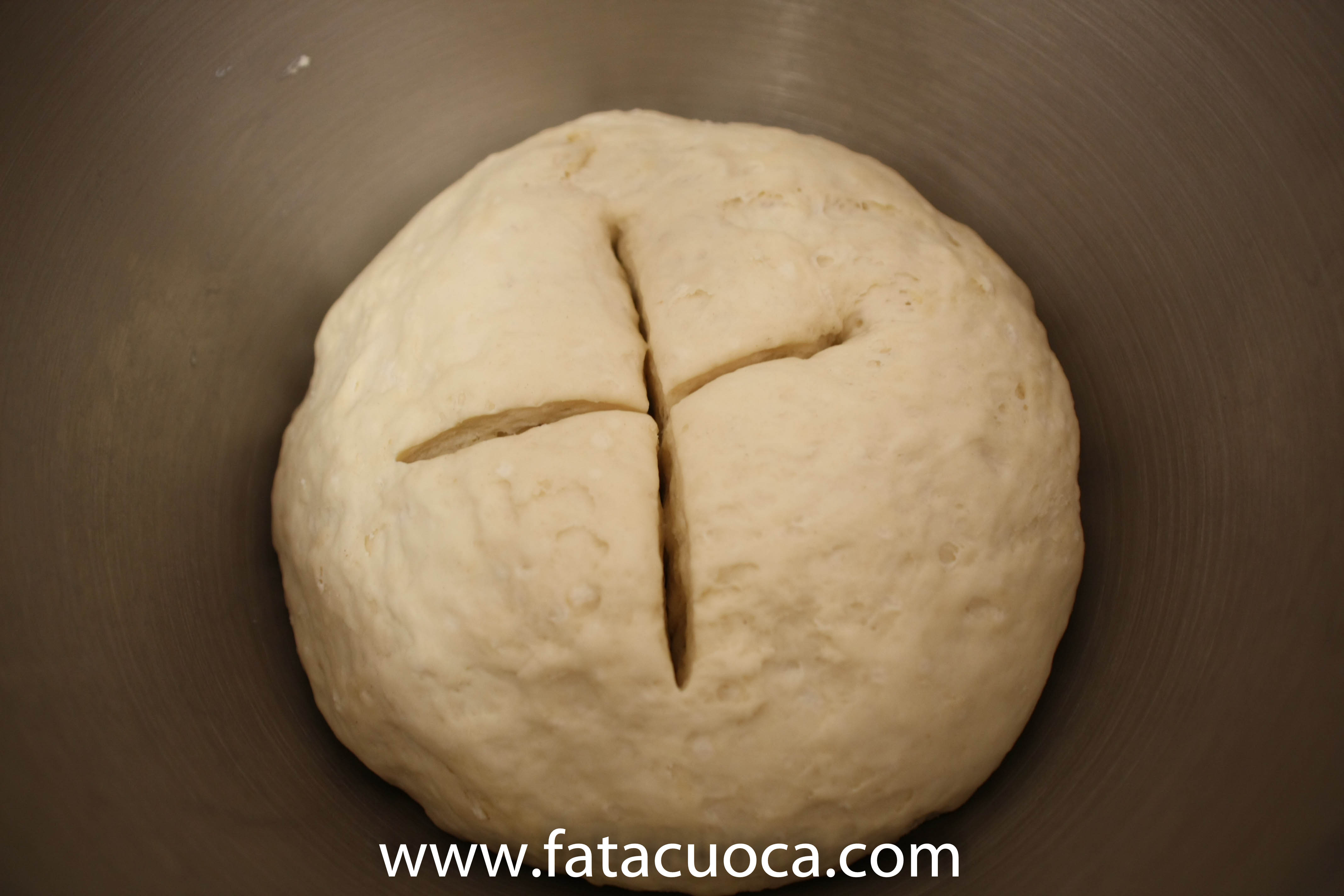 Nella planetaria con il gancio a foglia ho impastato la farina con il lievito, il cucchiaino di zucchero aggiungendo  l’acqua fino ad ottenere un impasto sodo, in fine ho aggiunto olio e sale . Impastare bene e lasciare riposare per un ora.