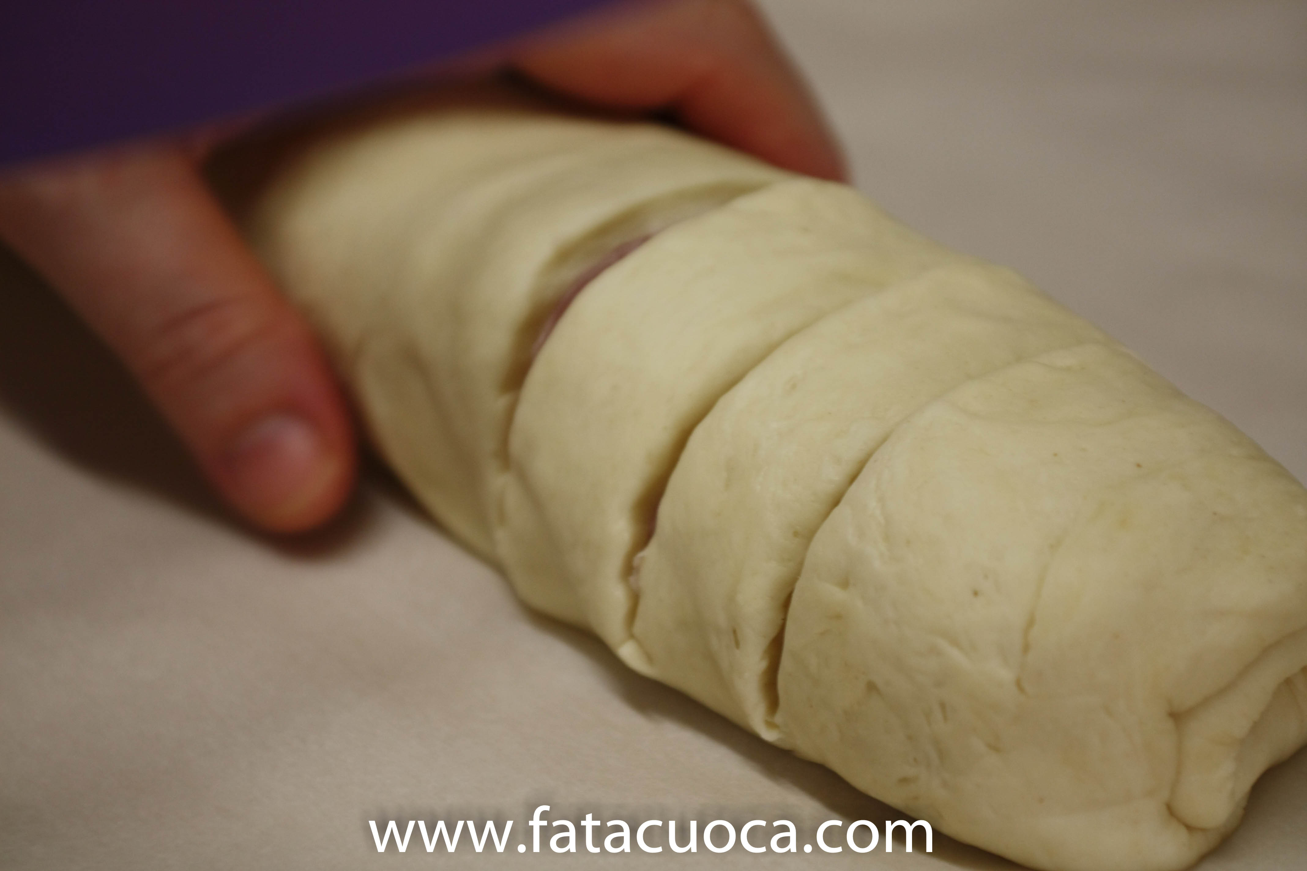 Luisella domenica mi ha mandato una serie di foto di piatti che ha preparato in occasione del compleanno di Filippo, ricette tratte  sia dal mio blog che da quello della grande Natalia Cattelani e noto una forma strana  mi spiega che ha fatto una variazione della torta rotolina… così elaboro il pensiero, faccio qualche variazione sull’impasto,  più sodo e compatto  e la preparo  come merenda a Luca in occasione delle lezioni di cake e….GRANDE SUCCESSO!!!