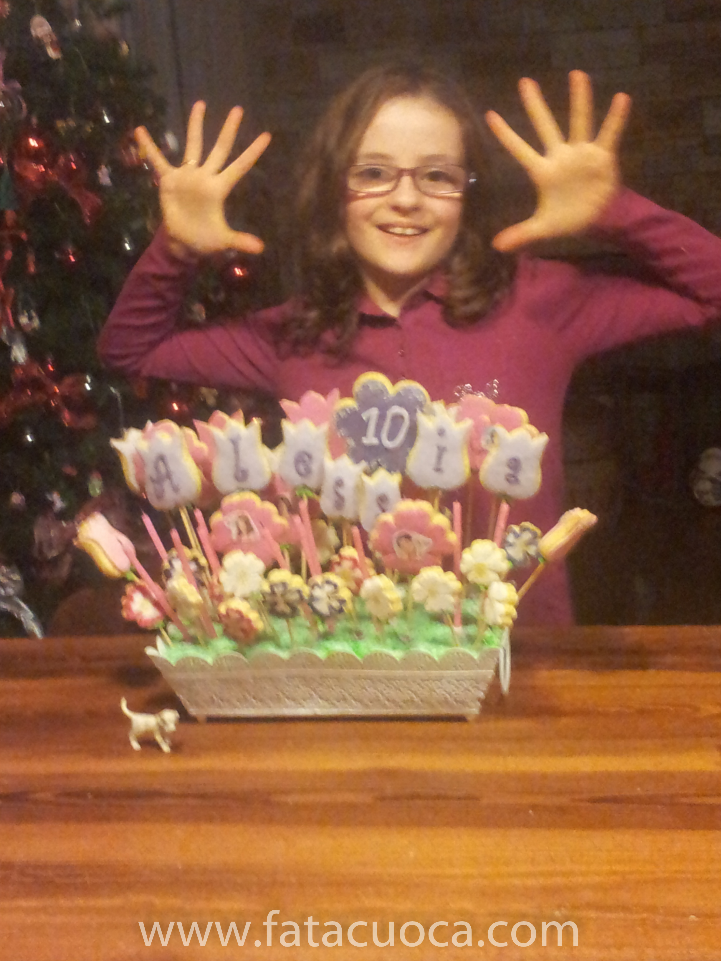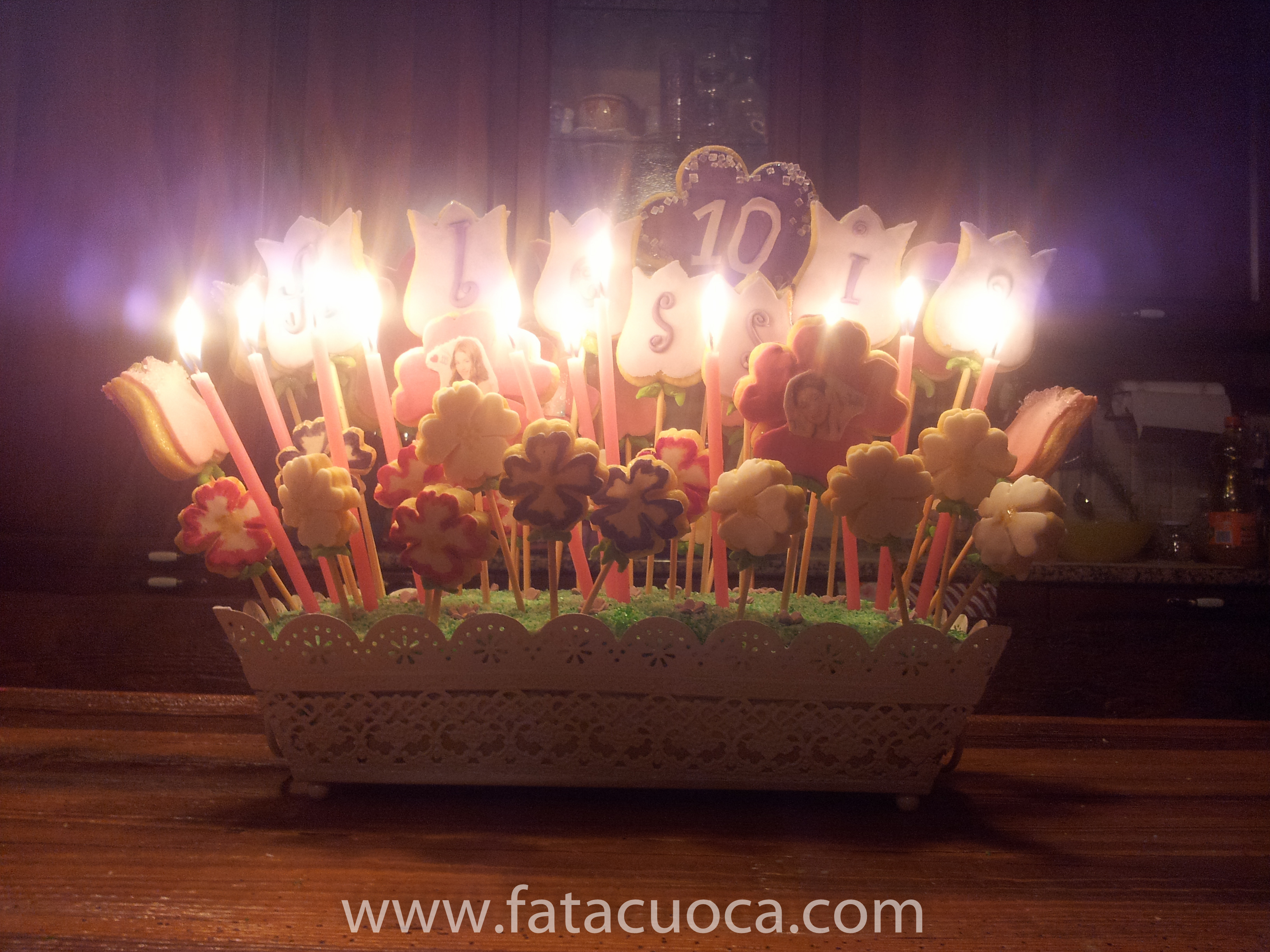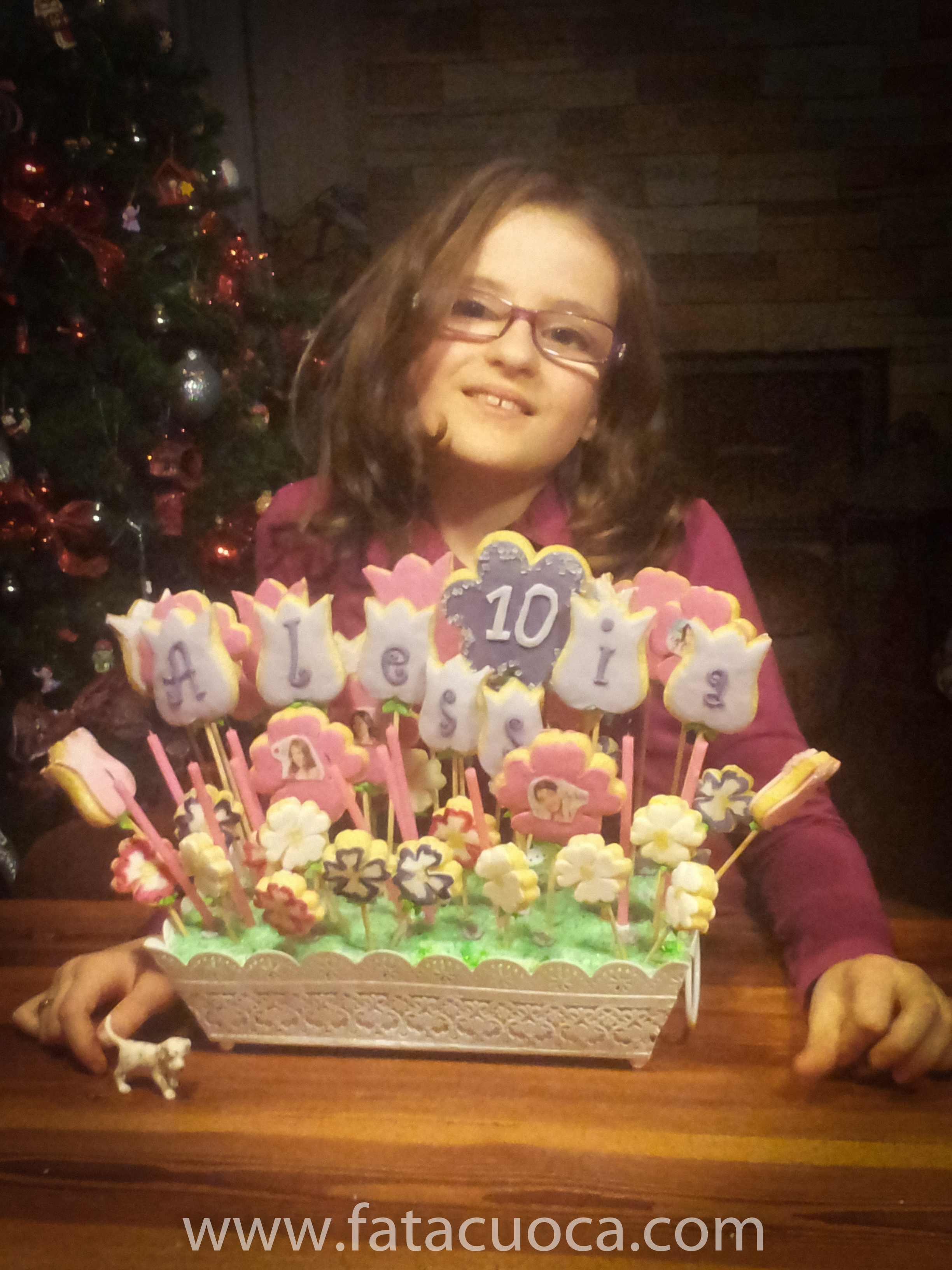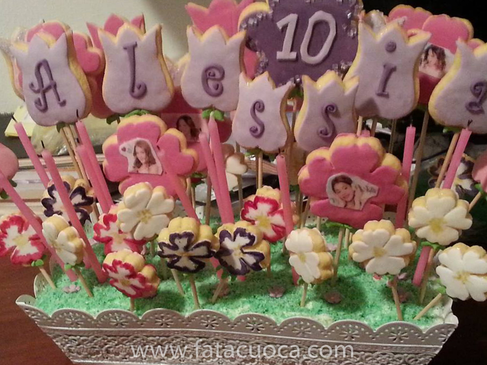 Dopo aver preparato i biscotti secondo la ricetta e infilati nello stecco appena sformati li abbiamo decorati ricoprendoli di pasta di zucchero in entrambi i lati. Dopo averli fatti asciugare ad alcuni è stato applicato i cristalli di zucchero ed altri sono stati decorati a pennello con i colori alimentari ed altri personalizzati con Violetta!