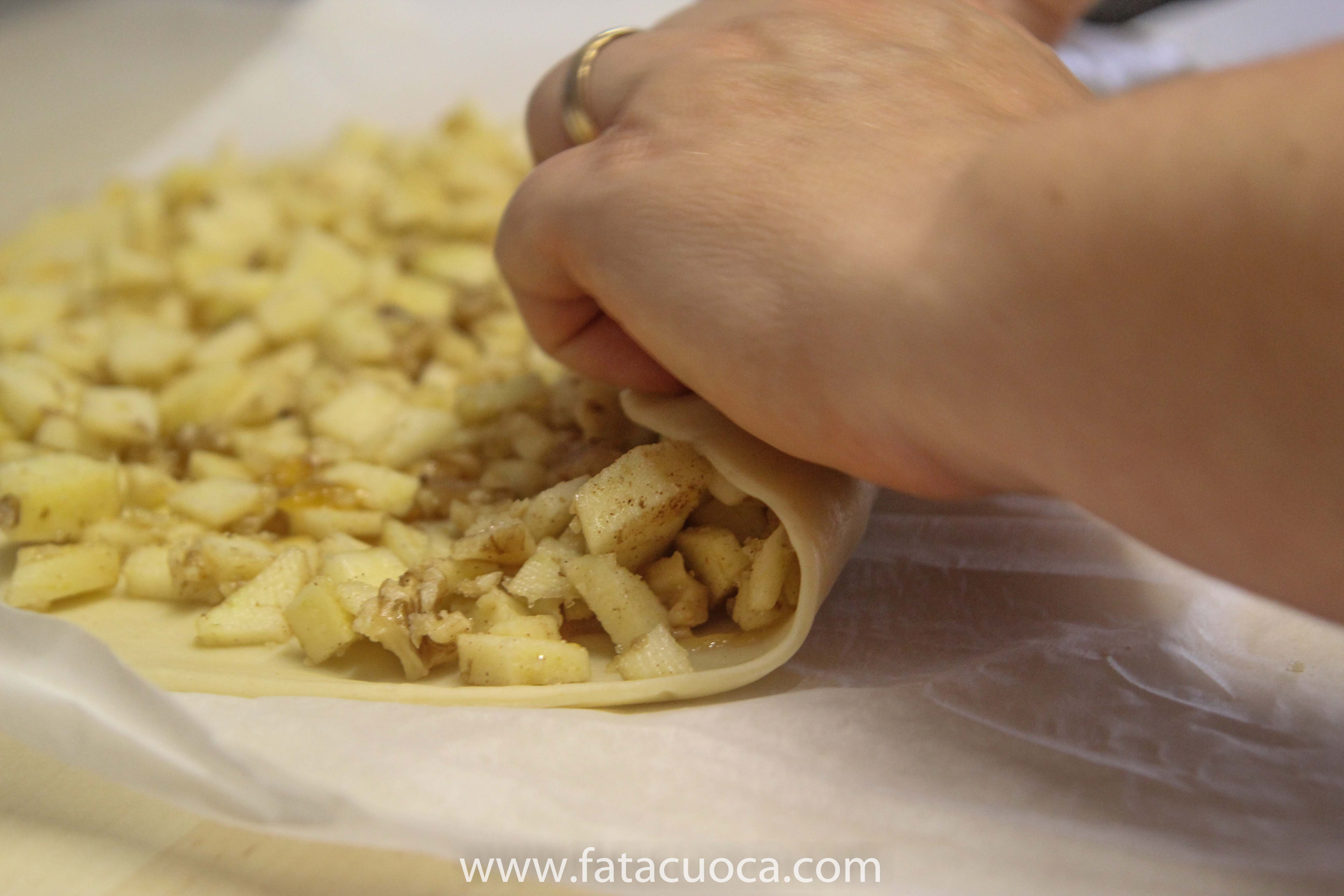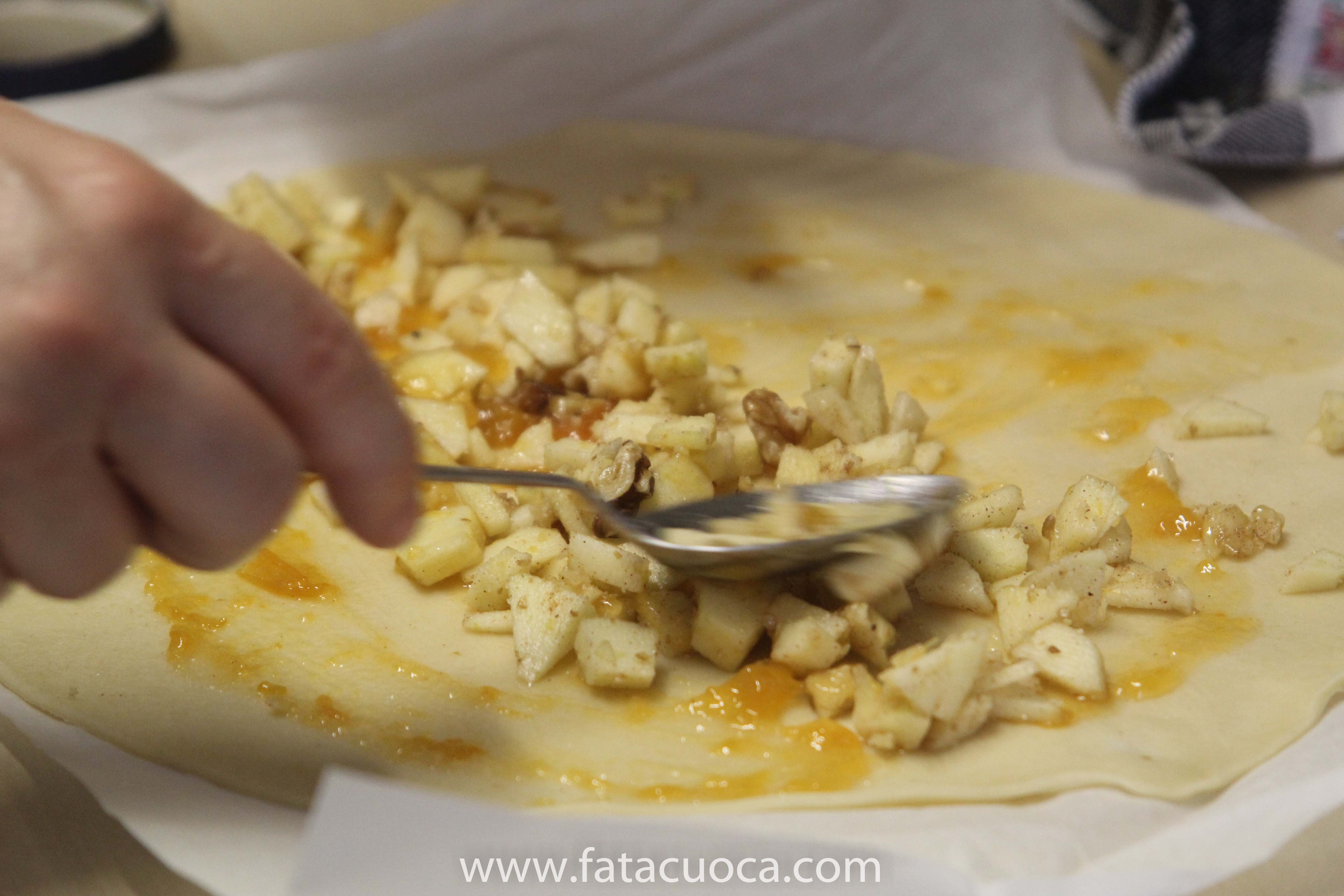 stendere la frolla, ricoprirla con marmellata di albicocche e distribuire le mele