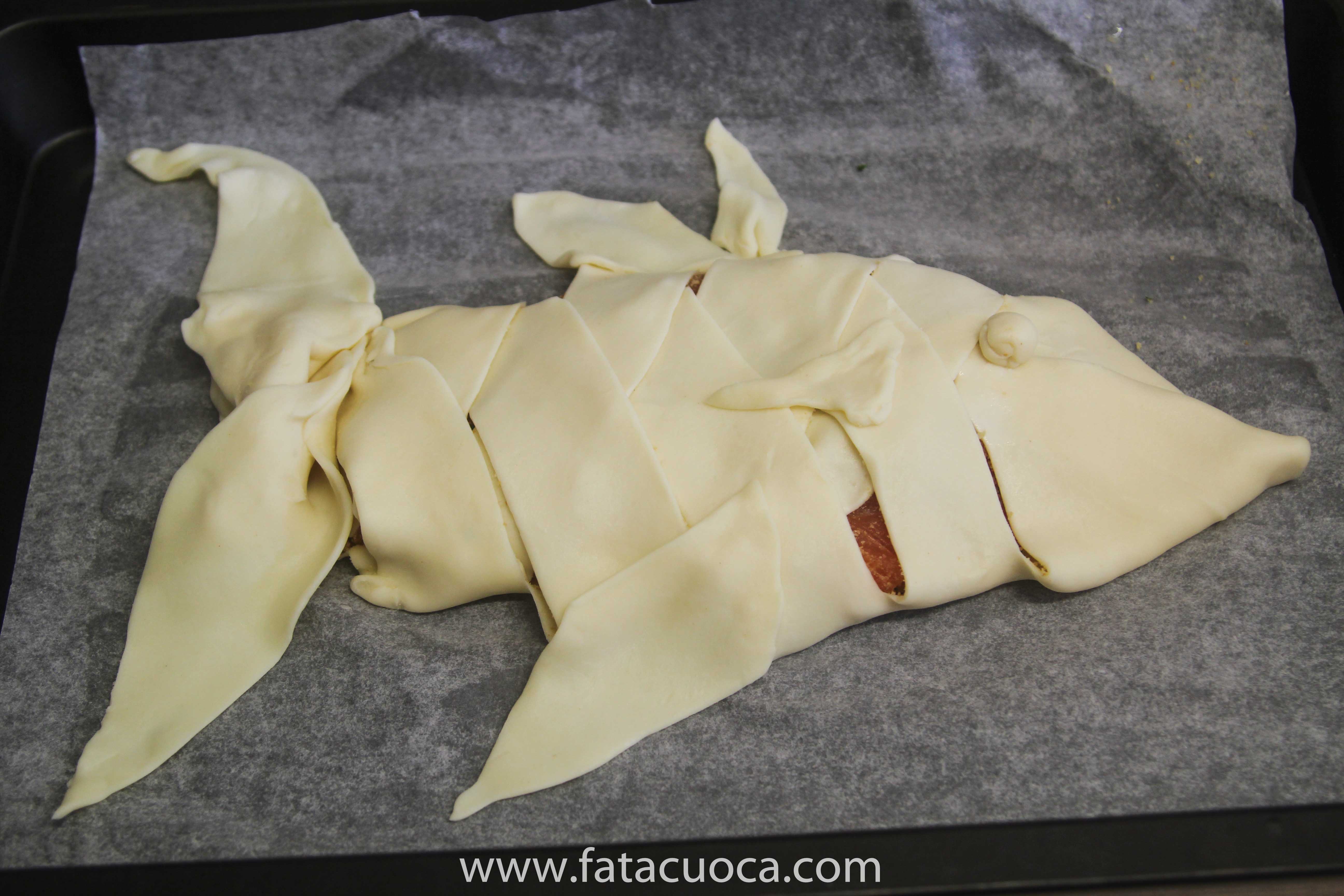 togliere la pelle al filetto di salmone e metterlo sulla pasta sfoglia ritagliata come dalla foto