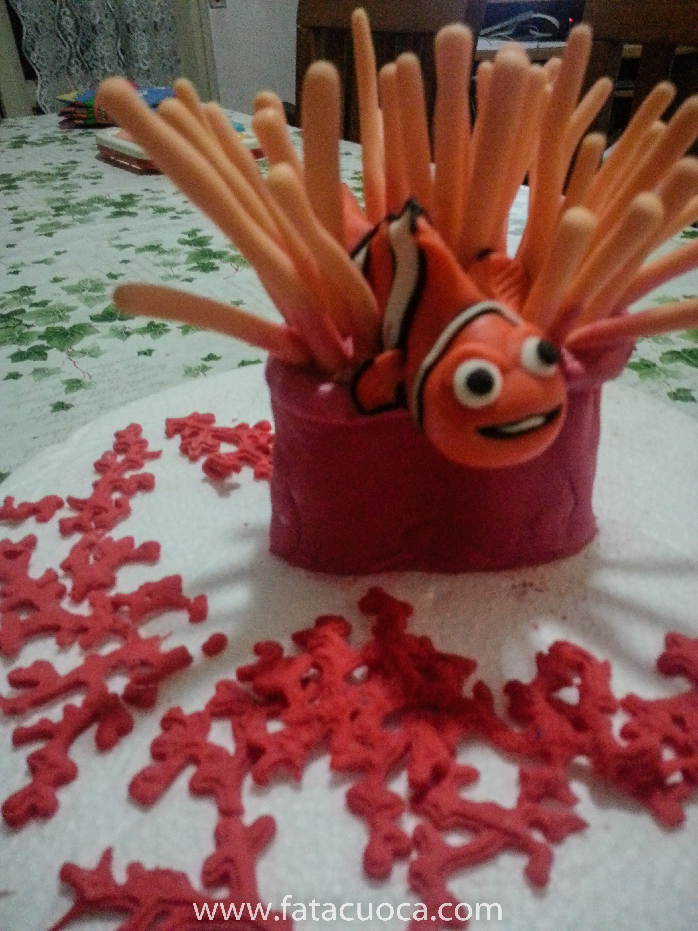Nemo l’ha preparato Valentina mentre l’anemone l’abbiamo realizzato insieme ricoprendo un polistirolo ritagliato e ricoperto di pasta di zucchero. Abbiamo assemblato un top che ricordasse la barriera corallina.