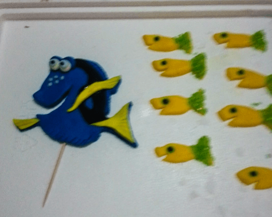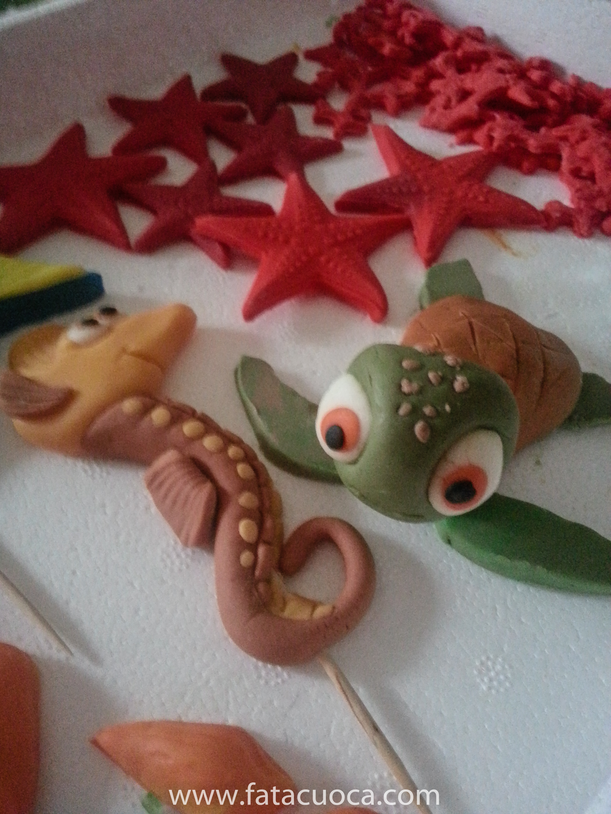 Con anticipo, ritagliandoci tempo qua e la prepariamo una serie di personaggi e dopo averli seccati li abbiamo conservati in una scatola. La pesciolina Dori e il cavalluccio li abbiamo ritagliati utilizzando un’immagine