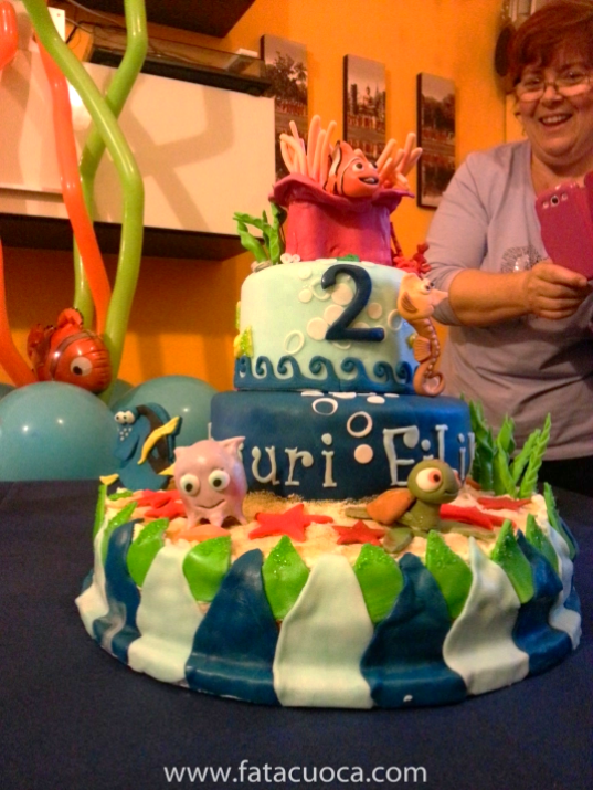 Oggi questo articolo è tutto dedicato al mio adorato Filippo. Sono già passati due anni e non me ne rendo conto …. il tempo vola e lui cresce come un fulmine… non so se è un effetto collaterale del essere nonna ma non ci perdiamo d’animo e così per festeggiare questo compleanno assieme a mamma valentina pensiamo di realizzare un tema a lui molto caro. Il pesciolino Nemo è il suo preferito a lui piace tantissimo vedere il film e addirittura recita le battute in anticipo!!!! Così progettiamo la torta ispirandoci ad un grande maestro Roberto Murgia!!!! Con grande modestia devo dirvi che il risultato è stato molto soddisfacente!!!