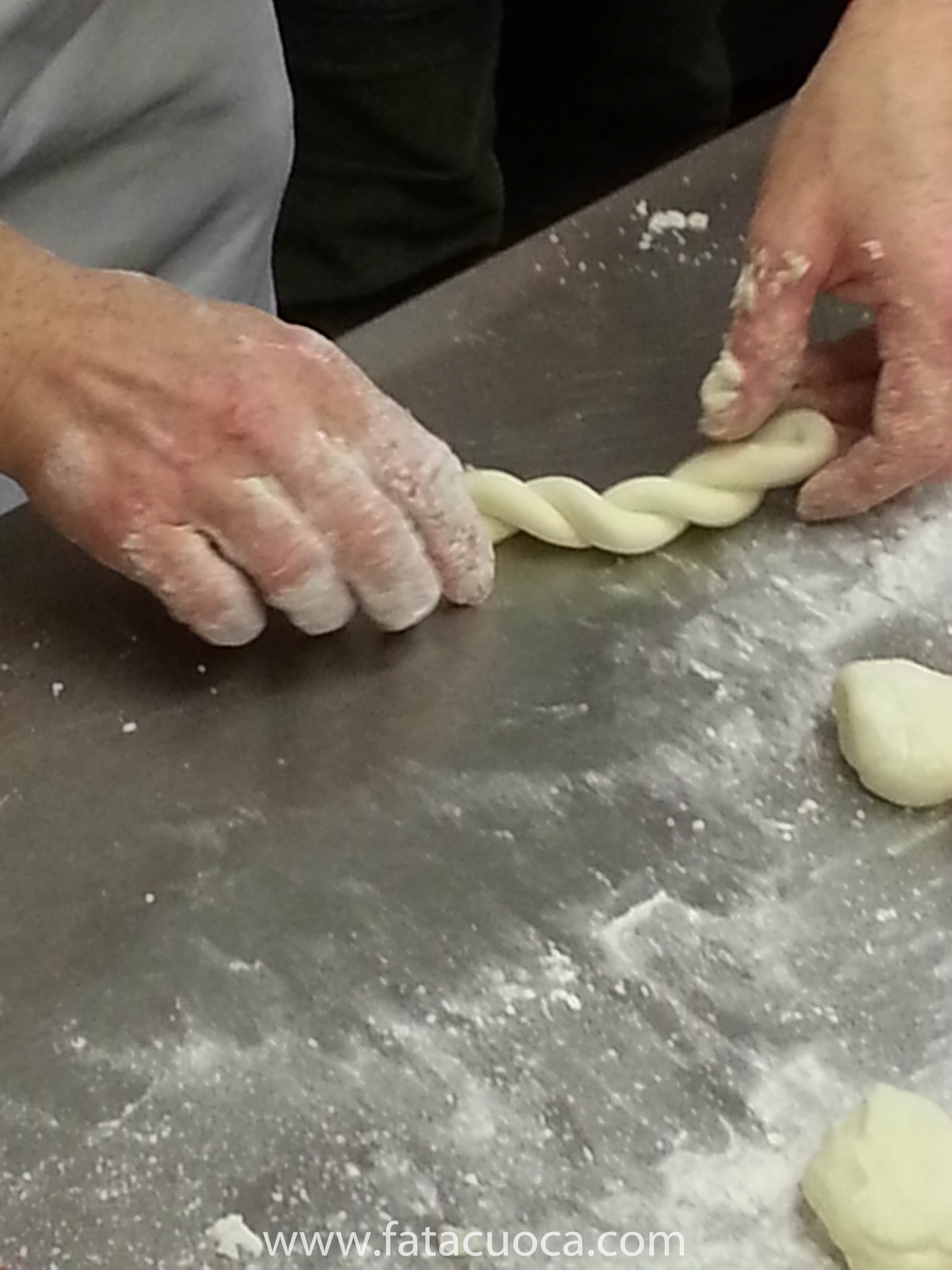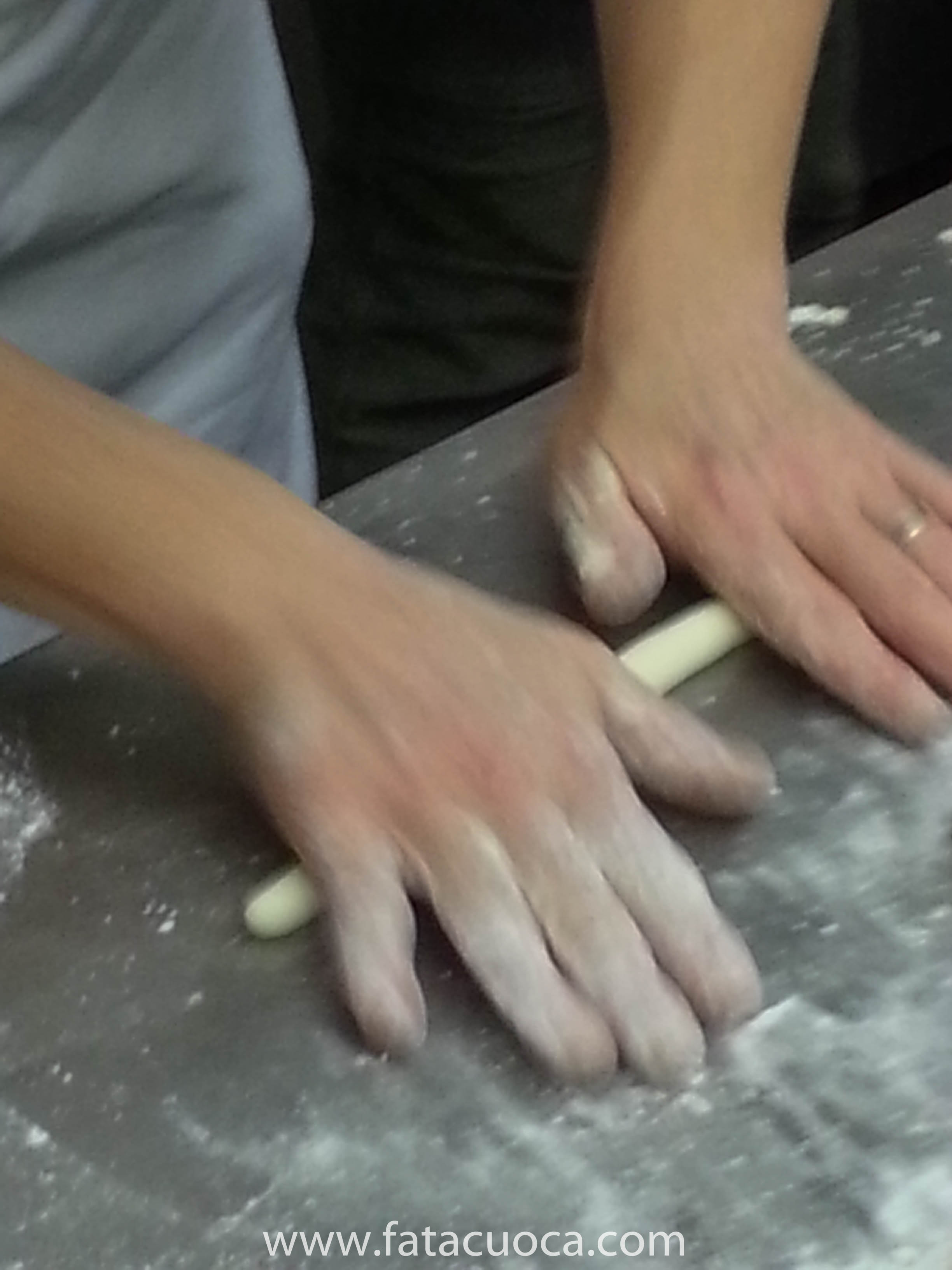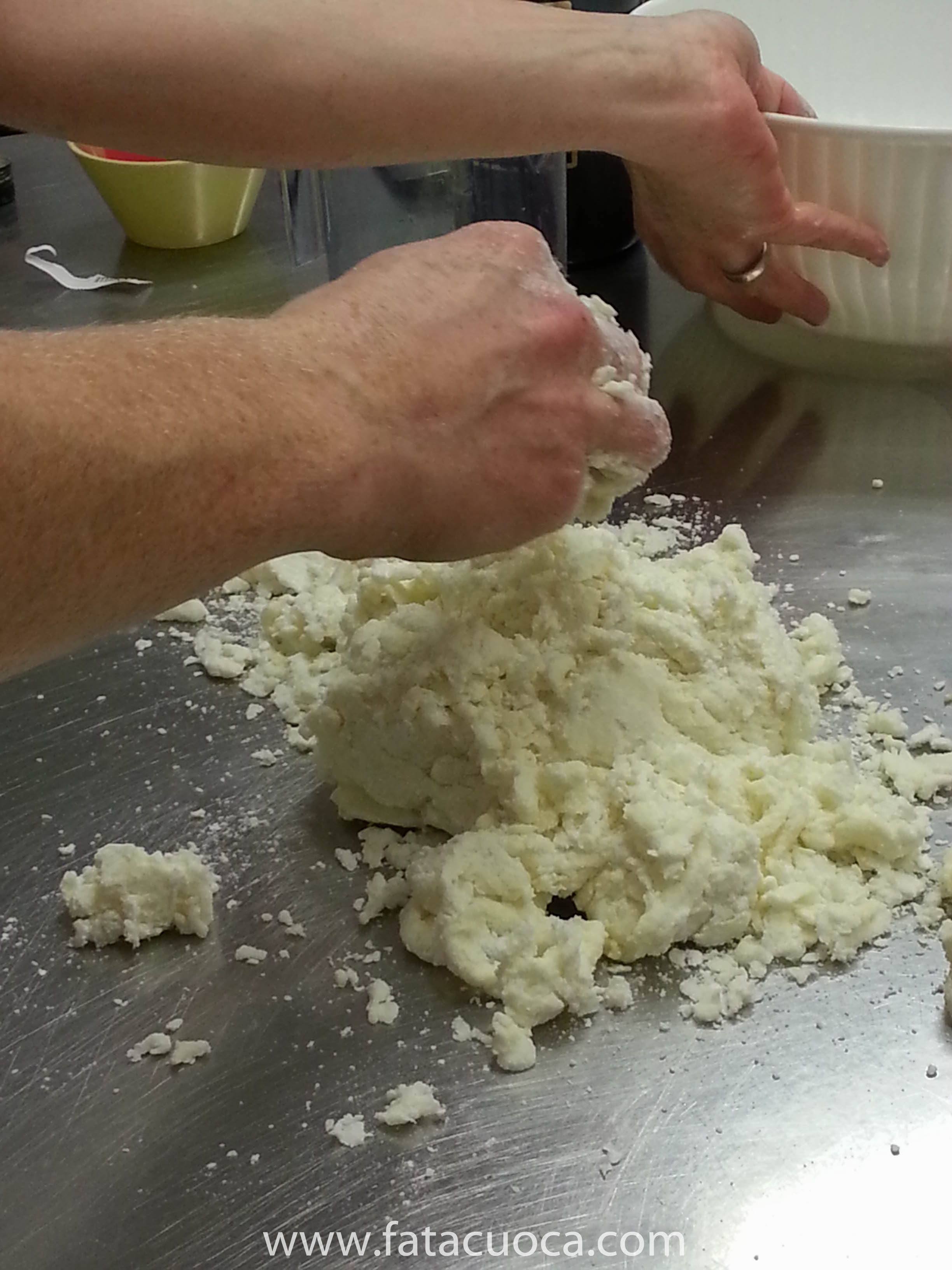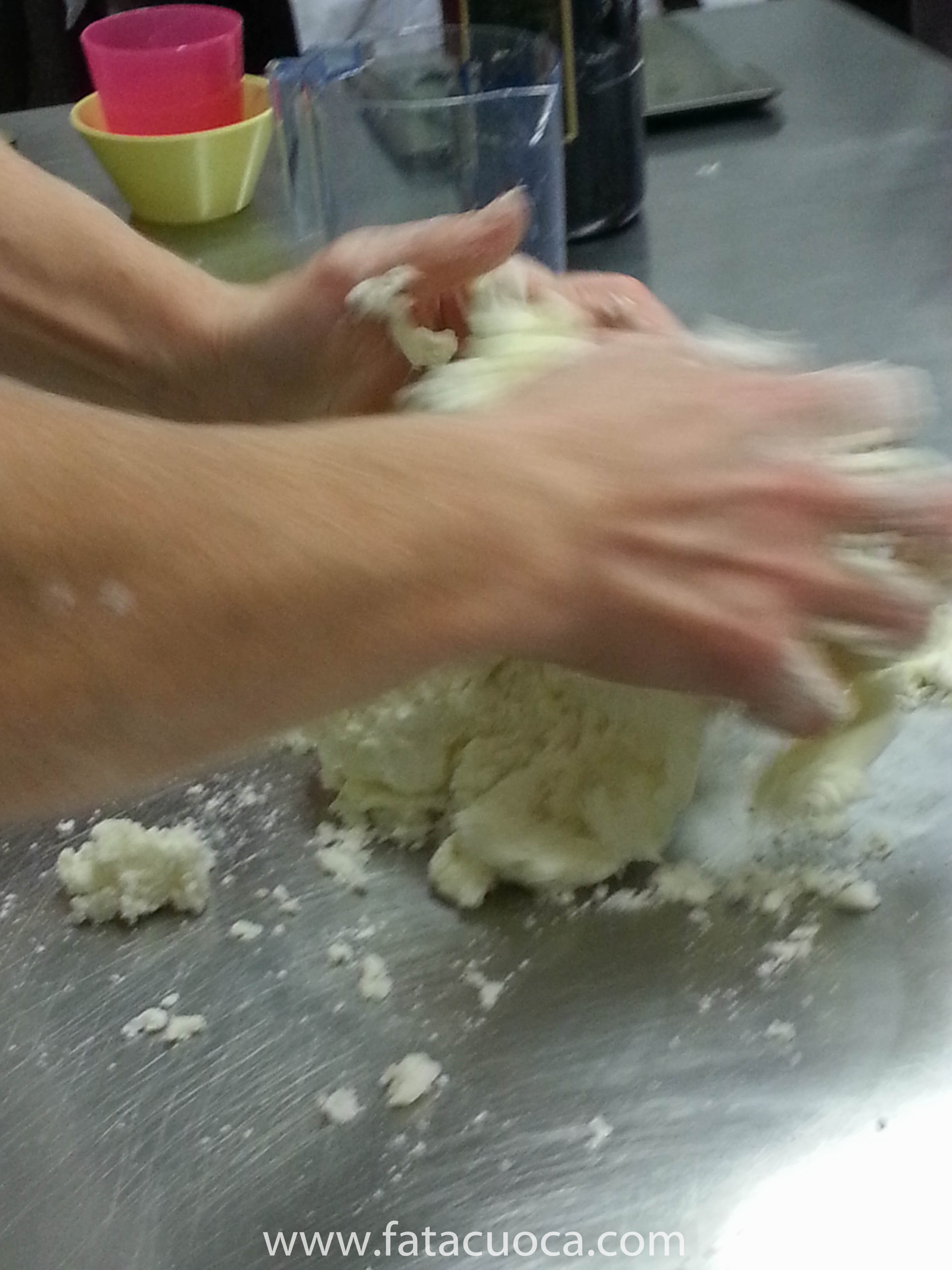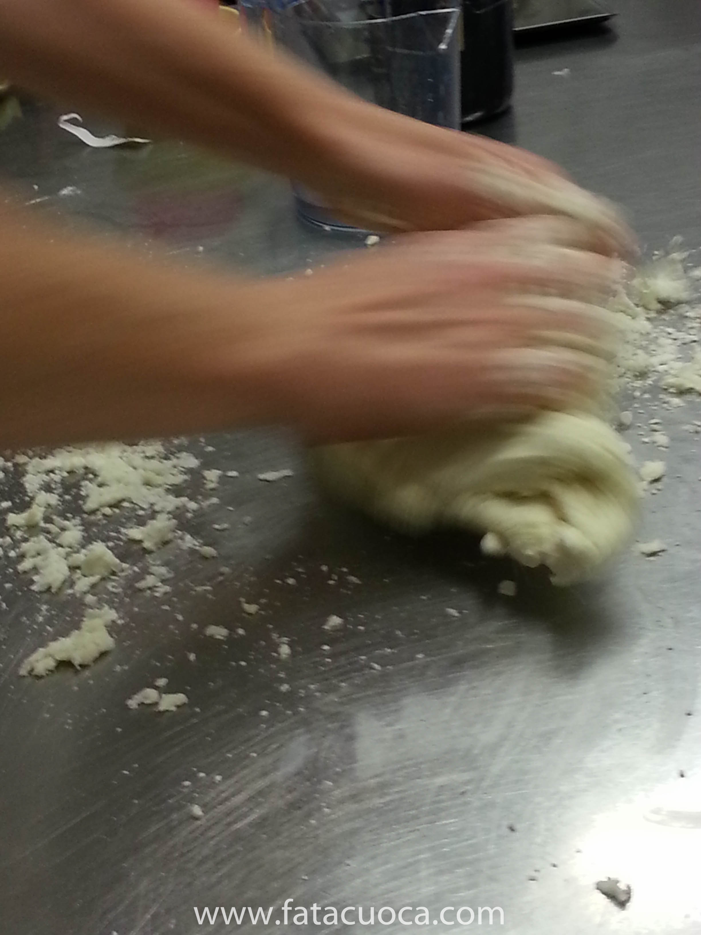 continuare ad impastare fino ad ottenere un impasto compatto che si stacca dalle mani, se è necessario aggiungere un po’ di farina.